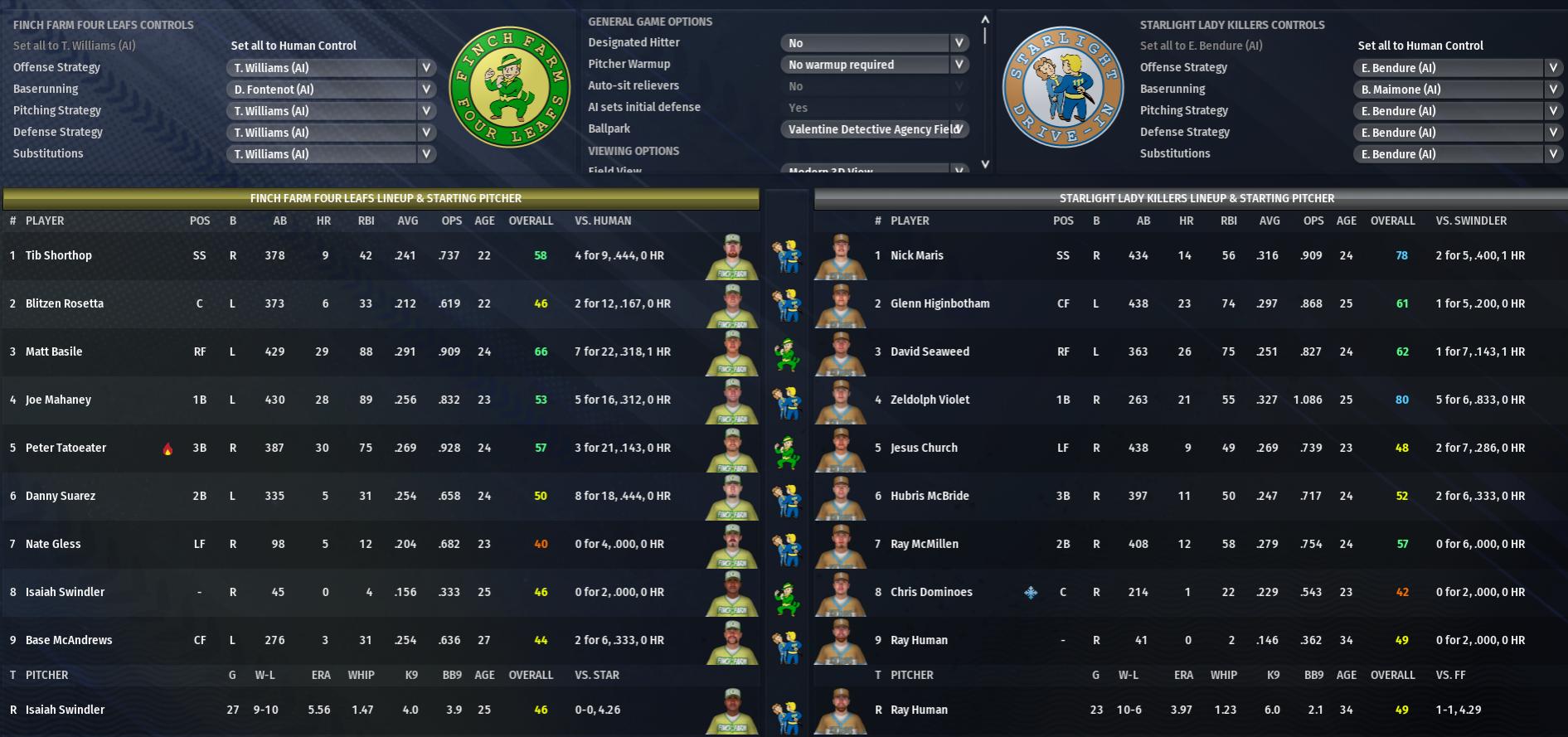 Playoff Tree News and Notes 8/4 - 3B Taygun Topaloglu wins NCA PotW award 8/4 - Quincy RF Baywatch Fischler wins top player for week 8/4 - Nordhagen Beach remains #1, Jamaica Plain jumps to #2 8/6 - Elimination season in full go, Warwick out 8/6 - Fort Hagen owner Isabel Cruz looking to invest in Concord to Glowing Sea rail line, looking to preserve West Charles Bank CBO teams 8/7 - Draft pool revealed, MacDonald of BYDL's Circle expected top pick 8/7 - Egret eliminated from playoff consideration 8/8 - County Crossing gets bad news, SS Cy Thompson's season done 8/9 - Salem, The Slog, Abernathy first NCA teams eliminated from playoffs 8/10 - Nordhagen Beach becomes first CBO to punch its ticket 8/11 - Easy Town's Samuels top player this week 8/11 - UP's 3B Ryan Morris wins SCA weekly award 8/11 - Fort Hagen takes over top spot in Power Rankings, Boys to #2 8/11 - Egret's owner Ron Staples announces that Ninjas for sale 8/13 - Salem's Proper Lighthouse shown door after poor showing 8/16 - Silver Shroud joins Nordhagen Beach for NCA playoffs 8/17 - Corvega seeking to expand advertising, begins construction of HR Car display at Corvega Stadium 8/18 - Fort Hagen's 3B Gatekeeper wins Player of the Week 8/18 - RF Joe Rathmann of the Yao Guai takes top player in SCA 8/18 - Fort Hagen remains #1, Diamond City moves to #2 in Power Rankings 8/18 - Shroud clinch Institute League 8/20 - Nordhagen Beach official winners of the Brotherhood League, Diamond City punches ticket 8/22 - Lexington ends Fort Hagen's season-long 13-game winning streak 8/23 - Jamaica Plain, Roxbury become next teams in SCA to clinch playoff spot 8/25 - Starlight's Zeldolph Violet takes weekly award 8/25 - SCA's PotW is LF Damani Beebe of the Rockets 8/25 - Diamond City overtakes Fort Hagen for top seed in Power Rankings 8/25 - University Point becomes fourth SCA team in playoffs, just one spot remains 8/25 - Salem follows manager firing, fire GM Bill Cluff 8/25 - Nate Howard looking to switch up BMU affiliations, follow GBRL model 8/26 - Big blow as Nordhagen Beach loses star Fogcrawler for season, finishes .299/32/81 8/27 - Atom wraps up SCA playoff pool, Swatters clinch Railroad League crown 8/28 - County Crossing, Finch Farm both clinch wildcard spots 8/30 - Lexington done, Starlight-Sunshine Tidings in final battle for 2nd place in Institute League 9/1 - Bloodbugs' Taygun Topaloglu takes final Player of the Week award 9/1 - Goodneighbor's Danny Honeycutt takes SCA award 9/1 - Starlight's 1B Violet top hitter in August 9/1 - Damani Beebe is August Batter of the Month in SCA 9/1 - Chemist's SP Bill Sarnacki takes monthly pitcher award 9/1 - X10-44 Mannson of Diamond City is August top pitcher 9/1 - Ghouls' rookie Stu Gains #1 in NCA 9/1 - Rad Sox's SS Purple Gupta takes top rookie award in August 9/1 - Fort Hagen, Nordhagen Beach finish 2302 Power Rankings at top 9/1 - Jamaica Plain claims Minutemen League crown 9/1 - Starlight tops Chemists, clinch final playoff spot, 4th seed 9/1 - Finch Farm's CF Kurt Kilgore forced to miss game for suspicious illness 9/1 - County Crossing sucks Four Leafs dry, clinches 3rd seed, FF to #5 Draft Pool Top 10 The early favorites to be high picks are the following: 1. Stormin Normin MacDonald, 18 year-old SS 2. Pipewrench Mathis, 17 year-old SS 3. Beckett Quantum, 19 year-old CF 4. Justin Stagg, 19 year-old 3B 5. Ryan Downing, 16 year-old RHP 6. Emerald Sapphire, 17 year-old 2B 7. Quay Tolsite, 20 year-old 1B 8. Cassie Cryar, 19 year-old RHP 9. Madboy Conteh, 17 year-old C 10. Mesquite Williams, 17 year-old RHP Playoff Previews Finch Farm (5) vs Starlight (4) Atom (5) vs University Point (4)