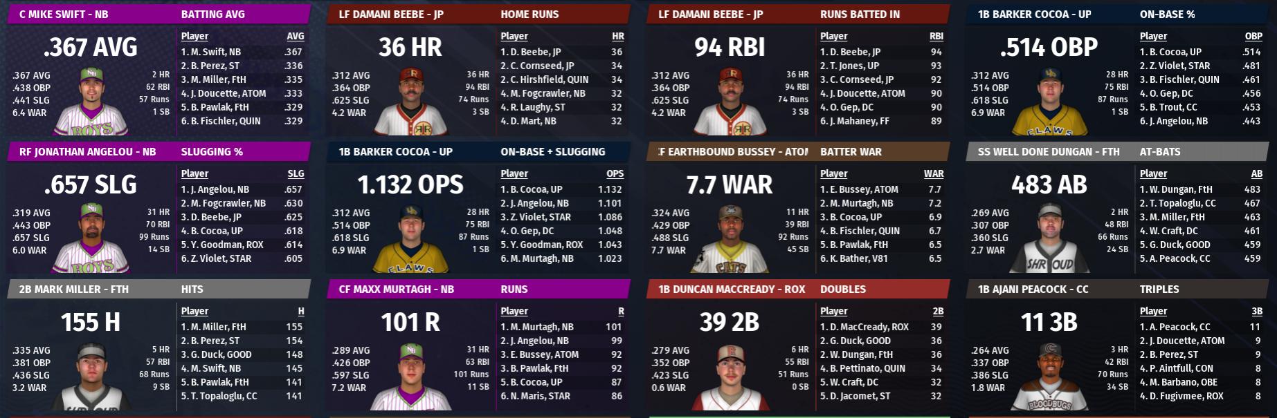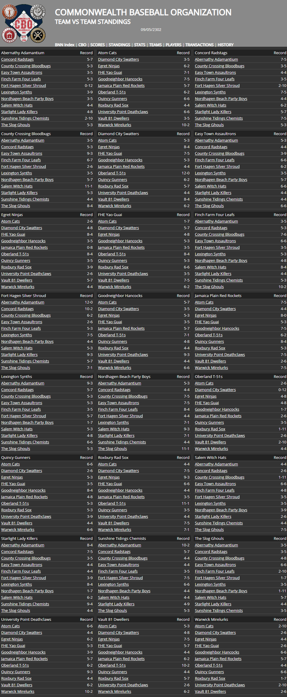 Top Performers - Individual Game BATTERS SS Earthbound Bussey, Atom vs Goodneighbor, 18 May, 4/4, 2 2B, 2 HR, BB, 3 R, 8 RBI PITCHERS SP Curt Redcoats, Sunshine Tidings vs Lexington, 16 May, 9 IP, 0 H, 0 ER, 2 BB, 3 K Records INDIVIDUAL - GAME CF Kurt Kilgore, Egret, 4 doubles INDIVIDUAL - SEASON 1B Barker Cocoa, University Point, 140 walks; Previous Record - Barker Cocoa, University Point, 118 walks, 2301 Tied - CL Matt Breakball, Nordhagen Beach, 37 saves; Previous Record - Josh Samm, Diamond City, 37 saves, 2299 and Aaron Geneva, Easy Town, 37 saves, 2298 Tied - RP Eric Sleeping, Oberland, 58 appearances; Previous Record - Josh Samm, Diamond City, 58 appearances, 2299 SP Beachboy Nut, Nordhagen Beach, 8.09 Pitcher WAR; Previous Record - Beachboy Nut, Nordhagen Beach, 8.01 Pitcher WAR, 2301 Team vs Team Stats