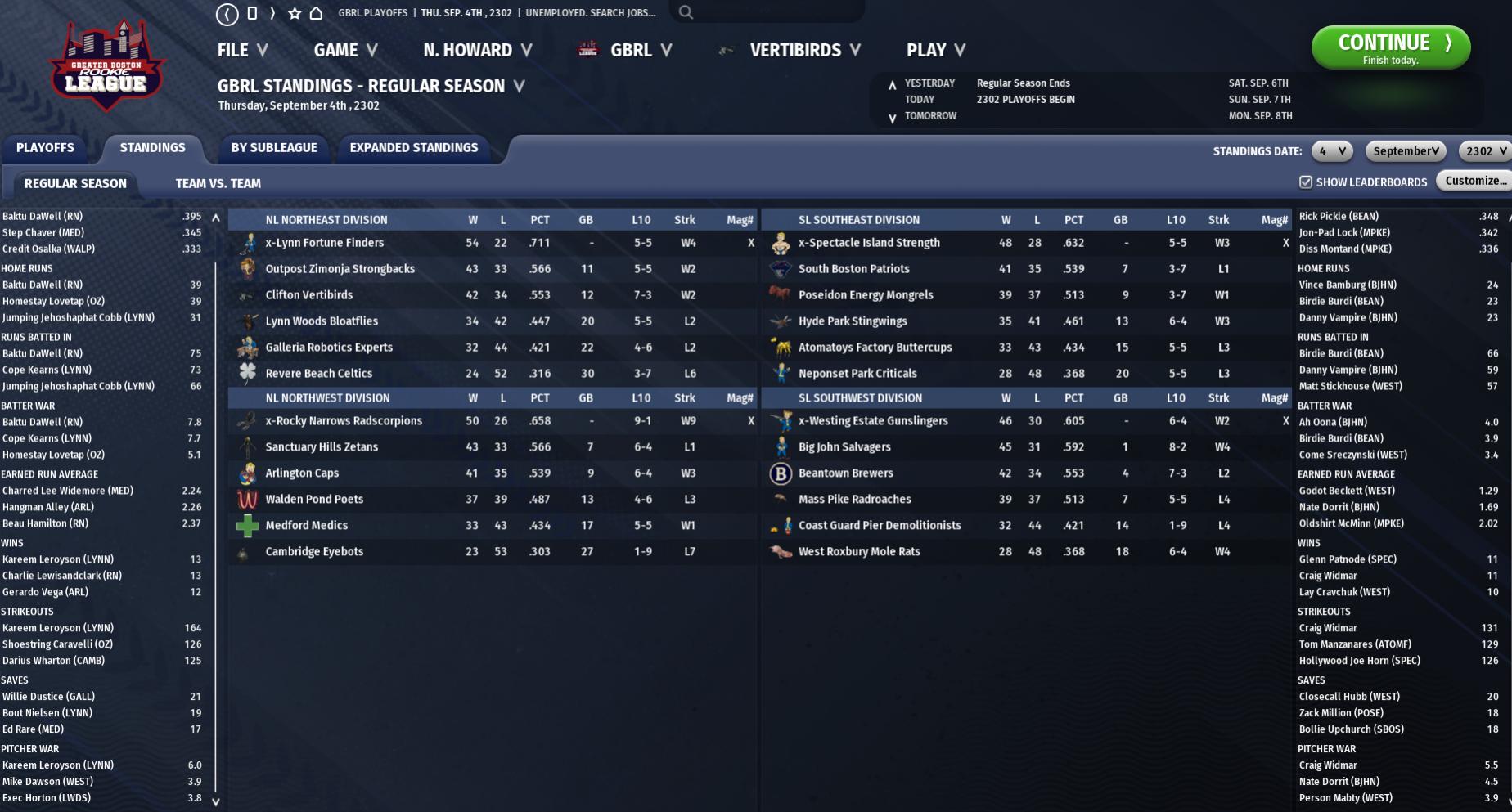CA Dark Hollow Pond League leader - Nahant Shoremen (35-23, Magic # 16) - 3 games ahead of Taffington Boathouse Spy Hunters and Malden Grognaks CA Cambridge League leader - Corvega Flamers (41-17, Magic # 14) - 5 games ahead of Union Hope Lifegivers MA Downtown League leader - Haymarket Mall Commanders (45-13, Magic # 12) - 7 games ahead of Cabot House Triggermen MA Glowing Sea League leader - Fiddler's Green T-60s and Forest Grove Pugilists (32-26, Magic # 19) - 2 games ahead of Eastlake Aquaboys Top Players in June 2B Signal Frummy, Nahant 1B Tony Caps, Eastlake SP Starting Ordone, Nahant SP Justin Mire, Boston Common GBRL NL Northeast Division - Lynn Fortune Finders (42-16, Magic # 10) - 9 games ahead of Clifton Vertibirds NL Northwestern Division - Rocky Narrows Radscorpions (38-20, Magic # 14) - 5 games ahead of Sanctuary Hills Zetans SL Southeast Division - Spectacle Island Strength (37-21, Magic # 15) - 4 games ahead of Poseidon Energy Mongrels and South Boston Patriots SL Southwest Division - Westing Estate Gunslingers (37-21, Magic # 14) - 5 games ahead of Mass Pike Radroaches and Big John Salvagers Top Players in June RF Baktu DaWell, Rocky Narrows RF Orcin Cardinal, Poseidon Energy SP Gerardo Vega, Arlington SP Person Mabty, Westing Estate BYDL NR MVP - CF Admiral Kelm, Lynn Pier; Runner-up - 3B Plain Morris, Concord-Lexington SR MVP - 1B Syd Thriftstore, State House; Runner-up - SS Root Beer, South Beach NR Pitcher of the Year - SP Flirt Perez, Pleasant; Runner-up - SP Matt Gatekeeper, Green Future SR Pitcher of the Year - SP Robot Perez, Castle; Runner-up - SP Tey How, West Quincy Playoff Tree CCYL MVP - LF Zaire Inquisitor, Nauset Beach; Runner-up - 1B Frenchie French, Provincetown Pitcher of the Year - SP Paddy Donut, Eastham; Runner-up - SP Tan Divo, Eastham PJPL MVP - LF/SP Steven Themet, Woodlawn; Runner-up - 1B Glenn Stackstat, Hope Pitcher of the Year - SP Vincent Vail, Hope; Runner-up - LF/SP Steven Themet, Woodlawn