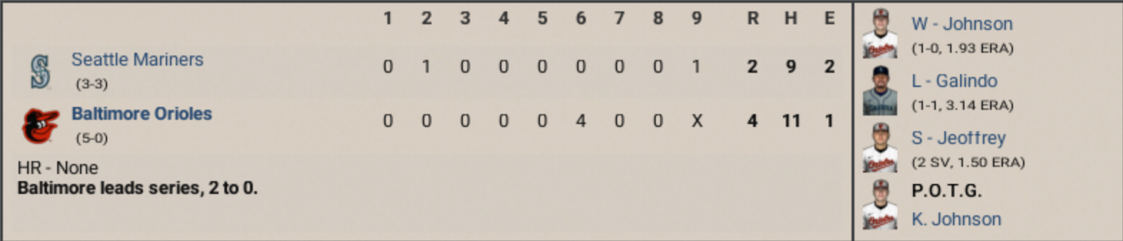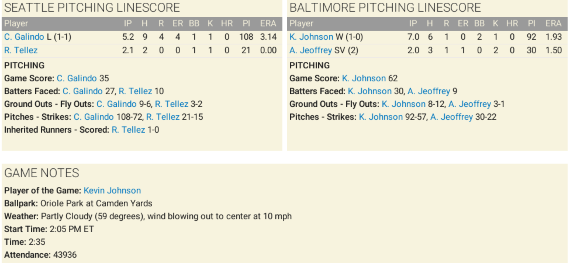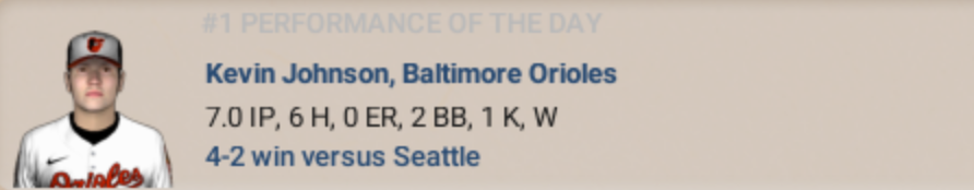 Kevin Johnson... Not the point guard. No. We’re talkin’ the guy on the mound today for Baltimore, who tossed 7 shut-‘em-down innings, gave up only 6 hits, walked a couple, and didn’t blink even once when the Mariners tried to start somethin’.