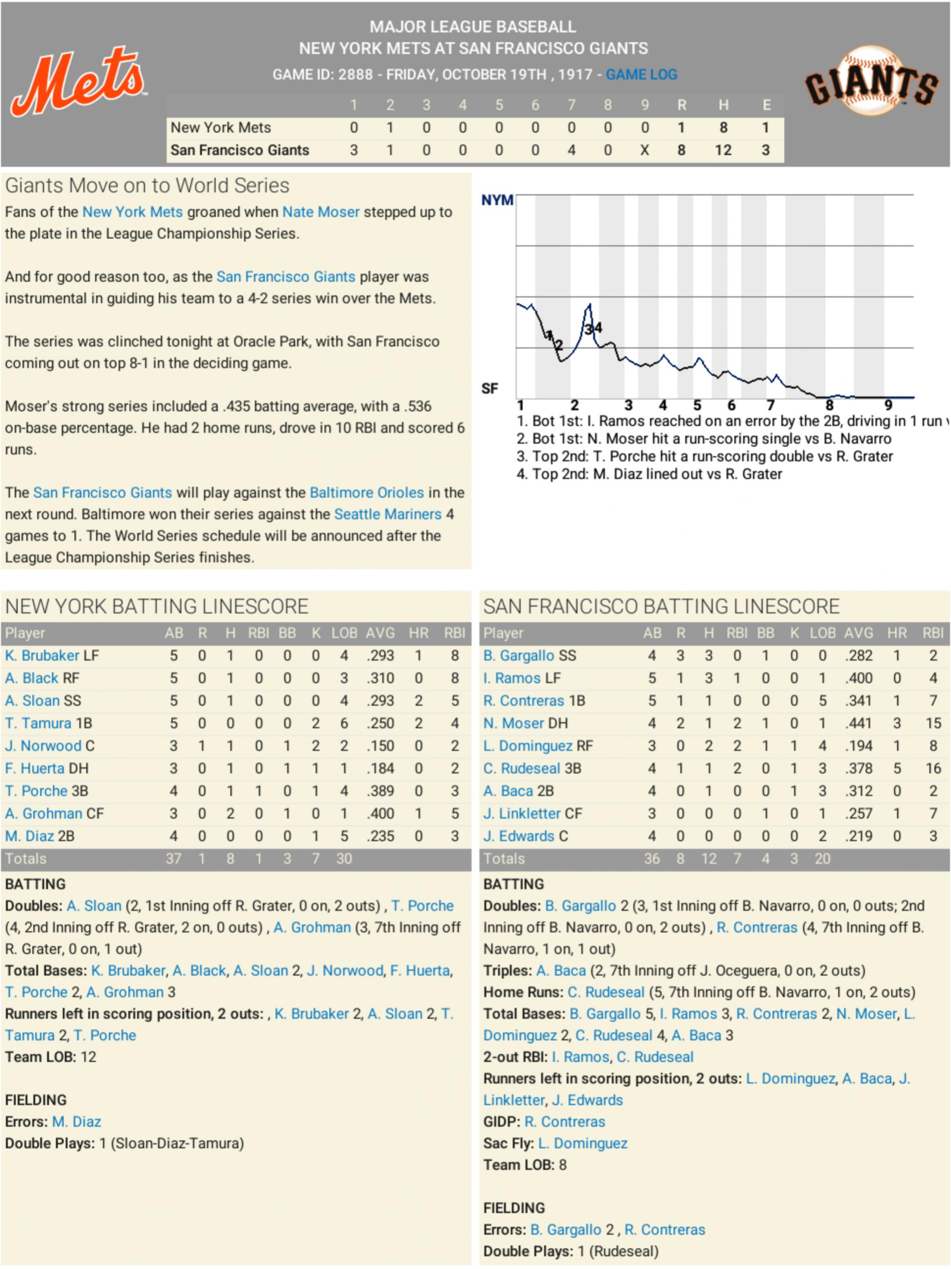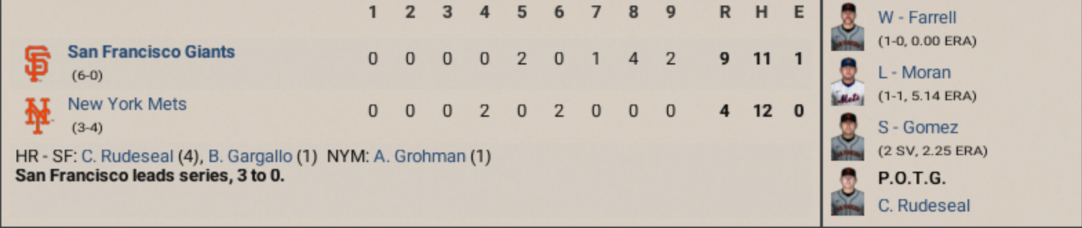 The San Francisco Giants didn’t just beat the Mets in Game 2 of the NLCS. They swarmed them. They outslugged them. And thanks to Moser’s 3-hit, 2-homer, 3-RBI performance, they now hold a commanding 2-0 lead in the series after an 11-4 victory at Oracle Park. And here’s your first “wait, what?” stat of the day: Nate Moser finished with 10 total bases in this game. The entire Mets lineup? Also 10. Ten for Nate. Ten for nine guys in gray uniforms. That’s not a fun coincidence for the visitors — that’s a blinking neon warning sign on the way to Citi Field. Moser Mayhem Now let’s not pretend this was some record-setting performance. It wasn’t. But it was loud. And it was timely. And it was just the latest reminder that the Giants, who’ve now scored 18 runs in two games, might be building something scary in the Bay. The turning point came in the third inning — a five-run explosion that started with a Brandon Gargallo double and peaked when Moser obliterated a Ben Navarro cutter for a two-run homer. Then, in the 6th, Moser doubled. Then, in the 8th, he homered again. Because why not? Nate Moser now has three home runs and nine RBIs in just two games this series. And if you’re wondering whether that’s sustainable? It isn’t. But also: this is October. So it might be. For the Mets… Trouble Brewing Let’s talk about the Mets for a second. Their starting pitcher, Ben Navarro, gave up 11 hits, 9 earned runs, 2 homers, and left with an ERA that now requires scientific notation (11.88). He also walked two and hit absolutely zero bats with deception. Their defense? Clean. Their offense? Sporadic. Their bullpen? Already overworked. Look, this team actually had some bright spots — K. Brubaker tripled in two runs in the 8th, A. Grohman doubled in the 6th — but that’s like finding a flashlight after the roof’s caved in. And just in case you’re keeping score at home, the Mets have now been outscored 18-8, outhit 32-14, and outplayed in just about every category that doesn’t involve foul ball retrieval. The Weird and the Wonderful C.J. Rudeseal homered for the second straight game, giving him 3 HRs and 9 RBIs in the series. He's not just hot — he's sizzling bacon on a car hood in August. R. Grater earned the win with a 6.2-inning effort despite issuing seven walks. That’s the most in a postseason win by a Giants pitcher since… well, ever, because it’s incredibly rare and probably shouldn’t work. But it did! This marks the first time since 1916 — in our wonderfully fictional league, of course — that the Giants have scored double-digit runs in back-to-back playoff games. What’s Next? The series shifts east to Citi Field on Monday. The Mets will be looking for something — anything — to slow down San Francisco’s offense and get back into this thing before it gets away from them completely. Because here's a fact no New Yorker wants to hear: No team has ever come back from an 0-2 hole in the NLCS when it allowed 18+ runs in the first two games. And even if it weren’t true before… it is now. |