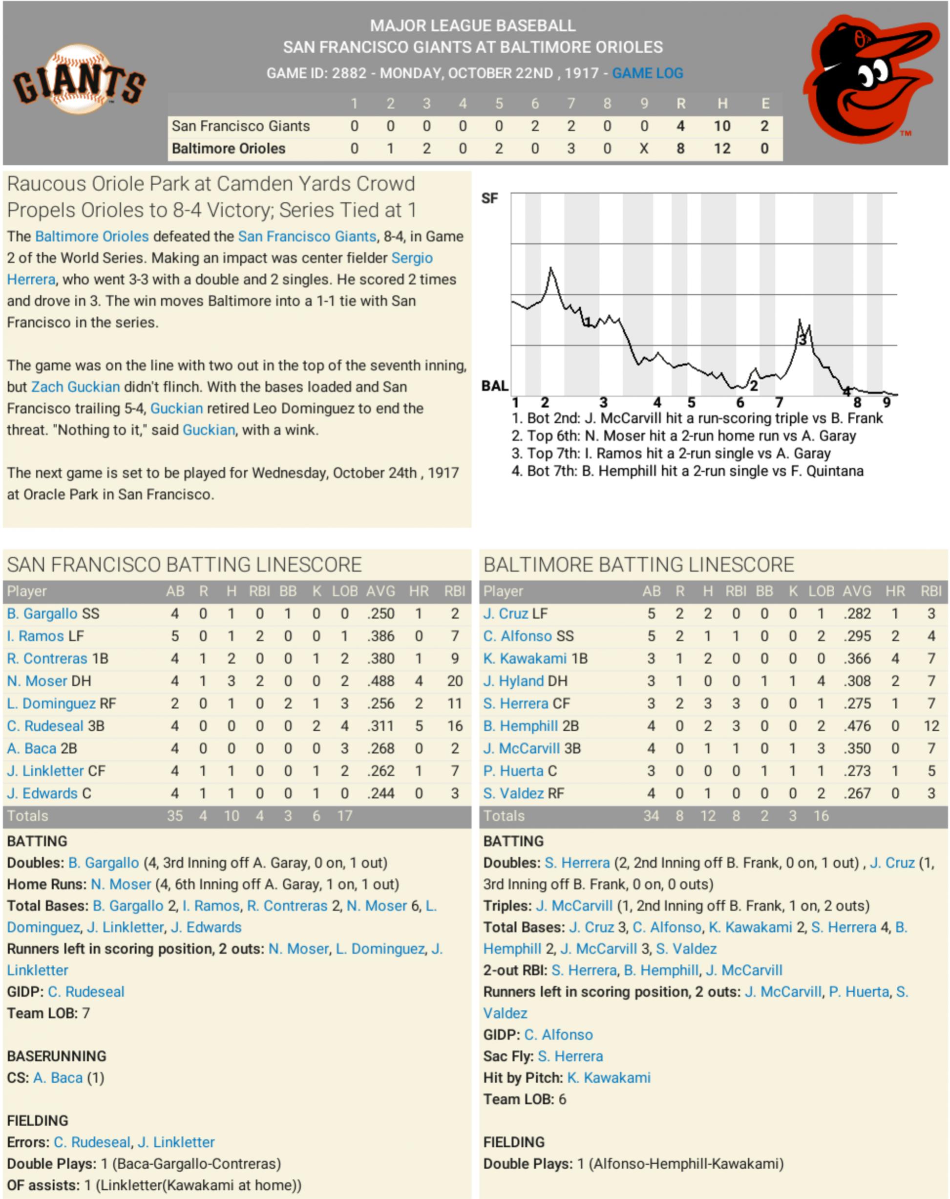 [LOUD BREATHLESS VOICE, BORDERLINE SHOUTING] OHHHHHHHHHH BABY!!!!!!! THE SAN FRANCISCO GIANTS JUST WENT INTO BALTIMORE — CAMDEN YARDS — AND ABSOLUTELY TOOK A BAT TO THE ORIOLES TO START THE WORLD SERIES! I MEAN COME ON! WHAT A PERFORMANCE! THIS WAS AN ASSAULT, FOLKS! AN OLD-SCHOOL, 1917-TYPE, BRING-YOUR-LEAD-GLOVES TYPE OF BEATDOWN! LEO DOMINGUEZ?!? ARE YOU KIDDIN’ ME?! 3-for-5, a BIG FLY in the 4th, 3 RBI — this guy was BOOMIN’ ROCKETS all over the field like he was Ted Williams crossed with Barry Bonds! AND YOU KNOW I DON’T SAY THAT LIGHTLY! CONTRERAS — THE BIG FELLA AT FIRST BASE — 3 HITS! CLUTCH KNOCK WITH THE BASES LOADED IN THE 6TH! You could hear that bat crack from Staten Island to Sausalito!! MOSER — HE’S BEEN UNREAL THIS POSTSEASON! Another 3-hit night! This guy's hittin’ over .460 — are you NUTS?! I haven’t seen production like that since Rogers Hornsby was hittin’ .400 in a wool uniform! AND DON’T EVEN GET ME STARTED ON THE PITCHING, ALRIGHT?! VICENTE LUEVANOS — I DON’T CARE WHAT HIS ERA SAYS! He gave up some knocks, sure, but the guy TOOK THE BALL and KEPT THIS THING IN CHECK until the offense BLEW IT OPEN. NATE GOMEZ shuts the door? That’s what I call a PENNANT TEAM! AND YOU KNOW WHAT?! BALTIMORE TRIED! I GIVE ‘EM CREDIT! HYLAND? BOMBS AWAY! HERRERA? BIG HOMER! BUT THEY HAD NO CHANCE! NO CHANCE! THE GIANTS JUST OVERWHELMED 'EM! THEY HIT. THEY RAN. THEY TURNED DOUBLE PLAYS. AND THEY TOOK GAME ONE RIGHT OUTTA THE GATE. I’M TELLIN’ YA RIGHT NOW, FOLKS — THIS GIANTS TEAM IS SPECIAL! BACK-TO-BACK PENNANTS, NOW WORLD SERIES GAME 1 — THEY ARE NOT MESSIN’ AROUND! FINAL SCORE? SAN FRANCISCO NINE. BALTIMORE FIVE. GIANTS UP 1-0. DOMINGUEZ THE STAR. CONTRERAS CLUTCH. MOSER STILL COOKIN’. TAKE A LAP, BALTIMORE. THE WEST COAST MEANS BUSINESS. DOG OUT. HIT THE MUSIC!!! 🎙️🔊📻💥⚾🔥 |