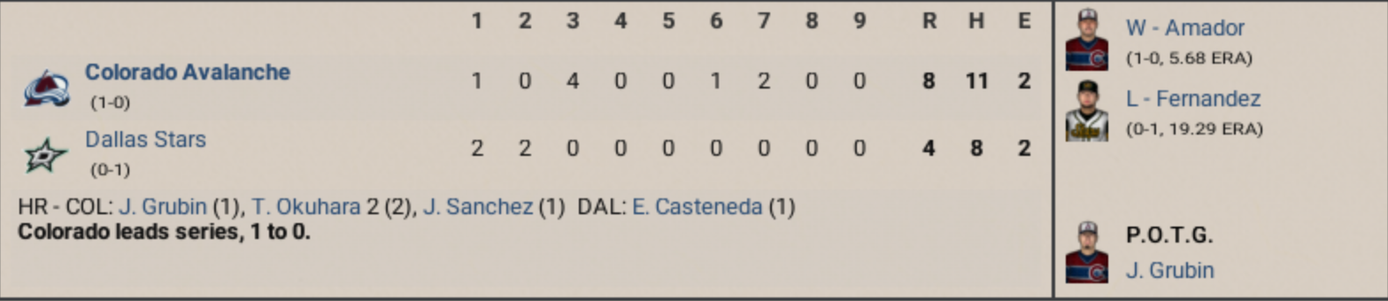 Two teams took the field for a playoff delight. The Avalanche came with their bats held up high, While the Stars tried to dazzle and reach for the sky. At the American Airlines, the crowd gave a cheer, As Grubin stepped up, full of playoff-time fear? Oh no, not a bit! He was ready to roll— With a home run so loud, it could rattle your soul! He cracked one in the first, then a double with flair, Two singles came later—he was everywhere! With four hits, two runs, and two ribbies as well, Jeff Grubin, that day, was the bat-swinging spell. They scored in the first, and then in the third, Four runs! The dugout was dancing, I heard. Okuhara? Two homers! He swung with such grace, That ball soared so far, it escaped outer space! MacKinnon stole bags—why, he zoomed like a jet! And Makar hit a double that fans won’t forget. Sanchez? He joined with a homer of might, And the Dallas crowd groaned, “This just isn’t right!” The Stars had their moment, they battled quite bold, With Casteneda’s homer, a story retold. But the runs dried up, and their hopes took a dip, As Colorado’s bullpen tightened the grip. From Rodriguez to Ochoa, the pitchers were slick, They threw with precision, and threw it in quick. While Amador pitched in with six innings stout, The Avalanche held firm and shut the Stars out. Eight runs, eleven hits, two errors, that’s true, The Avalanche left with the win—whoop-de-doo! Now Game Two is coming, the Stars seek revenge, But they’ll need to regroup and sharpen their edge. So if you’re a fan of the puck or the bat, Just tip your big hat to the team with the stat: For Game One was won by a team from the snow, And Dallas now trails the series one–oh! |
