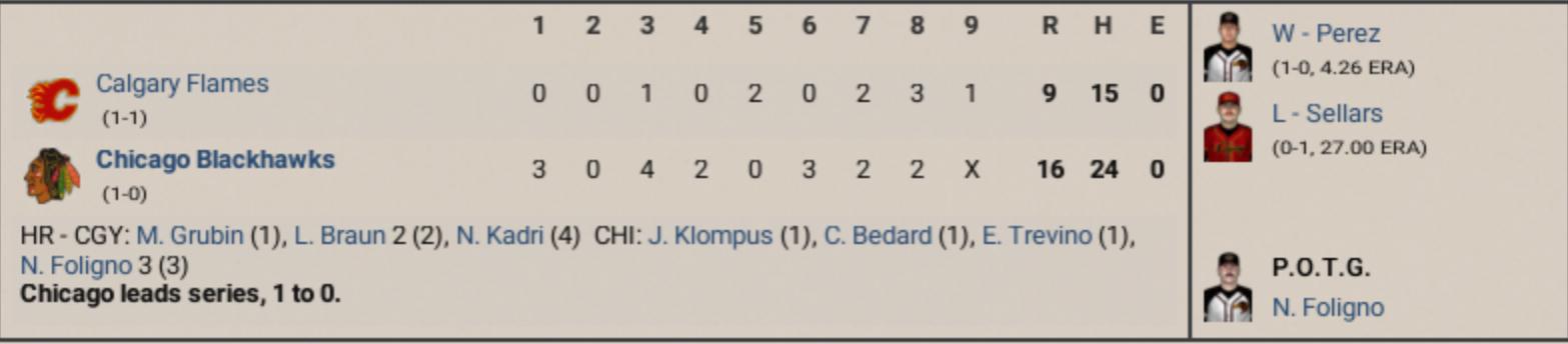Seven bloody hells, what a mess of a game that was. Chicago put the boots to Calgary, sixteen to nine, and it wasn’t even that close. Blackhawks came out swinging like they’d been promised gold at the end of it, and Nick Foligno? That bastard swung the bat like he had a personal grudge against the ball. Three home runs. Eight runs driven in. Four times crossing the plate like it was his own damned castle. Man’s a one-man siege tower.