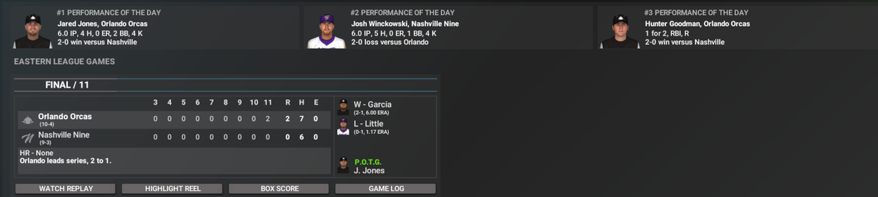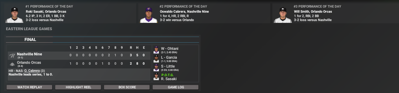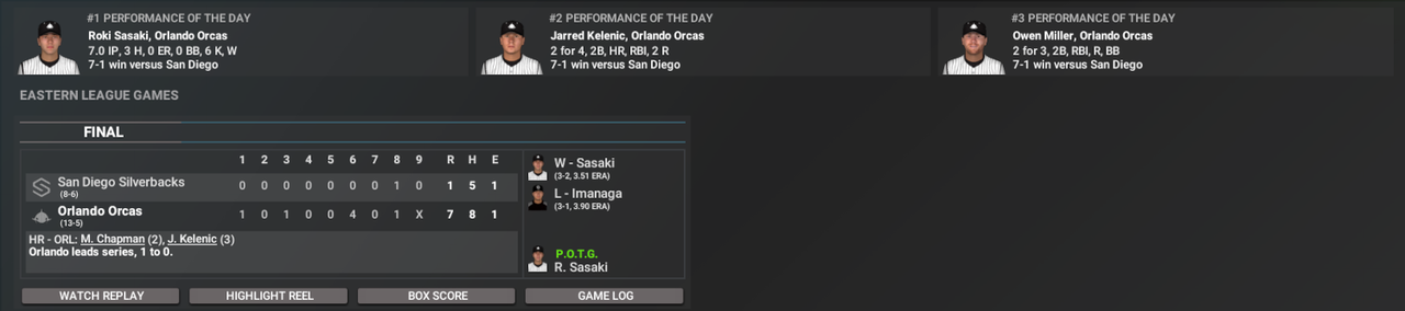 ----------------------------------------------------- [1] R. Sasaki - 14.2 [2] D. Rasmussen MOT - 11.6 [3] B. Brown MON - 11.1 [4] Y. Yamamoto MIA - 10.3 [5] J. Soriano MON - 10.3 [6] S. Schwellenbach JAX - 9.9 [7] M. Fried HAV - 9.0 [8] M. Grove DCD - 8.6 |