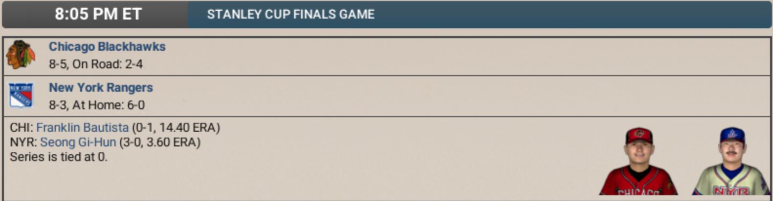 “Now… you couldn’t have scripted it any better. The New York Rangers… 156 and 6. Let me say that again — 156 wins, six losses. Against the Chicago Blackhawks… 142 and 20. This is as good as it gets. This is a rematch of the ’01 Finals… the one the Rangers still feel they should’ve won. They didn’t… Chicago stole that one, got their only championship. And the Rangers? Well… they’ve got ten. They’re looking for number eleven.” “Let’s go through it… 1985, ’86, ’87, ’88, ’89… five straight Cups. Then ’91, ’92, ’95, ’98, and last year in ’02. That’s dominance, folks. That’s the Yankees in the 90s, that’s the Celtics in the 60s — that’s what we’re talking about here.” “Now, the numbers… the home run totals from the Rangers’ nine starters — 112, 83, 117, 125, 126, 122, 104, 64, 55. It’s absurd. It’s laughable. That’s production you don’t see — not in this league, not anywhere. The Blackhawks? Still very strong — 116, 112, 117, 106, 34, 16, 25, 34, 62. Those are great numbers… for anyone else. But when you stack ‘em up? They just can’t match New York, top to bottom.” “Pitching’s about the same, except for one guy — and you know who I’m talkin’ about. Seong Gi-Hun. The ace. 32-and-0, 0.96 ERA, 454 strikeouts. Those aren’t baseball numbers, those are a kid playing a video game with the difficulty turned all the way down.” “So here’s how I see it — Rangers get their revenge for 2001. They repeat as Stanley Cup Champions. And I’ll tell ya right now… I got ‘em in six. Four games to two. That’s the pick.” |