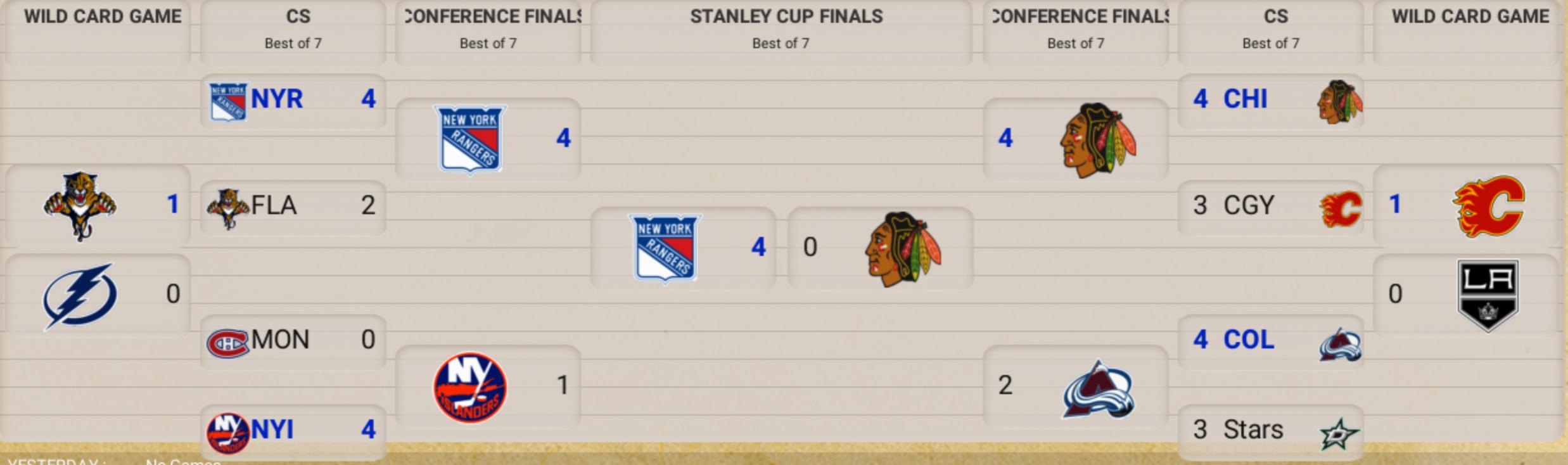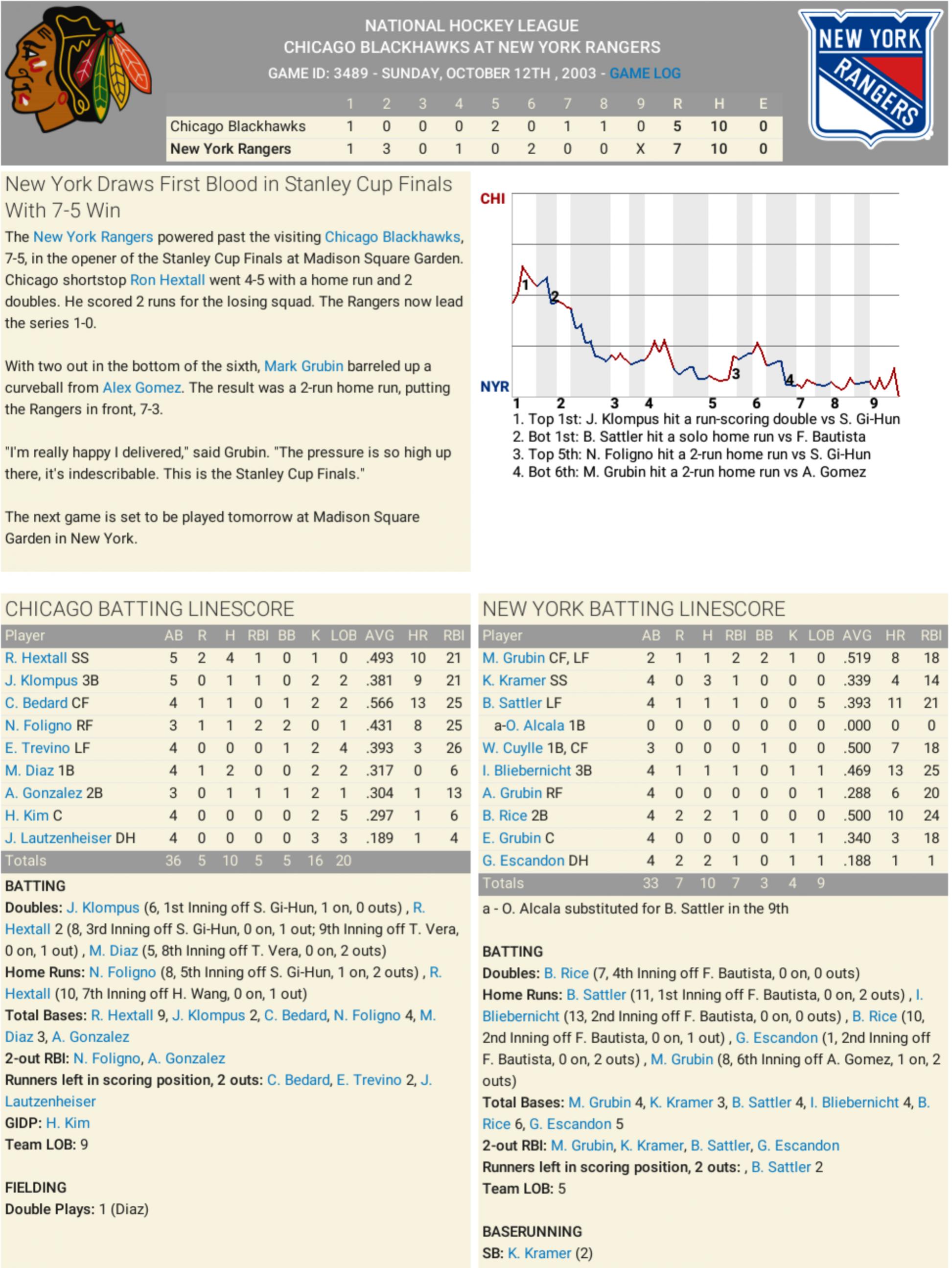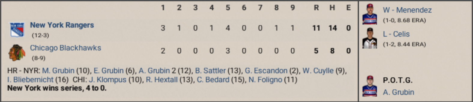1985 1986 1987 1988 1989 1991 1992 1995 1998 2002 2003 Mike (Francesa): “Alright, so here we are, the Rangers take care of business, they sweep the Blackhawks, four straight, eleven championships now for this franchise. You saw it tonight, Dog. Eleven runs. The power, the depth, it’s overwhelming. I mean, Celis didn’t last two innings, the game was over in the first with Cuylle and Bliebernicht going deep back-to-back. You can’t win like that, Dog. You just can’t.” Mad Dog (Russo): “MIKE, MIKE, THIS WAS A TOTAL MISMATCH, MIKE!! A TOTAL—COMPLETE—MISMATCH!! You can’t give up SEVEN home runs in a clincher at home in the Stanley Cup Finals!! SEVEN!! At the UNITED CENTER, MIKE!! ARE YOU KIDDING ME?!” Mike: “They had no pitching, Dog. None. Celis, Gould, Gomez, Gibson… it’s a parade of relievers, every one of them giving up bombs. You look at the Rangers—Sattler, two big swings, Avery Grubin, couple of moonshots, Escandon gets in on it, even E. Grubin. It’s relentless.” Mad Dog: “And then the Blackhawks, they tease ya, Mike! They tease ya! Bottom of the fifth, back-to-back-to-back-to-back homers—Bedard, Klompus, Hextall, Foligno—they hit FOUR in a row!! The place is going crazy, 5-5 game, you’re thinking, ‘Maybe, just maybe, we got ourselves a series here!’ AND THEN BANG! The bullpen blows up, 11-5 final, season over, sweep, Rangers go home with the CUP AGAIN!!” Mike: “They were never in this series. Never. The Rangers won 156 games for a reason. Santiago’s got too much talent, the lineup is historic, Gi-Hun didn’t even have to pitch a clincher. Eleven titles, Dog. That’s a dynasty, that’s the best team we’ve ever seen.” Mad Dog: “THEY DIDN’T EVEN NEED GI-HUN, MIKE!! Think about that!! Think about THAT!! You’ve got a guy 32-and-0, ERA under one, and he’s sittin’ there in the dugout eating sunflower seeds while they’re hitting SEVEN home runs to win the Stanley Cup!! I mean my goodness gracious!!” Mike: “Rangers in four. End of story.” Mad Dog: “END OF STORY!!” |