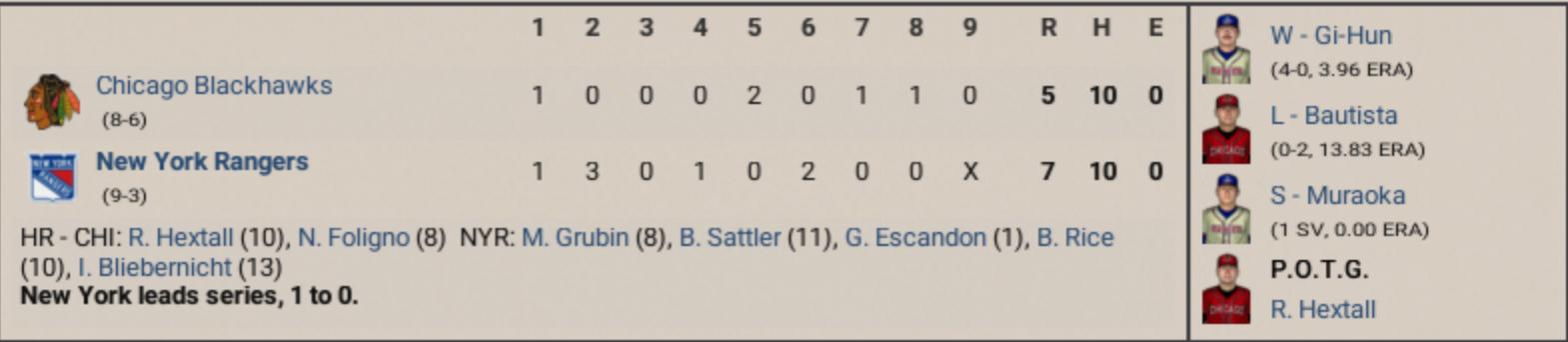 Now, lemme tell ya somethin’. This game was nuts. The Rangers come out, first inning, boom — B. Sattler, gone, solo shot. Then they stack three homers in the second — Bliebernicht, Rice, Escandon. Back-to-back-to-back? No! But close enough. It’s 5–1, the Garden’s rockin’, you think, “This one’s over.” WRONG. Chicago hangs around. Ron Hextall — ARE YOU KIDDING ME?! The guy’s a shortstop hitting .493 in the playoffs, four hits tonight, two doubles, a bomb. I don’t care if you’re from Chicago or Kalamazoo — you tip your cap. But it’s the sixth inning, two outs, Rangers up 5–3, Alex Gomez tries to sneak a curve past Mark Grubin — HA! Forget it. Upper deck, two-run shot, 7–3, ballgame. That’s the dagger. Now, the pitching? Eh… S. Gi-Hun gets the win, but 108 pitches in five innings, 14 strikeouts, sure, but four walks, three runs, and he’s living dangerously all night. H. Wang comes in — gives up the bomb to Hextall. T. Vera? Traffic all over the bases. They’re playin’ with fire, I’m tellin’ ya. But the bottom line is this — it’s the Finals, you’re up 1–0, you protected home ice, and you’re a step closer to the Cup. You clean up the bullpen tomorrow, you tighten the screws, but you gotta be happy you got this one in the bank. Game 2? Tomorrow night. Same building. You take THAT one, and now you’re lookin’ at a stranglehold, okay? But Chicago? They’re too good — they’re not goin’ quietly. |