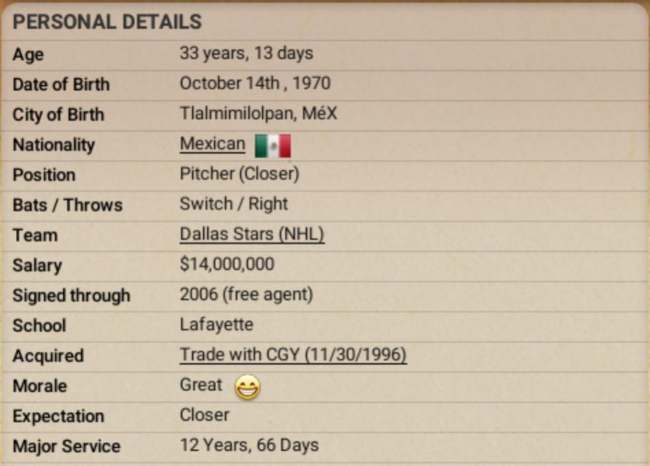 .517 batting average. 99 home runs. 222 RBIs. Guy’s just… crushing it. No luck. Just… Francis being Francis. Unanimous. All 36 votes. Nobody else even close. Kevin Dineen, second place. Didn’t win. Alex Gutierrez, third. Didn’t win. Reginald Kroes. Don’t even worry about it. Player - Team - First Place - Total Points Ron Francis - Hartford Whalers - 36 - 180 Kevin Dineen - Hartford Whalers - 0 - 108 Alex Gutierrez - Ottawa Senators - 0 - 29 Reginald Kroes - Columbus Blue Jackets - 0 - 7 Yeah. Francis. Rookie of the Year. That’s right. (pause) I’ll probably paint my face for the ceremony. Just sit there, clap once. Maybe do the devil horns. Gotta support the guy. |