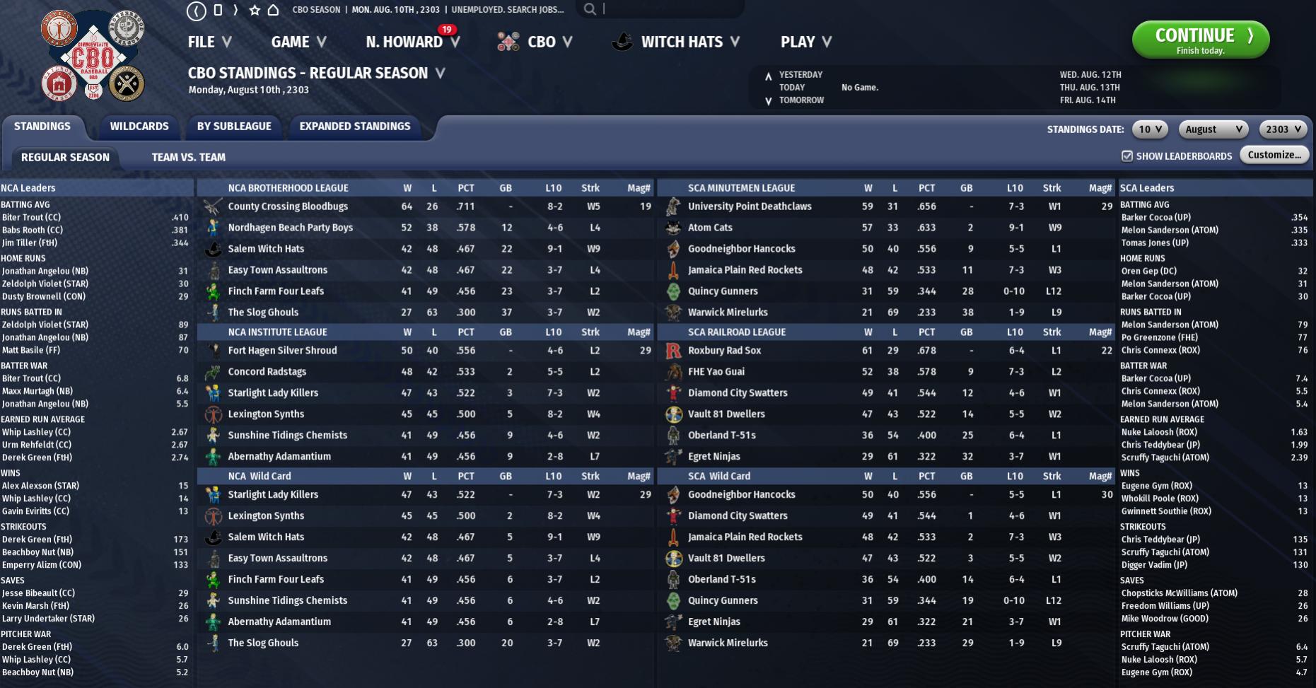 BNN Weekly Report This Week in the CBO, BMU, and GBRL by Nat Wright-Kawolski 10 August 2303 Feature Story: Major League Streaks We have now hit the 75% mark of the new 120-game schedule with 90 games completed. At this point of the season, teams are making their final moves up and down the standings. With that stated, there are currently four teams with an active streak of nine games or more, with one more team in a seven-game streak. Let's look at those five teams and see what it will mean in the playoff push for August and September. Wins: Atom and Salem These two teams do not seem to be like the other since one team is currently in the thick of the playoff race (Atom), while the other is still five games out (Salem). Still, both currently have a nine-game winning streak heading into an important part of the schedule. The Cats' streak has not allowed them to pass up University Point for the Minutemen League lead, but they have made strides in getting there. Atom has now moved up to #2 in the Power Rankings. Atom is the third-best team in the SCA record-wise but trail the Deathclaws by two games and Roxbury by four. That means that the Cats are in contention for the #1 seed in the playoffs and can be considered to have a decent shot to win it all. With a great offense (2nd in runs scored in the SCA) and a good starting rotation (4th in Starters ERA), led by LF Melon Sanderson (.335/31/79) and SP Scruffy Taguchi (10-3, 2.39 ERA), Atom is in almost every game. Salem's current streak seems to be a combination of getting hot while playing some of the noncompetitors in the NCA playoff race. Still six games under .500, the Witch Hats have disposed of Abernathy, The Slog, Sunshine Tidings, and Easy Town in the last two weeks. Other than the Ghouls, the Hats' streak has also catapulted them above each of those other three teams in the NCA standings. However, Salem is still five games back of the current 5th seed in the playoff race, Starlight. The offense's ability to score has been a mysterious one with the offense ranking in the bottom half of all categories except scoring, where they are 4th. SS Swift Hendrix (.279/11/38) has looked to be their best player overall. Pitching has not been good all season, but SP Aimer Doghair (11-4, 3.34) has been a welcome site. Closer Justin Wilkerson (16 SV, 0.00 ERA) has yet to give up a run he is responsible for in 2023 in 37 appearances. Losses: Abernathy, Quincy, Warwick All three teams on a losing streak, the Adamantium (7 games), the Gunners (12 games!), and the Mirelurks (9 games) can be considered to be out of the playoff race entirely. Abernathy could get back in it, but it seems obvious that they are likely to finish in the bottom half of their division and miss out on the playoffs. Quincy can hope to reload for next season, and Warwick's future is already in doubt with the news that their owner, Roger Warwick, will give up ownership of the team this offseason. Analysis County Crossing remains #1 with the CBO's best record at 64-26. They went 8-2 in the last two weeks, sweeping Fort Hagen (#13), winning one of three at Nordhagen Beach (#11), sweeping the Adamantium (#20), and then sweeping the Party Boys at home. We already mentioned Atom moving to #2 because of their nine-game winning streak. They got there by splitting with FHE (#5), sweeping the struggling Gunners, getting the sweep at Diamond City (#12), and then sweeping Quincy at home. Roxbury is #3 after going 6-4 in their last 10. The Rad Sox were swept at Jamaica Plain (#6), won two of three at Vault 81 (#14), swept Warwick (#24), and then won two of three versus Egret (#21). University Point stands as the #4 team with a 7-3 record the past two weeks. The Claws split at the Swatters, won all three at the Mirelurks' home, swept the Dwellers, and then lost two of three at Goodneighbor (#10). FHE completes the Top 5 with a 7-3 record in their last 10. The Yao Guai split at the Cats, swept the Ninjas in Egret, swept the Red Rockets, and then lost two of three against Vault 81. NCA 1. County Crossing 2. Fort Hagen 3. Nordhagen Beach 4. Concord 5. Starlight 6. Lexington 7. Salem 8. Easy Town SCA 1. Roxbury 2. University Point 3. Atom 4. FHE 5. Goodneighbor 6. Diamond City 7. Jamaica Plain 8. Vault 81 Standings Team vs Team Power Rankings Players of the Week NCA 1B Dusty Brownell, Concord - 6/16 (.375), 6 HR, 10 RBI CF Andy Dogleash, Salem - 12/20 (.600), 4 HR, 10 RBI, 7 R SCA 1B Barker Cocoa, University Point - 7/17 (.412), 3 HR, 4 RBI, 7 R RF Deerlord Fugivmee, Roxbury - 9/20 (.450), 2 HR, 8 RBI, 8 R Transactions Sunday, August 9th , 2303 Roxbury Rad Sox: Released RP John Baty. Saturday, August 8th , 2303 Nordhagen Beach Party Boys: Placed LF Michael Fogcrawler on the 7-day injured list, retroactive to 08/07/2303. Friday, August 7th , 2303 Jamaica Plain Red Rockets: Activated CF Science Brennan from the injured list. Jamaica Plain Red Rockets: Released RF Do-Good Wilkerson. Thursday, August 6th , 2303 Starlight Lady Killers: Signed free agent LF Portfolio Michel to a minor league contract. Wednesday, August 5th , 2303 County Crossing Bloodbugs: Released RP Danny Callan. Tuesday, August 4th , 2303 Warwick Mirelurks: Placed SP Thorn McCormick on the 7-day injured list, retroactive to 08/03/2303. University Point Deathclaws: Released RP Edward Mars. Jamaica Plain Red Rockets: Activated SS Aaron Erickson from the injured list. Jamaica Plain Red Rockets: Sent SS Aaron Erickson to Triple A Somerville Place for injury rehab. Jamaica Plain Red Rockets: Released SS Channel Dowson. Finch Farm Four Leafs: Signed free agent RP Erik Wipf to a minor league contract. Nordhagen Beach Party Boys: Signed free agent CF Mighty Dward to a minor league contract. County Crossing Bloodbugs: Signed free agent 2B Channel Dowson to a minor league contract. Monday, August 3rd , 2303 Vault 81 Dwellers: Signed free agent CF Tom Starcontrol to a minor league contract. Vault 81 Dwellers: Signed free agent RP Steve Slocums to