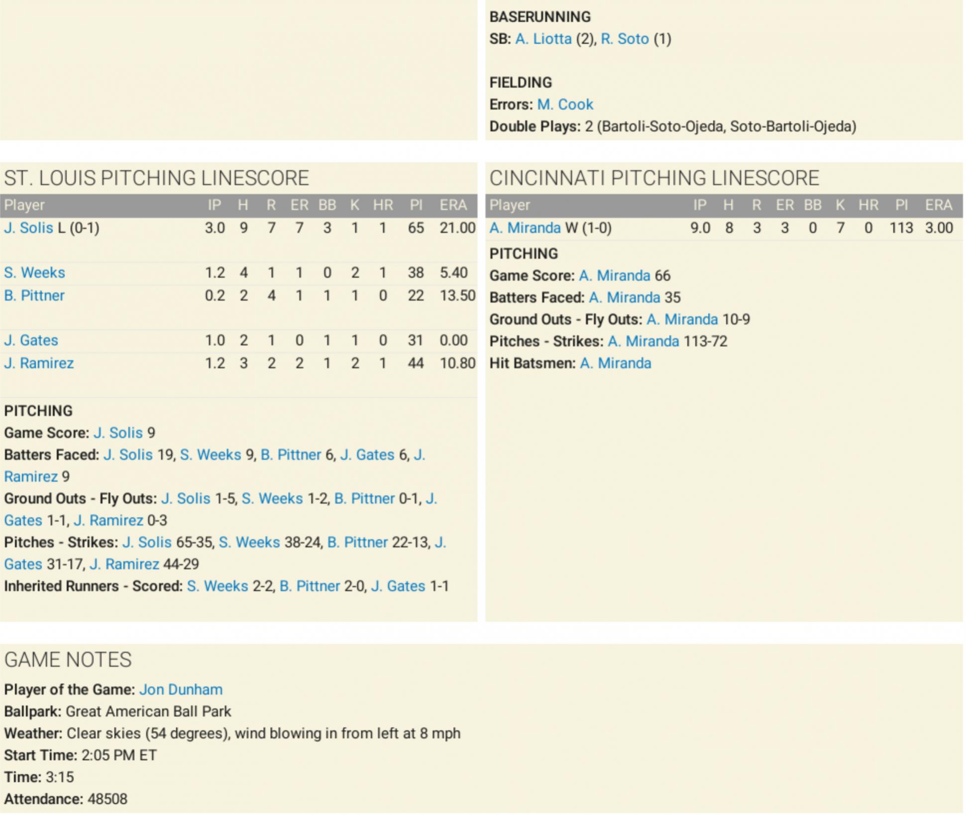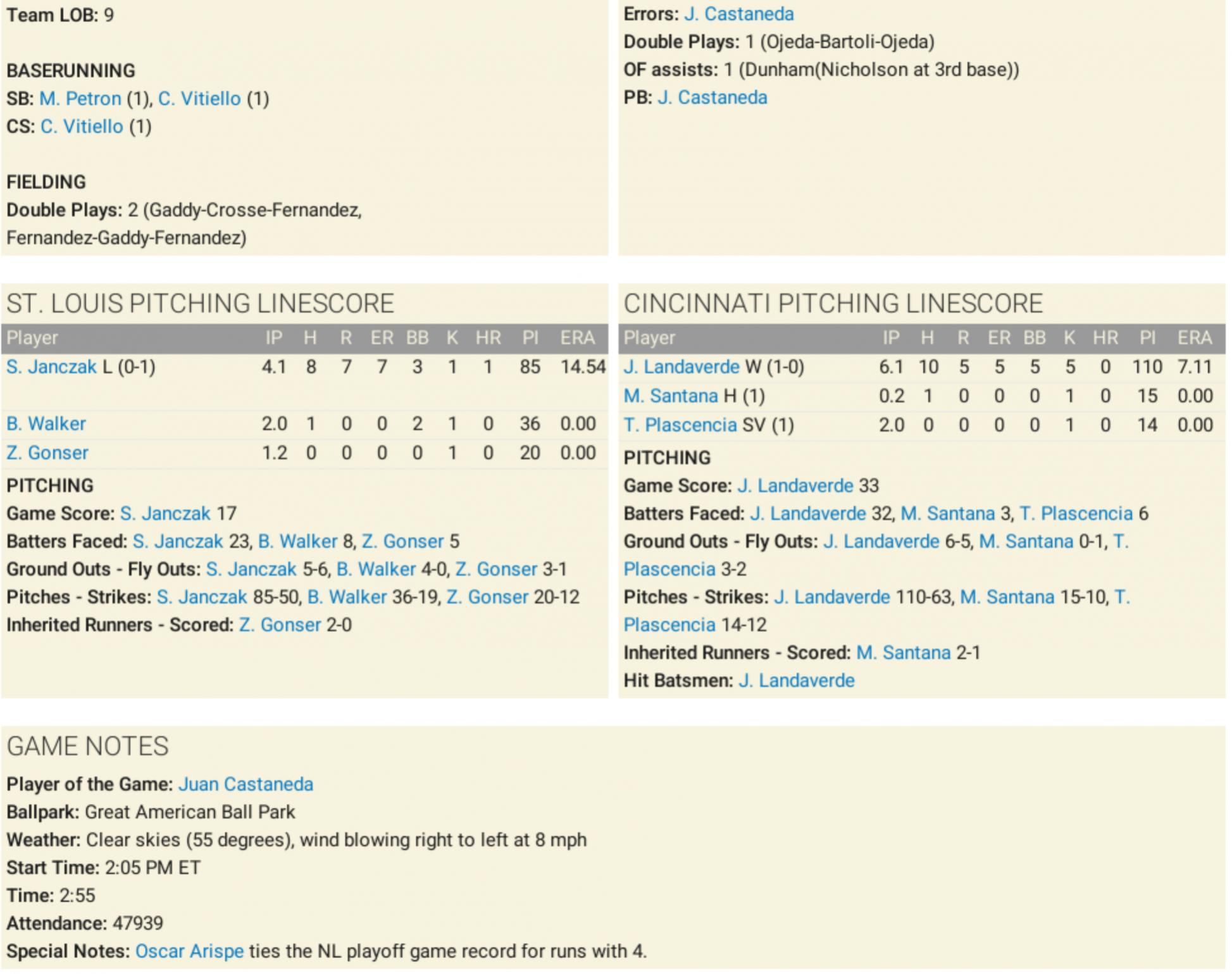 Mad Dog: “MIKE! COME ON! Did you see Juan Castaneda? Three for four, homer, double, four RBIs. That guy carried the Reds on his back today. I mean, look at the box score — Castaneda and the Reds just flat-out beat St. Louis.” Mike: “I see that, Dog, but let’s be honest — the Cardinals had the bats going, too. Arispe goes four-for-five, ties the NL playoff record with four runs scored. They hung five on Cincinnati. This is not a blowout, it’s just one of those wild first games where pitching gives way to big swings.” Mad Dog: “Wild swings? MIKE! The Cardinals’ starter, Steven Janczak, gives up seven runs in four and a third innings. FOUR AND A THIRD! That’s a World Series starter in Wild Card Game 1? Not happening! That’s an issue right there.” Mike: “Sure, he struggled, but look at the bullpen — Walker, Gonser, they shut it down the rest of the way. And Landaverde? He had five strikeouts in six and a third, handled ten hits, only gave up five runs. That’s enough to steal a Wild Card opener in this kind of offense-heavy game.” Mad Dog: “I DON’T CARE ABOUT LANDA VERDE, MIKE! You can’t give up seven and still say ‘we’ll be fine.’ The Cardinals are lucky to have even one chance to bounce back tomorrow. And let me tell you — that Arispe performance? Four runs, tying a playoff record — yeah, it’s impressive, but you can’t win a series scoring runs if the other team is lighting up the scoreboard first!” Mike: “Dog, I agree, it’s a mess, but it’s just Game 1. The Cardinals have a chance to turn it around tomorrow, and they have to. The Reds have to defend this lead under playoff pressure now.” Mad Dog: “Pressure? MIKE! The pressure’s on the Cardinals to even survive this. Reds got the momentum, Castaneda’s swinging like he’s in the middle of July, not October. St. Louis? They better bring their A-game, because Game 2 is going to be a war!” |