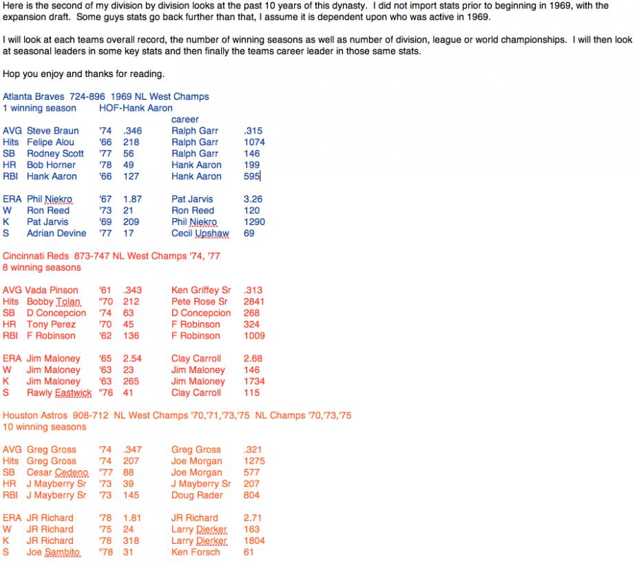 It was the Mets 3rd division title and 1st WS appearance Congratulations to the Mets as we wind down the '78 season, I will take a look at each team and how they have performed over the 10 seasons that I have now completed. I will include overall record as well as team leaders in some key categories Thanks to all that have been reading along with me as I have gone. |