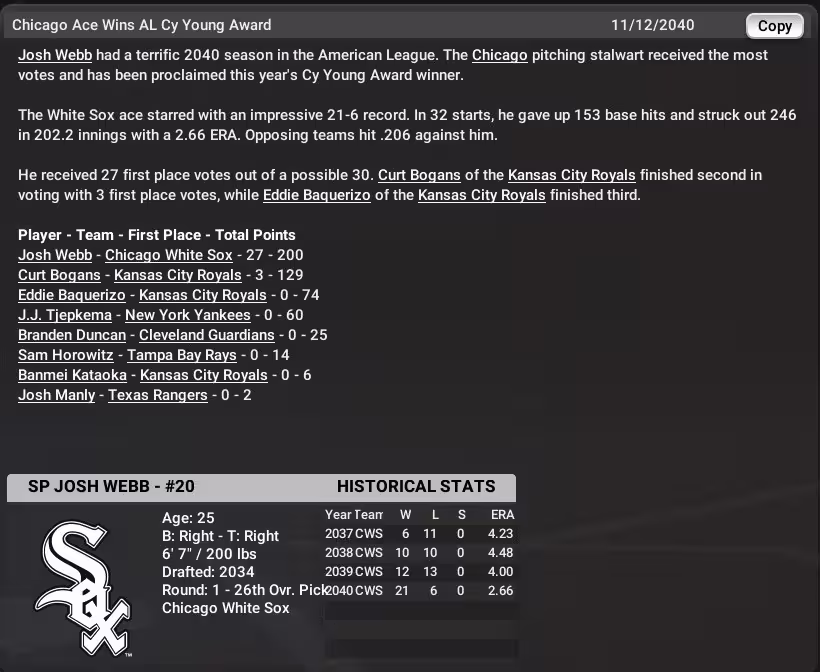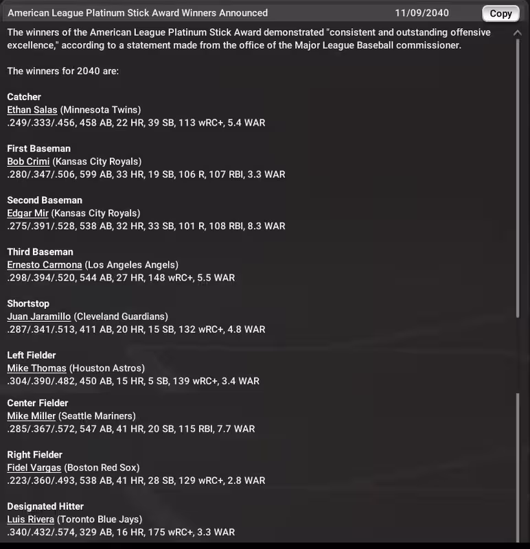 We just completed our monthly private practice with many young international amateur free agents who we hope can aid our club in the coming years. It was great to meet the players in-person and get to know them better, and I was able to improve my scouting assessment on all invitees. In fact some of the players impressed me, since they showcased a higher potential than I had previously expected from them: Jorge Asebedo, 16 year-old CF out of Mexico Lean and athletic, Jorge Asebedo hails from Río Bravo, Mexico. He has shown flashes of light-tower power. He hits with his hands, stays inside the ball, and works it up the middle. He should have an overall good eye. Asebedo looks like a potential regular in a key role at the big league level. David Mancero, 16 year-old C out of Dominican Republic Lean and athletic, David Mancero hails from Santo Domingo, Dominican Republic. He has tremendous power potential. He has good range and gives maximum effort without being careless. He should have good strike zone recognition. Mancero can be a second division starter at catcher. It was a great practice and none of the invitees disappointed in showcasing their talent. And other players that I was able to further assess were: Juan Landeros, 16 year-old RF out of Dominican Republic Edgar Quintero, 16 year-old SS out of Dominican Republic Daniel Guerra, 16 year-old 2B out of Dominican Republic Luis Quintanilla, 15 year-old 3B out of Netherlands Antilles Jorge Soriano, 16 year-old CF out of Panama Aroghetto Badoglio, 16 year-old RF out of Italy Nelson Covarrubias, 16 year-old SS out of Dominican Republic Juan Mendoza, 18 year-old 2B out of Dominican Republic Personnel A new contract for Stewart, one retirement, and a couple of expired contracts for the Royals to start the offseason. After careful consideration, I have decided to extend your contract with the Kansas City Royals. Your new contract is for 2 years and a value of $2,200,000 per year. The Office of the Commissioner has informed you that the following staff member of the Omaha Storm Chasers (IL, AAA) has decided to retire: Pitching Coach Roger Carter The Office of the Commissioner has informed you that the following staff members of the Kansas City (ACL) Royals have left the team because their contracts ran out or they have been promoted: Manager T.R. Keating The Office of the Commissioner has informed you that the following staff members of the Kansas City (DSL) Royals Stewart have left the team because their contracts ran out or they have been promoted: Pitching Coach Dylan Lesko Promotions were made, with offers submitted to fill the resultant gaps: AAA Pitching Coach Eric Ridener from AA AA Pitching Coach Dan Wright from A+ A+ Pitching Coach Jin-hyuk Kim from DSL Glass Retirements The day has arrived as, following another World Series defeat, Bobby Witt Jr. retires from baseball. The Royals, as with Salvador Perez, choose not to retire his number which comes as something of a surprise given his standing on the All-Time lists: TEAM BATTING SINGLE SEASON LEADERS SLUGGING PCT - SINGLE SEASON Rank Player SLG Year 6 Bobby Witt Jr. 0.567 2024 7 Bobby Witt Jr. 0.565 2025 OPS - SINGLE SEASON Rank Player OPS Year 10 Bobby Witt Jr. 0.947 2025 WAR - SINGLE SEASON Rank Player WAR Year 1 Bobby Witt Jr. 8.4 2025 3 Bobby Witt Jr. 8.1 2024 4 Bobby Witt Jr. 7.7 2030 RUNS - SINGLE SEASON Rank Player R Year 4 Bobby Witt Jr. 118 2024 9 Bobby Witt Jr. 109 2025 HITS - SINGLE SEASON Rank Player H Year 10 Bobby Witt Jr. 196 2024 TOTAL BASES - SINGLE SEASON Rank Player TB Year 2 Bobby Witt Jr. 350 2024 DOUBLES - SINGLE SEASON Rank Player 2B Year 3 Bobby Witt Jr. 51 2025 7 Bobby Witt Jr. 47 2024 TEAM BATTING CAREER LEADERS WAR - CAREER Rank Player WAR PA 2 Bobby Witt Jr. 65.2 9083 GAMES - CAREER Rank Player G PA 3 Bobby Witt Jr. 2146 9083 RUNS - CAREER Rank Player R PA 2 Bobby Witt Jr. 1268 9083 HITS - CAREER Rank Player H PA 2 Bobby Witt Jr. 2316 9083 TOTAL BASES - CAREER Rank Player TB PA 2 Bobby Witt Jr. 3871 9083 SINGLES - CAREER Rank Player 1B PA 3 Bobby Witt Jr. 1421 9083 DOUBLES - CAREER Rank Player 2B PA 2 Bobby Witt Jr. 521 9083 TRIPLES - CAREER Rank Player 3B PA 3 Bobby Witt Jr. 88 9083 HOME RUNS - CAREER Rank Player HR PA 3 Bobby Witt Jr. 286 9083 RBIS - CAREER Rank Player RBI PA 2 Bobby Witt Jr. 1165 9083 STOLEN BASES - CAREER Rank Player SB PA 2 Bobby Witt Jr. 396 9083 WALKS - CAREER Rank Player BB PA 5 Bobby Witt Jr. 644 9083 Around the League Retirements Atlanta Braves: SP Mason Barnett retired from professional baseball. Texas Rangers: SS Justin Lebron retired from professional baseball. Chicago Cubs: RP William Schmidt retired from professional baseball. New York Mets: SP Cade Townsend retired from professional baseball. Los Angeles Angels: 3B Coby Mayo retired from professional baseball. Houston Astros: SP Ricky Tiedemann retired from professional baseball. Chicago Cubs: SP Adam Kloffenstein retired from professional baseball. Chicago Cubs: CF Pete Crow-Armstrong retired from professional baseball. San Francisco Giants: SP Tink Hence retired from professional baseball. Toronto Blue Jays: 2B Cole Young retired from professional baseball. Arizona Diamondbacks: SP Paul Skenes retired from professional baseball. Milwaukee Brewers: CF James Wood retired from professional baseball. Los Angeles Angels: C Cade Arrambide retired from professional baseball. Cleveland Guardians: RF Cam Cannarella retired from professional baseball. Philadelphia Phillies: CL Chan-koo Kim retired from professional baseball. New York Yankees: 3B Ju-chan Bae retired from professional baseball. Miami Marlins: CF Bobby Osier retired from professional baseball. Pittsburgh Pirates: 1B Takashi Toguchi retired from professional baseball. Chicago Cubs: CL Chris Kurtz retired from professional baseball. Baltimore Orioles: Retired #9 in honor of Coby Mayo. Washington Nationals: Retired #29 in honor of James Wood. |