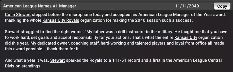 Kansas City Post Season Stats Too many bats went quiet in the postseason with the outfield in particular struggling, only Chase Standberry really contributing. With Team Options and Free Agency looming there are some decision for the Royals to make. The pitching battery did what they could but came up against one of the great batting line ups in the World Series and didn’t get enough support from the offense to get them through. Owner Goal Review Team Record: I told you before the season to win it all, and you almost did! Next year we'll bring the championship home to Kansas City. Upgrade a position: Well done finding an improvement at Third Base. I know it wasn't that easy of a task, but Mike Campney looks like he'll be a great player for us. Extend your player: It's not easy to lock up a guy who doesn't want to talk. Keep the discussions open with Ethan Chafin. Improve your team record: Things have improved in road games. Let's keep the arrow trending upward. Long Term: You made the playoffs. I had set out a longer vision to bring a championship to Kansas City by 2043, and that time isn't up yet. You do know it's been 25 years since this franchise has won? That may not be as bad as some teams, but I think the fans are starting to wonder when the next one will come. I am good with your performance in accomplishing the goals I have given you. However, when I consider the on- and off-field success of the team, my overall mood with your performance is very happy. Minor Leagues Post Season Omaha Storm Chasers [AAA] won the Championship. Northwest Arkansas Naturals [AA] won the Championship. Quad Cities River Bandits [A+] won the Championship. Columbia Fireflies [A] lost in the Championship. Kansas City (ACL) Royals [R] missed the Playoffs by 5 games. Kansas City (DSL) Royals Stewart [R] missed the Playoffs by 3 games. Kansas City (DSL) Royals Glass [R] missed the Playoffs by 16 games. |