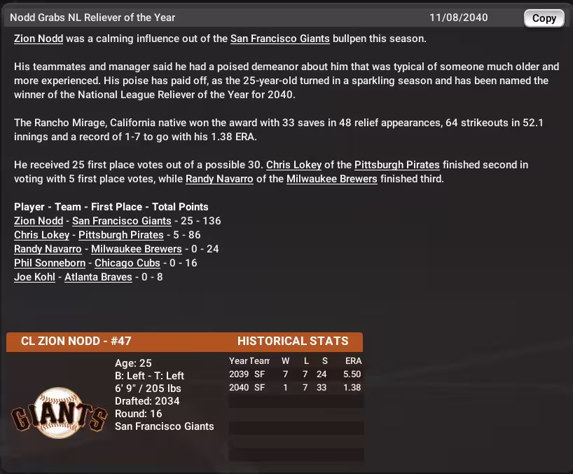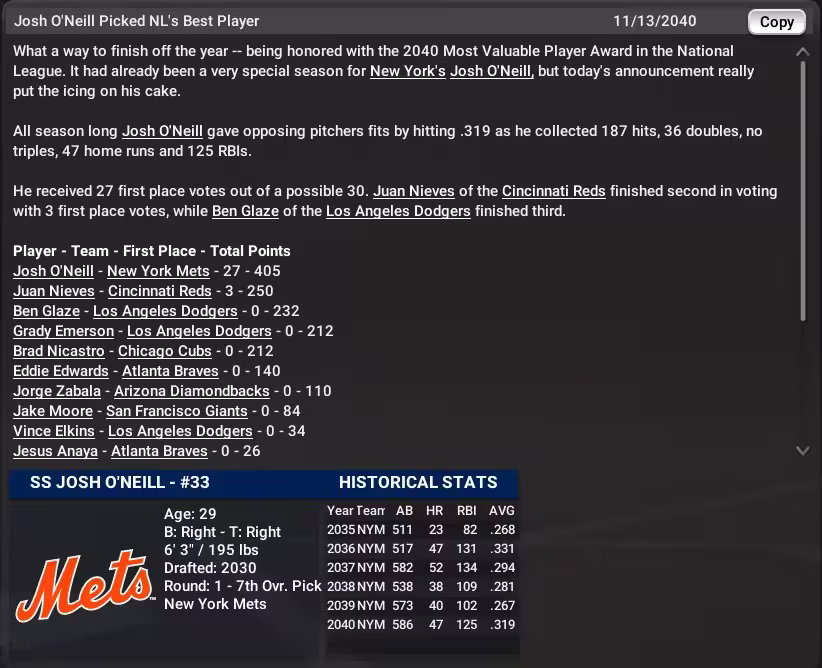 Team Record: I'm very excited by how the team has performed so far. If you keep up this rate, I have no doubt that you will win the championship like I asked you to! Upgrade a position: I don't see an improvement from where we were last year at Third Base. Please be on the lookout for an upgrade, if you want to keep me happy. Extend your player: I know it's hard to talk extension early with some guys, but I was hoping that Ethan Chafin would have been an exception. Keep the dialog open with him and try to get him signed as soon as you can. Improve your team record: Things have improved in road games. Keep up the good work! During our time working together, I have been good with your progress towards the goals I have set out for you. Considering your current and past successes, I am happy with your overall performance. It's important to have success on-field and in the boardroom, and you seem to be on that path. Prospect Performance 2040 Draft The 30th pick of a weak draft saw the Royals select Puerto Rican SP Julio Bonilla. A groundball pitcher with potential plus stuff to go with above average movement and control. He has a 6 pitch arsenal with his fastball, slider, and curveball all almost MLB ready at 17. Round 2, Pick 30 - 1B Robby Moll, age 18 out of high school Round 3, Pick 33 - 2B Jonathan Boykin, age 18 out of high school Round 4, Pick 28 - 2B Randy McCormick, age 18 out of high school Round 5, Pick 29 - CF Jake Adams, age 17 out of high school The Royals signed all 20 of their draft class and all will start in Rookie Ball with the hope to play in the Autumn League at the end of the season. |