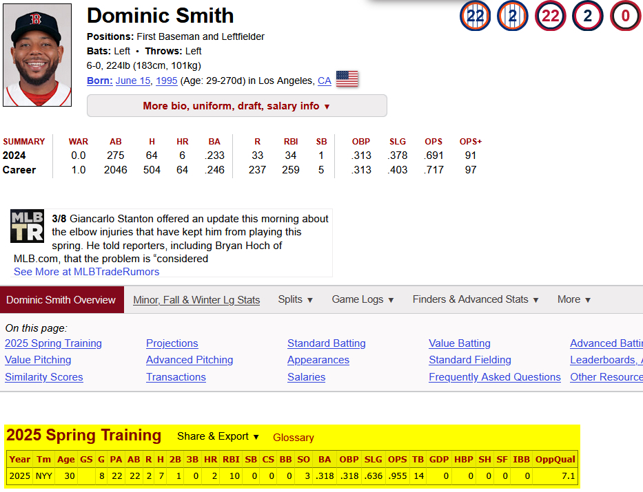 Your old friend Dom Smith has been having a good spring training with the Yankees. I saw a few of his ABs and what struck me was his bat control — I think that's the term for it. For example, waiting on a curve and just meeting the ball even below the strike zone, lacing it for a single. He's almost 30 now, so he should have picked up some tricks along the way.