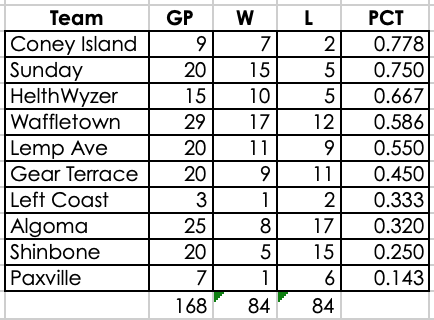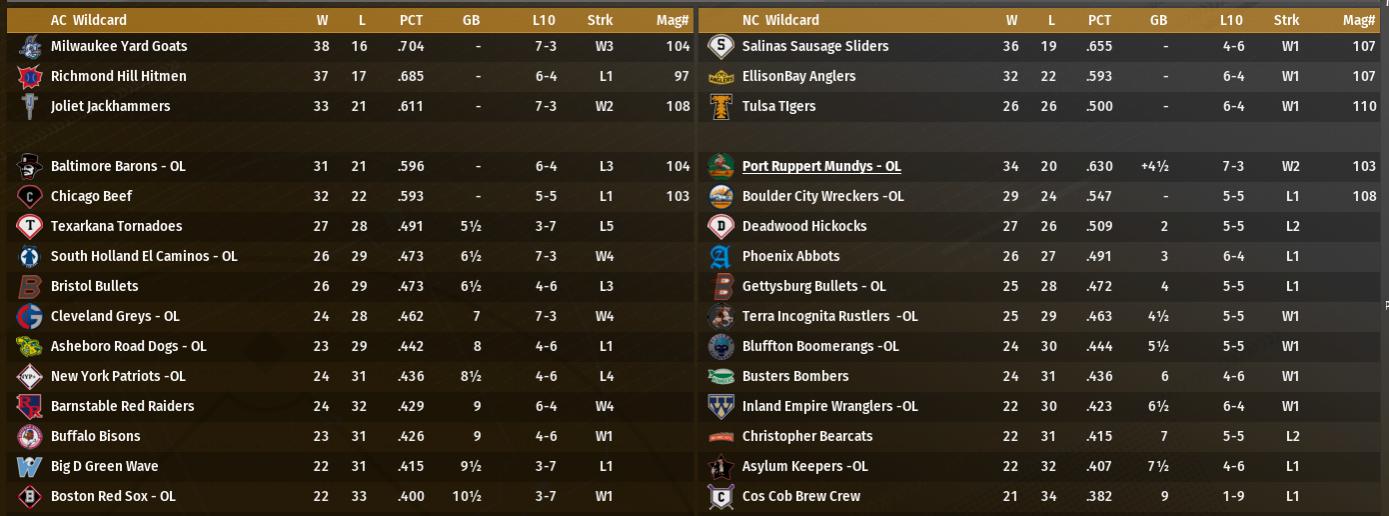 In PT Waffletown is the only division leader. In the AC Sunday, Lemp Ave and Algoma are battling for the two wild card spots. In the NC Coney Island has a considerable lead in the wild card race and trails in its division by 3.5 Left Coast, Shinbone and Gear Terrace are likely to be heading to silver next week unless they get hot. |