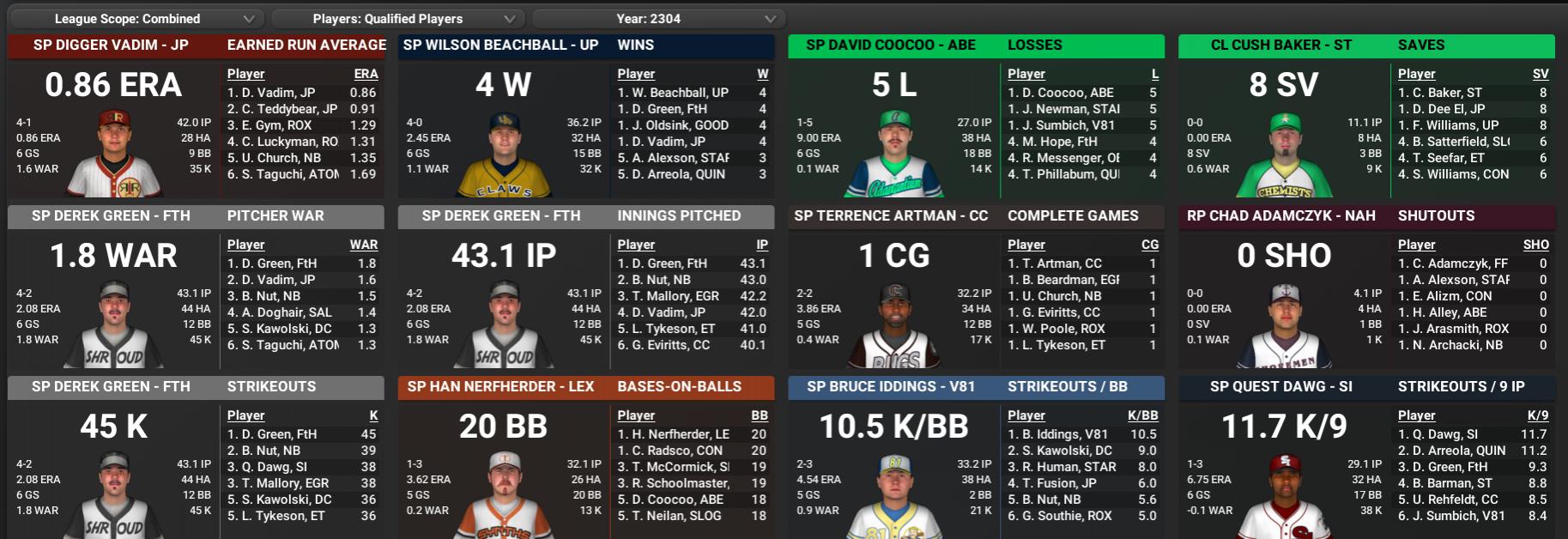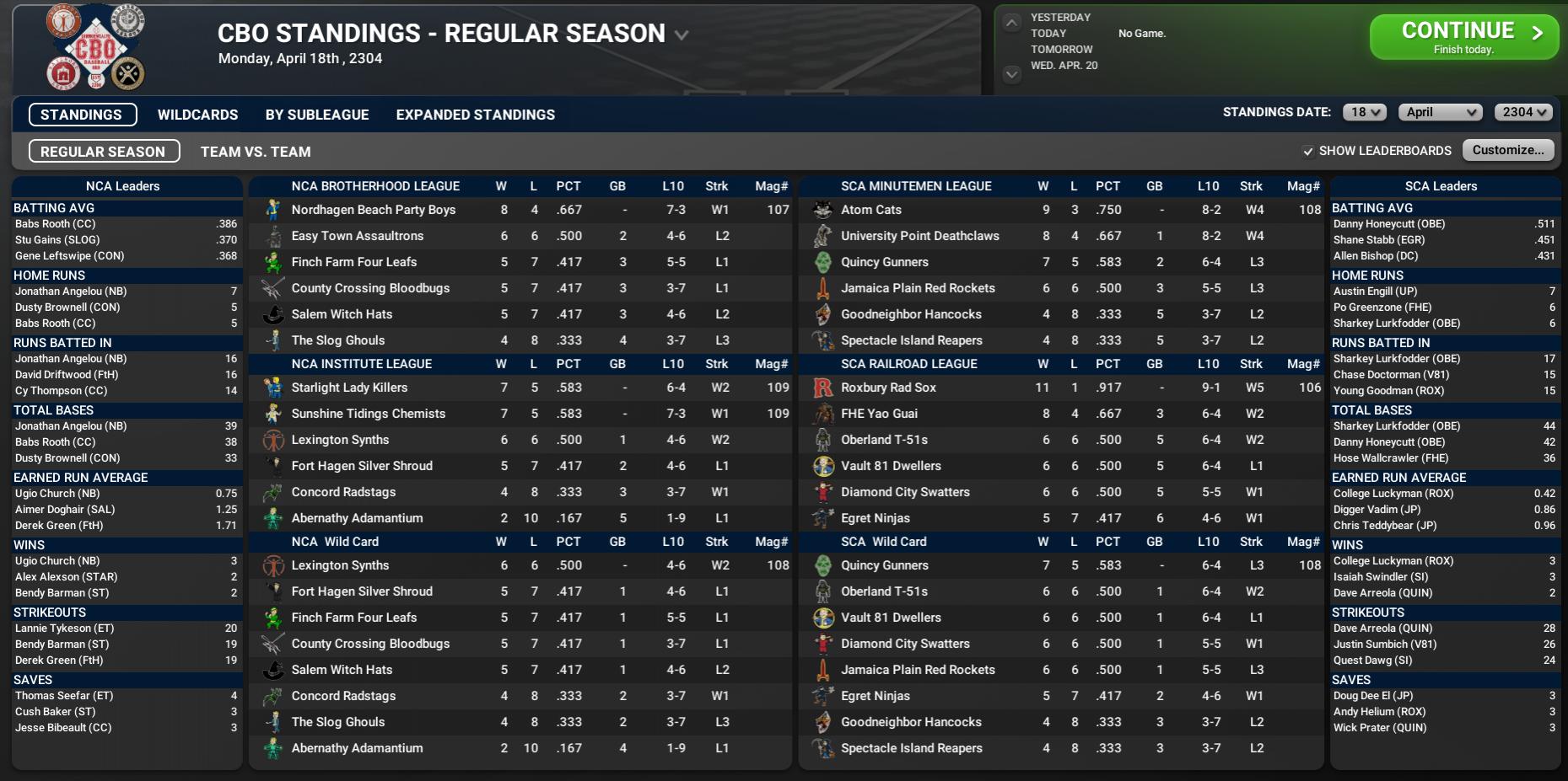 BNN Weekly Report This Week in the CBO, BMU, and GBRL by Nat Wright-Kawolski 18 April 2304 Analysis In the first look at Power Rankings this season, the defending Sole Survivor Series champions, the Roxbury Rad Sox, emerge as the #1 team. The Sox continued their winning ways from 2203, going 11-1 in interassociation play and proving that they are the kings of the dungheap for the 2304 season until another team steps up. Instead of analyzing all the wins, let us take a look at the one loss, a 5-3 defeat at the hands of the Salem Witch Hats (#18). In that game, the Rad Sox took a 3-2 lead in the top of the 5th, but then starter Whokill Poole allowed three runs in the bottom of the inning for the final score. The Hats' Newspaper Turnbull stole the show, going 2 for 4 with two home runs, two runs scored, and four RBI. Coming in at #2 is PAM's pick, the Atom Cats. The Cats went 9-3 in their battles against the North Charles Association. All three losses came against 2303 playoff teams: County Crossing* (#19), Sunshine Tidings (#6), and 2303 NCA champs, Fort Hagen* (#17). Atom did shut out Nordhagen Beach (#4) and beat another team performing well to start, Starlight (#7). University Point is #3. The Deathclaws struggled against the Brotherhood League, going only 3-3, but then tore through the Institute League, going 5-1. The Claws have won 7 of their last 8 and trail the Cats by only a game early on. University Point also won their last four, with a 6-5 win over the Chemists in 11 innings as the only truly close game. Against 2303 playoff teams, the Claws went 4-1, with their sole loss being a 9-2 deficit to the Party Boys. Speaking of the Boys, they are #4 this week, possessing the best record in the NCA after a 5-1 week, the sole loss coming against the top-ranked Sox. Like the Deathclaws, Nordhagen Beach has now won 7 of its last 8 games, with that loss to Roxbury breaking a six-game winning streak. Against 2303 playoff teams, the Boys went 3-2 with their other loss coming to the #2 Cats. At #5, we have another 2303 playoff team, the FHE Yao Guai. The Yao Guai started off really hot, winning 5 of 6 against the IL before cooling off and going 3-3 versus the BL. A couple of big wins, or so it seems, were against two teams we will look at more below, the Silver Shroud (7-6 in 11 innings) and the Bloodbugs (14-7). What's the deal with the Bugs and Shroud? County Crossing looked to be off to another stellar start like they did in 2303 when they downed Jamaica Plain (#13), the Cats, and Spectacle Island (#22) in their first three games of 2304. Then, the Bloodbugs lost their next three and seven of their past nine games, falling to 5-7 at the end of the interassociation challenge. Not only have they lost seven games, but County Crossing has also given up a metal bucket full of runs, including games of 11, 8, 6, 11, 14, and 10. Their 79 runs allowed are currently tied for ninth in the NCA, with a 10.68 Bullpen ERA, the worst in the CBO by three ERA points. Fort Hagen is also struggling but the panic button is far from pushed for this team. They are a team used to winning, so it is expected that their middling performance to start will not be permanent. Currently tied for 6th in the NCA in both runs scored and allowed, the Shroud do have something to work with, though they are hoping some initial offensive struggles by Well Done Dungan (.185/0/3), Ben Pawlak (.279/1/9), and Ginger Rogers (.111/0/0) can be overcome. For pitching, Derek Green (2-1, 1.71) has been outstanding, but Mike Cartrette (0-0, 6.32) has been the counterweight. Closer Kevin Marsh, who finished 2303 with 32 saves and a 1.66 ERA, has already blown 2 of his 4 save attempts and carries a 10.12 ERA through two weeks. Standings Team vs Team Power Rankings Players of the Week NCA RF Hurr Lee Reyes, Lexington - .13/27 (.481), 1 HR, 5 RBI SS Paul Warwick, Sunshine Tidings - 11/20 (.550), 1 HR, 6 RBI, 3 R SCA SS Purple Gupta, Roxbury - 12/19 (.632), 3 HR, 9 RBI, 8 R 3B Allen Bishop, Diamond City - 12/27 (.444), 3 HR, 7 RBI Statistical Standouts NCA - RF Babs Rooth, County Crossing - .386/.509 OBP/1.373 OPS/1.0 WAR/11 XBH/234 OPS+/.559 wOBA LF Danny Honeycutt, Oberland - .511/.531 OBP/.894 SLG/24 H/ 16 R/250 OPS+/.602 wOBA Transactions Monday, April 18th , 2304 Lexington Synths: Activated RP Charlie Maloney from the injured list. Vault 81 Dwellers: Signed RF Dustin DeViney. Vault 81 Dwellers: Signed 3B Chris Fortunato. Easy Town Assaultrons: Signed CF Jig McGhee. Quincy Gunners: Signed free agent LF Sum Downie to a minor league contract. The Slog Ghouls: Signed free agent SP Cooch Pace to a minor league contract. Vault 81 Dwellers: Released RF Dustin DeViney. Quincy Gunners: Released LF Sum Downie. Vault 81 Dwellers: Released 3B Chris Fortunato. Sunday, April 17th , 2304 Abernathy Adamantium: MGR Squatty O'Sullivan names BC Chet Needham as his successor. Abernathy Adamantium: Activated RP Don Sanctuary from the injured list. Abernathy Adamantium: Released RP Dale Callaway. Finch Farm Four Leafs: Released LF Sum Downie. Quincy Gunners: Placed 3B Ben Pettinato on the 7-day injured list, retroactive to 04/16/2304. Quincy Gunners: Signed SS Jason Hurt. Sunshine Tidings: Upon visit from Jamaica Plain Red Rockets, announce partnership with Rockets at ArcJet Systems for production of Red Rocket Fuel product, a fuel advancement that hopes to launch people into space. Saturday, April 16th , 2304 Nordhagen Beach Party Boys: Activated RP Julian Shed from the injured list. Spectacle Island Reapers: Placed SS Shotgun McElveen on the 7-day injured list, retroactive to 04/15/2304. The Slog Ghouls: Activated RF Boots Yellowhair from the injured list. Vault 81 Dwellers: Signed 3B Travis Katz. Vault 81 Dwellers: Signed RF Lowton Roberts. Vault 81 Dwellers: Released RF Lowton Roberts. Vault 81 Dwellers: Released 3B Travis Katz. The Finch Farm Four Leafs traded 24-year old LHP Nick Kifer to the Vault 81 Dwellers, getting 25-year old minor league RHP Andy Nu