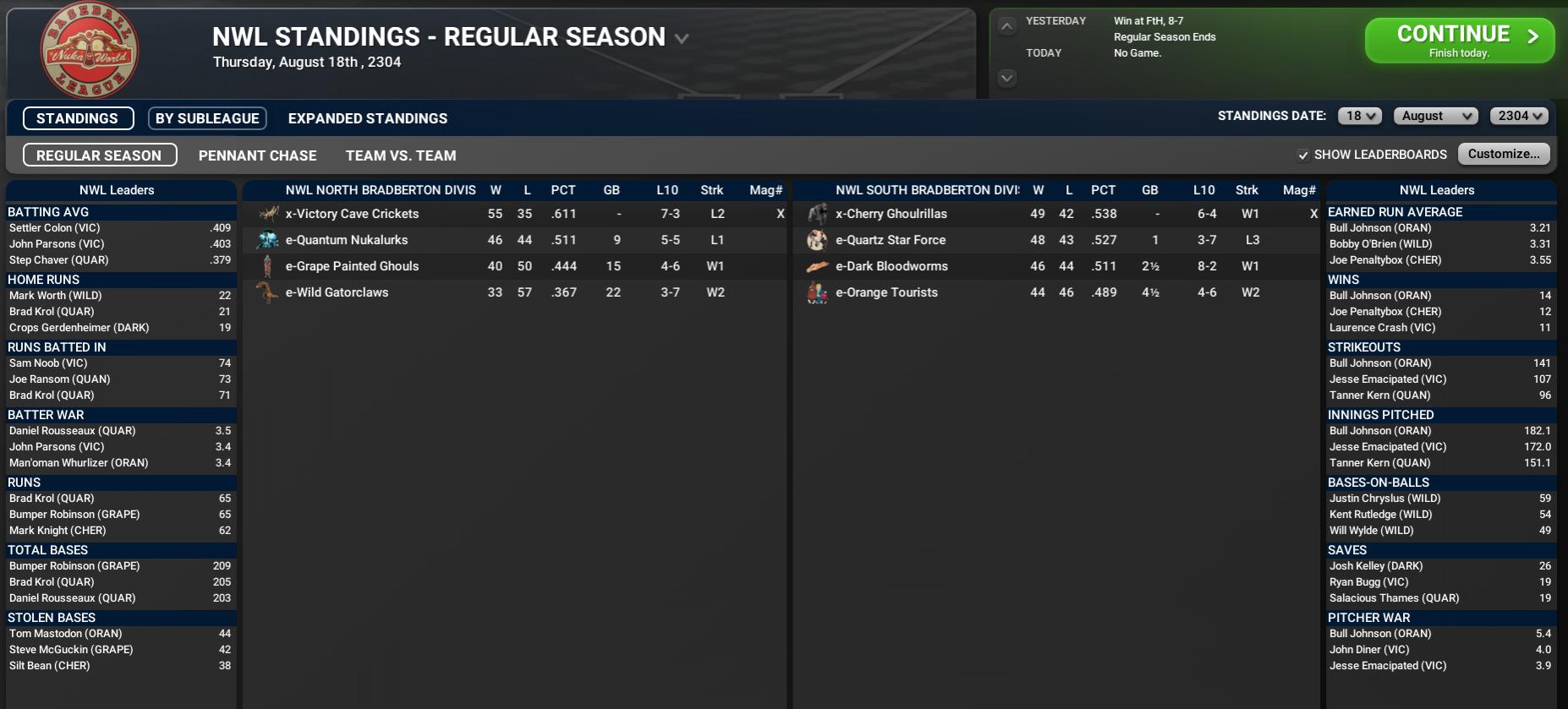 BNN Weekly Report This Week in the CBO, BMU, and GBRL by Nat Wright-Kawolski 8 August 2304 Analysis As we hit the 75% mark of the season with 90 games down and 30 to go, we now have a much clearer picture of who will be in, who may be in, and who is definitely out in our first true look at the playoff picture. With just six weeks to play in the 2304 season, there are three divisional races and a few teams still alive for a wildcard spot. Let's look at the Power Rankings and then the Playoff Outlook. The red-hot County Crossing Bloodbugs enter this week as #1, having gone 9-1 in their last 10, possessing a seven-game winning streak, and keeping an edge in the Brotherhood League for the NCA's best record. The Bugs swept Starlight (#20), won two of three over The Slog (#23), swept Fort Hagen (#8), and swept Easy Town (#9). The Bloodbugs' BL rival, Nordhagen Beach, is #2. The Party Boys are also hot, going 8-2 in their last 10 with a sweep over Abernathy (#24), winning two of three over Finch Farm (#19), a sweep of the Lady Killers, and another two of three series over the Four Leafs. Dropping two spots but still in possession of the CBO's best record is Roxbury at #3 after a 5-5 stretch. The Rad Sox were swept at Jamaica Plain (#5), won two of three against Vault 81 (#12), split at Spectacle Island (#22), and won two of three at Diamond City (#7). The hottest team in the South Charles Association, University Point, comes in at #4 after an 8-2 stretch that sees them in sole possession of the Minutemen League. The Claws split at FHE (#11), won two of three at the Rockets, swept Oberland (#18), and swept the Reapers for their current five-game winning streak. The Red Rockets round out the Top 5 after going 6-4, though they fell behind the Deathclaws by a game in the ML. In their last 10, the Rockets swept Roxbury, won one of three versus the Claws, split at the Swatters, and won two of three at Goodneighbor (#15). Playoff Outlook If the playoffs were to start today, these would be the seeds in the playoffs: NCA - 1) County Crossing, 2) Sunshine Tidings, 3) Nordhagen Beach, 4) Fort Hagen, 5) Easy Town SCA - 1) Roxbury, 2) University Point, 3) Jamaica Plain, 4) Diamond City, 5) Atom NCA Outlook - The five seem to be set with the Assaultrons holding a 10-game lead on both Concord and Lexington for the wildcard spot. While either Easy Town or Fort Hagen could technically collapse, we do not see either the Radstags or Synths suddenly surging into relevancy. The only stories left in the NCA is the jostling for position with County Crossing leading the Party Boys by two games in the Brotherhood League and Sunshine Tidings leading the Silver Shroud by three games in the Insitute League. Current prediction: What you see is what you get and the five seeds as they are now will be the same when the playoffs begin. SCA Outlook - There is a potential wildcard battle with the Cats leading FHE by two games and Vault 81 by four. While we would consider the Dwellers to be the most talented team of the three, they are also the most injured. Vault 81 traded away star RF Aesed Haejin and two of their other powerhouse offensive players in 3B Knud Bather and 2B Harry Byrd are out for the month of August. While the Yao Guai could surpass Atom, they could also probably use some help. The Minutemen League divisional race will be exciting with the Deathclaws and Red Rockets only a game apart. Jamaica Plain has relied on dominant pitching as the best squad in Starters ERA (2.71) and 2nd in runs allowed (285), while University Point is the most dominant offensive team in runs scored (486). These two teams meet up one more time from September 9-11 with the Claws leading the series, 5-4. The Railroad League race is all but over with the Rad Sox and Swatters pretty sure to finish 1-2 in the league. Roxbury has a Magic Number of 17 with 30 to play; they will not collapse. Current prediction: Just like the SCA, we are predicting the Deathclaws to edge out the ML championship and see the playoff seeds hold throughout the end of the season. If we had to shake up the predictions, let's call for the Yao Guai to claim the 5th seed over the Atom Cats. Standings Team vs Team Power Rankings Players of the Week NCA August 1 - His hard work and hustle paid off this week. The hard-working and hard-playing Ben Pawlak was rewarded with the North Charles Association Player of the Week honors. The scrappy Fort Hagen Silver Shroud center fielder hit .500 while collecting 9 hits in 18 at-bats, 4 home runs and 13 RBIs. This season Pawlak is batting at a .382 clip with 17 home runs and 68 RBIs. August 8 - Michael Fogcrawler of the Party Boys relied on a sharp eye and a quick bat to outpace all other North Charles Association hitters last week and collect the Player of the Week Award. He hit .600 with 12 hits in 20 at-bats, 6 home runs and 9 RBIs. In 90 games this season Fogcrawler is batting .288 with 103 hits and 29 home runs. He has scored 74 runs and driven in 67. SCA August 1 - The top batter in the South Charles Association last week was Young Goodman, who batted .474 and towered above everybody with a 5-game hitting barrage. During the week Goodman banged out a .474 batting average (9-for-19), 2 home runs, 9 runs batted in and scored 3 runs. Today the Roxbury left fielder received the SCA Player of the Week Award. During the current season Goodman is batting at a .340 clip with 24 home runs and 68 RBIs. He has played in 85 games and scored 61 times. August 8 - Today the South Charles Association announced its Player of the Week Award winner -- University Point Deathclaws center fielder Aesed Hayjen, who batted .591 (13-for-22) with 3 home runs, 6 RBIs and 6 runs scored. Hayjen is hitting at a .293 mark this season. His stats show 25 home runs, 44 RBIs and 76 runs scored. He has played 90 games for the Deathclaws. Statistical Standouts NCA - NCA - RF Babs Rooth, County Crossing - 35 HR, .727 SLG, 1.157 OPS, 89 R, 264 TB, 65 XBH, 190 OPS+, .