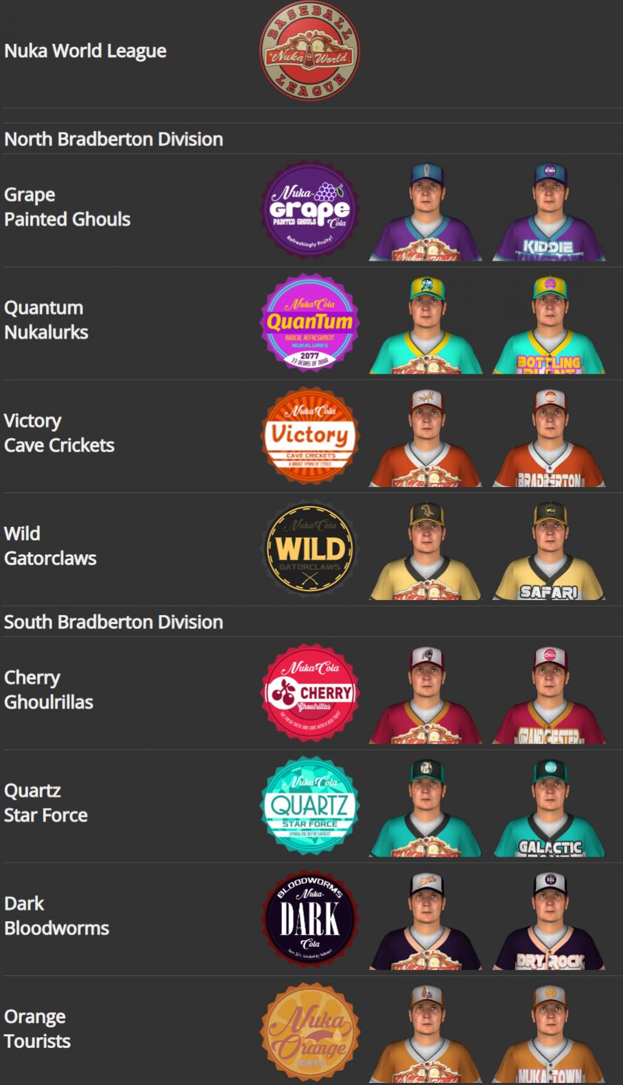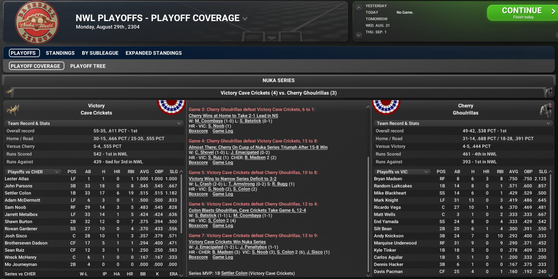 Season Pass Association Playoffs News by Evan Guy 30 August 2304 2304 Season Pass Association Series a Victory-Dalton Farm Matchup The 2304 Season Pass Association Series will feature two teams returning to the series for their second attempt at victory. The Dalton Farm Fog Crawlers (VL) won the 2303 SPA Series after sweeping the Cherry Ghoulrillas in seven games. The Victory Cave Crickets (NWL) were swept in the 2302 SPA Series by the Echo Lake Harbormen. Both the Ghoulrillas and the Far Harbor Ghoul Whales, the winners of the Vim! League in 2301, were also vying for their return trip to the SPA Series, but both teams fell in seven games. Stories below. Victory Wins Nuka Series The Victory Cave Crickets were good enough to get past the Cherry Ghoulrillas at John-Caleb Bradberton Honorary Field today and secure the 2nd championship in franchise history. "When you wear Cave Crickets on your shirt, you're good at something," Victory skipper Trader Patterson told the press. Cave Crickets first baseman Settler Colon was named MVP of the series after he went .515 with 6 home runs and 19 RBI. "It feels totally incredible," Colon said. "I could live to 1,000 years old and I'd remember this moment." The new champions capped off a great season with a 13-9 victory over the Ghoulrillas to win the Nuka Series 4-3. Dalton Farm Takes Game 7 for Vim! Series Victory It's party time in Dalton Farm. The confetti is flying and residents are smiling. The Dalton Farm Fog Crawlers have reached the mountaintop, capturing the 2304 Vim! Series today. They defeated the Far Harbor Ghoul Whales 10-5 at Blood Tide Stadium to officially wrap up the series 4-3. Asked how it feels to be a champion, right fielder Mat Sutor was to the point. "It feels great, like a million bucks. I'm so happy right now, not just for me but for all the guys," he said. "We put a lot of work into this and deserve to be champions." The team is planning a victory parade and fan appreciation day later in the week. Dalton Farm finished the regular season 55-35 and claimed first place in the Vim! League Fog Division. APL - Disciples Take Title The Bradberton Disciples are champions, today and forever. The Disciples topped the Galactic Zone G-Force 8-7 at Star Core Stadium at the Galactic Zone today to claim the Amusement Park Series crown. "Nobody can take this away from us, not ever," said series MVP and second baseman Savoy Slurp after his club had sealed the victory. "We worked hard and we accomplished our goal." The atmosphere was electric as the newly-crowned champs stormed the field at the conclusion of the game. Fans cheered, gloves flew in the air, high fives and hugs were the order of the day. "From day one of spring training, I could see it in their eyes," said Bradberton manager Slosh Nicklepenny. "The players had that look of intensity, of hunger, of a desire to accomplish something great, and today they did that. They're champions of the world." The Disciples took the series 4-2. The new titleholders completed the regular season with a first-place finish in the APL North Division and a 49-35 record. MDIL - Oceanarium Crowned Champions The Oceanarium Oceanics pulled out all the stops tonight, winning the Mount Desert Island Series in a hard-fought series with the Southwest Harbor Rippers. It was a seesaw affair, but with a 4-3 victory at Uncle Ken Park, Oceanarium lay claim to the franchise's 2nd championship. "There's no denying we faced a tough opponent," said Chris Barrientos. "But as the old saying goes, 'when the going gets tough, the tough get going,' and that's what we did today." The champs finished the regular season 55-35 and claimed first place in the Old Longfellow Division. A victory parade is set to be scheduled in Oceanarium in the days to come.