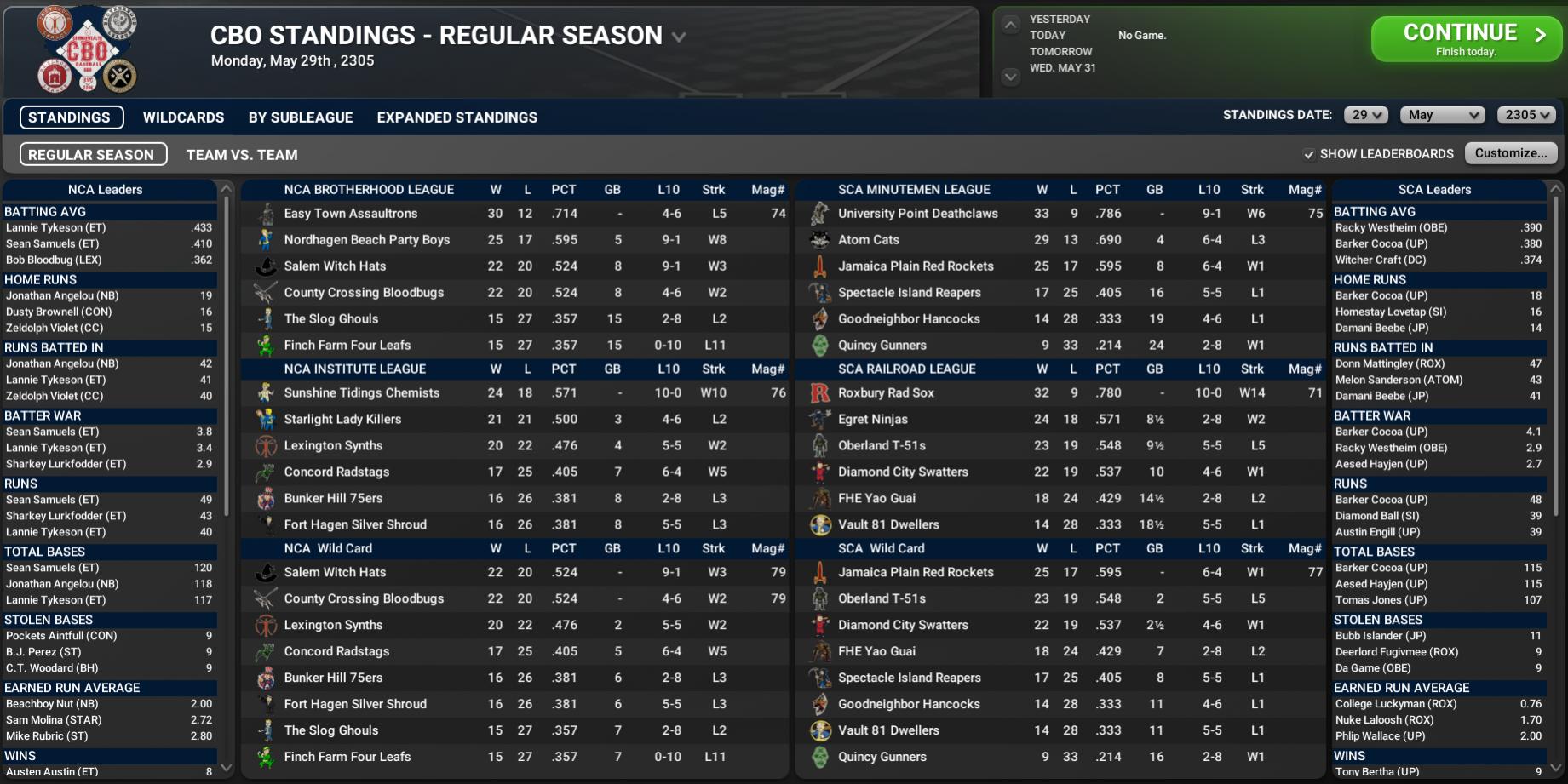 BNN Weekly Report This Week in the CBO, BMU, and GBRL by Nat Wright-Kawolski 17 April 2305 Analysis Interassociation play is now complete for the 2305 season, and there are some huge surprises across the league in the first 12 games of the season. That means we are more than 10% through the 2305 season. There is a lot of time for things to get back in order. For now, the South Charles Association won the interassociation championship going 81- 63. First, let's look at the Top 5 of the Power Rankings and then dive into the league races heading into association play for the final 22 weeks. The biggest surprise of the 2305 season has been the two-week dominance of the Railroad League's Egret Ninjas, our #1 team in the first Power Rankings. The Ninjas went a staggering 11-1 in the first two weeks, sweeping through the Institute League and losing only to Easy Town (#6) in the Brotherhood League matchups. Egret has won thanks to dominant pitching in the first two weeks, allowing just 28 runs in 12 games, best in the CBO. Their Starting Pitching (2.60) and Bullpen (1.12) are best, with the best FIP of 3.42. While the offense has a lot of work to do, the pitching has been amazing for a team looking to make its first appearance in the CBO playoffs. Their one time to be in the playoffs came in the 2296 season when the leagues were separated. The Ninjas lost that one series to the then Abernathy Adamantium (now Bunker Hill 75ers). At #2 is the Atom Cats, who also showed dominance in their 10-2 start. The Cats of the Minutemen League swept the Brotherhood League and then went 4-2 against the IL, dropping two games to Sunshine Tidings (#8) and Fort Hagen (#14). Two-time defending champions, the Roxbury Rad Sox, are #3 after going 9-3. The Rad Sox struggled in the first week, going 3-3 against the IL with losses to the Silver Shroud to open the season and then Lexington (#22) and the Chemists. The Sox then swept the BL, including a big 10-0 win over Finch Farm (#10). University Point is #4 at 9-3. The Deathclaws went 4-2 against the BL with losses to the Assaultrons and Four Leafs, and then they went 5-1 against the IL with their only loss being an 11-inning affair against Starlight (#12). As expected, the Claws are the top offensive team, scoring 101 runs in their first 12 and leading in four other offensive categories. FHE rounds out the Top 5 with a complete sweep by the SCA. The Yao Guai went 4-2 against the IL with losses to the Lady Killers and Sunshine Tidings. They then went 5-1 against the BL to go 9-3 in their first 12. The one loss came at the hands of The Slog (#21) in 10 innings. Brotherhood League We already knew that Easy Town was supposed to contend for the playoffs. What we did not expect was that they would be 10% through the 2305 season with a 5-game edge on both County Crossing (#19) and Nordhagen Beach (#20), each at 4-8. Really, we do not expect the Bloodbugs and Party Boys to stay down once NCA games start tomorrow, but we could see the Assaultrons turning that early edge into their first BL crown. County Crossing is suffering partially from the early slump by RF Babs Rooth (.174/2/4). The team is batting .245 (11th in NCA) and 12th in Bullpen ERA (7.29), made in part by the late-inning struggles of RP Terry Stebbins (0-3, 25.20) and CL Jesse Bibeault (2 SV, 4.91). While the Starters ERA (3.93) is 4th, ace SP Gavin Eviritts (0-1, 6.17) has not helped. Nordhagen Beach is also struggling on offense with only one player currently batting over .300 in 2B Jumper Hayes (.327/2/4). The Party Boys have generated most of their 50 runs on home runs (2nd) with 20. The starters on the mound have not been their usual selves, currently 5th in Starters ERA (4.02), including an 0-2, 4.29 start by ace Beachboy Nut. Institute League This was considered the least-talented league in the CBO in 2304, and that continues in 2305 with their only team over .500 being 7-5 Sunshine Tidings. The Chemists won the league in 2304, and they have what appears to be the best talent in a league where the 2nd place team may not be deserving of a playoff spot. Fort Hagen (5-7) was not picked to make the playoffs, but them missing would still be a surprise. The Silver Shroud seem to be in the middle of the pack, currently tied for 7th in runs scored (52) and tied for 6th in runs allowed (61). Ace Derek Green (2-0, 0.47) has been his usually dominant self, but the rest of the starting pitchers (7th with a 4.75 ERA) have struggled. Concord (5-7) was the pick to finish 2nd in 2305 by PAM, but they have not yet shown they can separate themselves from any of the other teams. The Radstags have not shown they can get their offense started outside of their stars in LF Dan Erb (.298/3/6) and 1B Dusty Brownell (.319/2/7). Minutemen League This is a league with the most obvious differences in talent with the big three of Atom-Jamaica Plain-University Point usually dominating the bottom three of Goodneighbor-Quincy-Spectacle Island. There is not reason to believe that will not also happen in 2305, with the standings indicating as such in the first two weeks. The Rad Rockets have not been the dominant team they usually are, but that is because their offense has been the absolute worst all around in the SCA, including being currently 12th in runs scored with 34. No player is currently hitting over .300 and three players--LF Carney Cornseed (.189/0/4), RF Damani Beebe (.167/4/8), and C Ayag Mour (.158/0/0)--batting below .200. SP Digger Vadim (2-0, 1.80) has been the star player, helping the Rockets to win almost every fourth game. Atom and University Point are both in the Top 5 for a reason, and they should stay in the playoff hunt throughout the season. Despite Goodneighbor's 5-7 start, it is safe to assume the Hancocks will be out of the running by midseason. Railroad League This league was the most dominant with four teams above .500 and one team at .500. Only Vault 81, dealing with injuries and suspensions, had a tough two-we