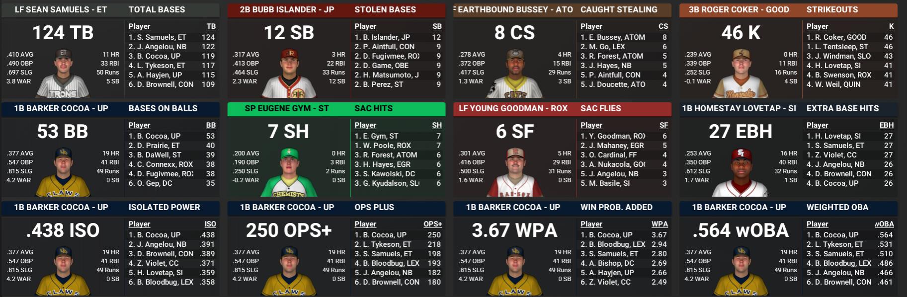 BNN Weekly Report This Week in the CBO, BMU, GBRL, Youth Leagues by Nat Wright-Kawolski 1 June 2305 The June 1 Super Post CBO Players of the Month NCA Hitter - Sean Samuels battered North Charles Association pitchers all May and wound up taking home the Batter of the Month Award. "I've been around Commonwealth Baseball Organization long enough to know you really have to work hard day in and day out to be able to put up this kind of consistency," the 27-year-old Samuels told reporters. "I put in a lot of work, even on the days I might not take the field, and it's always nice when everything comes together for me like it did this last month." In 21 games, Samuels hit .488 with 7 home runs, 19 RBIs and scored 27 runs. In 43 games this season Samuels has compiled a .410 batting average with 73 hits and 11 home runs. He has also scored 50 times and knocked in 33 runs. NCA Pitcher - Last month's cream of the crop on the mound was Beachboy Nut of the Nordhagen Beach Party Boys. He captured the North Charles Association Pitcher of the Month award for his outstanding performance in May. Nut started 5 games, threw 39 innings, yielded 22 hits and logged a 4-0 record. He put down 30 batters on strikes, walked 8 and compiled a 0.46 ERA. Opposing teams batted .164 against him. This year Nut has fanned 74 in 81 innings and collected a 6-3 record with a 2.00 ERA. NCA Rookie - Sunshine Tidings's Sun Crockett collected 19 hits to snare the North Charles Association Rookie of the Month for May. He batted .306 with 7 home runs, 17 RBIs and 18 runs scored. The 21-year-old is barely old enough to shave, but he could definitely contend for Rookie of the Year if he keeps up this pace. He was originally drafted by Fort Hagen in the 2nd round of the 2301 Rookie Draft. Currently Crockett has 10 home runs and a .258 batting average. SCA Hitter - Barker Cocoa got another reason to celebrate today as he followed up a great month of May at the plate by winning the South Charles Association Batter of the Month Award. During the month the University Point first baseman hit .347 with 11 home runs, 20 RBIs and 18 runs scored. Presently Cocoa is batting .377 and has collected 19 home runs, 41 RBIs, .547 OBP and scored 49 runs. SCA Pitcher - When College Luckyman takes the hill, he usually takes command of the game -- at least that's the way it was in May. The outcome was usually a Roxbury victory. His fine 5-0 performance earned him the South Charles Association Pitcher of the Month trophy. The talented Rad Sox hurler made 5 starts, worked 35.1 innings, permitted 21 base hits, and struck out 17 while putting up a 0.76 ERA. To date this season Luckyman has compiled a 9-1 record with a 0.76 ERA in 10 starts. SCA Rookie - Victor Desire is still a bit shy, but then, who could blame the newest South Charles Association Rookie of the Month honoree? He hasn't been around the league long enough to fully know the ropes yet, despite the fact that the 9th-overall pick in the 2304 Rookie Draft is putting up veteran-like numbers. In May the Goodneighbor hitter tagged opposing pitching for a .253 average with 19 hits, 4 home runs and 9 RBIs. Desire is hitting .271 in 2305 with 20 RBIs and 5 home runs. CBO Award Races - See bottom for full CBO leader boards Hitters Leaders NCA - 1B Lannie Tykeson, Easy Town - .428 (1), 14 HR (4), 41 RBI (T-2), .528 OBP (1), .736 SLG (1), 1.264 OPS (1), 3.4 WAR (2), 68 H (2), 40 R (T-3), 117 TB (3), 34 BB (T-5), .308 ISO (5), 218 OPS+ (1), 2.39 WPA (4), .531 wOBA (1) Other Contenders: RF Jonathan Angelou, Nordhagen Beach (.331/20/43), LF Sean Samuels, Easy Town (.410/11/33) SCA - 1B Barker Cocoa, University Point - .377 (2), 19 HR (1), 41 RBI (T-3), .547 OBP (1), .815 SLG (1), 1.362 OPS (1), 4.2 WAR (1), 49 R (1), 119 TB (1), 53 BB (1), 28 XBH (2), .438 ISO (1), 250 OPS+ (1), 3.67 WPA (1), .564 wOBA (1) Other Contenders: CF Aesed Hayjen, University Point (.332/14/38), C Racky Westheim, Oberland (.401/5/31) Pitchers Leaders NCA - SP Beachboy Nut, Nordhagen Beach - 2.00 ERA (1), 6 W (T-4), 3.4 WAR (1), 81.0 IP (2), 74 K (T-1), 4.4 K/BB (T-1), 8.2 K/9 (2), 1.9 BB/9 (2), 0.96 WHIP (1), 2.35 FIP (1), 222 ERA+ (1), 3.5 rWAR (1), .210 Opp Avg (2), 9 QS (T-1) Other Contenders: SP Austen Austin, Easy Town (8-2, 2.96), SP Mike Rubric, Sunshine Tidings (7-3, 2.80), SP Lannie Tykeson, Easy Town (6-0, 3.50) SCA - SP College Luckyman, Roxbury - 0.76 ERA (1), 9 W (T-1), 1 CG (T-3), 1 SHO (T-2), 0.87 WHIP (1), 589 ERA+ (1), 5.0 rWAR (1), .172 BABIP (1), .157 Opp Avg (1), .900 WINP (T-3) Other Contenders: SP Digger Vadim, Jamaica Plain (4-3, 2.63); SP Nuke Laloosh, Roxbury (6-2, 1.70) BMU Analysis League leaders in the Commonwealth Association are the Everett Mutant Hounds (Vault 81) at 21-8 and the Union Hope Lifegivers (Oberland) at 19-10. League leaders in the Massachusetts Association are the Trinity Plaza Snipers (Egret) and Boston Common Lead Bellies (The Slog) at 19-10 in the Downtown Boston League and the Eastlake Aquaboys (County Crossing) at 19-10 in the Glowing Sea League. BMU Players of the Month CA Hitter - Fastballs, curveballs, changeups, sliders. There wasn't really anything David Stahl of the College Square couldn't hit during the month of May. He has been named the Commonwealth Association Batter of the Month on the strength of a .319 batting average, with 13 home runs, 20 RBIs, 18 runs scored and a .397 on-base percentage. MA Hitter - Warwick Mirelurks fans may just have witnessed a star player blossoming before their eyes in May. Ken Debate put up a remarkable month at the age of 20 and has been named the Massachusetts Association Batter of the Month. For the month, Debate hit .465 with 15 home runs, 26 RBIs and 22 runs scored. CA Pitcher - The top-rated pitcher this past month in the Commonwealth Association was Bobby Lidtke of the Union Hope Lifegivers. He really dominated league hitters, finishing May with a 4-1 won-lost mark and a 2.33 ERA. The Lifegivers ace made 5 starts and surrendered 30 hits i