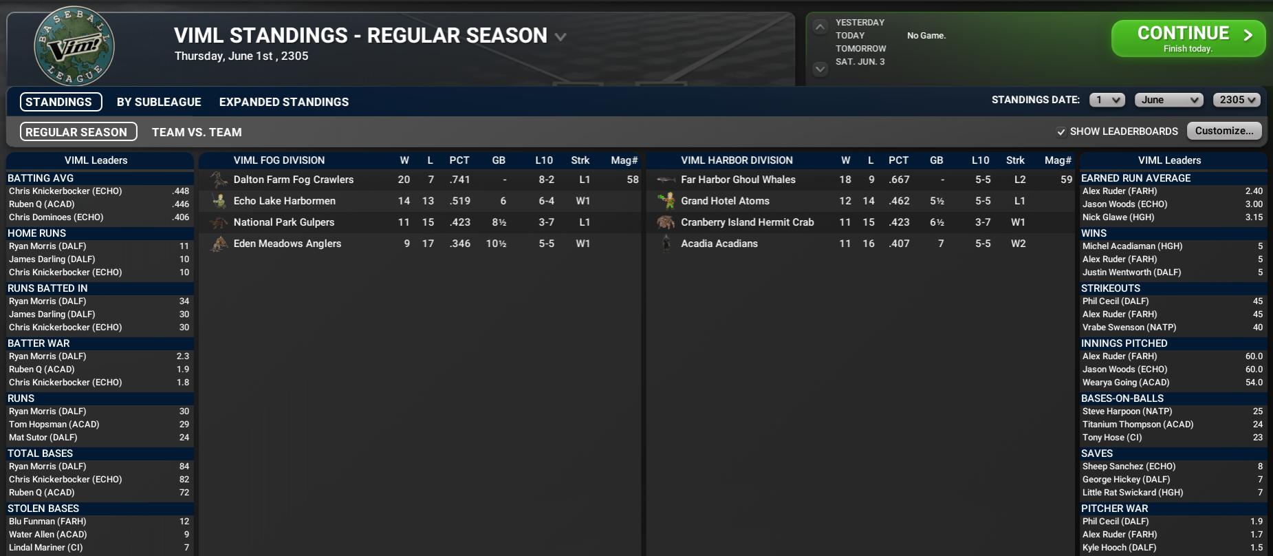 ---------------------------------------------------------- Nuka News Update Reporting on the NWL, APL, NWLR, and BBL Leagues by Evan Guy 1 June Quantum, Cherry Hold May Leads The Quantum Nukalurks and Orange Tourists are divisional leaders through the first month of the 2305 NWL season. Quantum was predicted to barely win their division, while the Tourists were expected to finish in 2nd place in theirs, 13 games behind the predicted winner, Cherry. In the North Bradberton Division, the Nukalurks currently hold a 1.5 game lead over 2nd place Victory, with Wild and Grape trailing behind. Currently on a six-game winning streak, the Tourists now have a 3.5 game lead over Cherry. Quartz and Dark are both in trouble of being out of the race early. For top players of the month, we have a double award thanks to a top CBO player becoming a rookie in the NWL this season. 1B Chase Doctorman of the Ghoulrillas is both the Hitter of the Month and Rookie of the Month. Whether he will finish the season in the NWL is left to be seen since a CBO team will probably come calling with lots of caps and prospects, but we will enjoy him while we have him. In the NWL, Doctorman is currently 3rd in Batting Average (.407), tied for 1st in home runs (8), 1st in RBI (25), tied for 6th in OBP (.430), 1st in SLG (.690), 1st in OPS (1.120), 1st in WAR (1.8), tied for 1st in AB (113), 2nd in hits (46), 1st in runs (26), 1st in TB (78), tied for 1st in SF (2), 2nd in XBH (16), 6th in ISO (.283), 1st in OPS+ (170), 1st in WPA (1.56), and 2ns in wOBA (.469). May was a magical month for SP Jesse Emacipated of Victory. He held the Nuka World League hitters spellbound, conjuring up a 6-0 mark and a 3.54 ERA. Emacipated also chalked up 7 starts, 56 innings and 41 strikeouts. For this outstanding performance he was rewarded with the Pitcher of the Month trophy. APL The Bradberton Disciples (Victory) of the North Division has taken an early 6-game lead in their division, while the Dry Rock Gulch Convicts (Dark) hold just a 1.5-game lead over the Nuka Town Operators in the South Division. Not known for his offensive prowess, Savoy Slurp set the league afire in May and took home the Amusement Park League Batter of the Month award. The Bradberton second baseman posted a steady .432 batting average, 9 home runs, 36 RBIs and 29 runs. Logan McDaniels was pure poison coming out of the Flying Ants bullpen in May. For his outstanding performance, he picked up the Amusement Park League Pitcher of the Month award. The Grandchester Flying Ants reliever had 1 save for the month with a 3-0 record and 1.35 ERA. He made 8 relief appearances, hurled 13.1 innings, yielded 13 hits, fanned 7 and walked 3. NWLRL Just like the NWL, the NWL Rookie League is split into the North Bradeberton and South Bradberton divisions. While most of the teams currently have their parent teams' namesakes, two squads decided to split from the parent squad name in 2305: the Nuka Jolly Elves (Victory) and the Nuka Plant Electrics (Dark). However, neither of those teams currently leade their divisions. The leaders in the North Bradberton Division are the Quantum B Nukalurks, while the Orange B Tourists are the leaders in the South Bradberton Division. Just like their parent clubs. John Millertime really put on a show in May, earning the Batter of the Month Award in the NWL Rookie League! The Orange B right fielder batted .370 with 14 home runs, 39 RBIs, 34 runs scored, along with 26 walks to compile a .493 on-base percentage. May's best hurler was Dusty Wilcox of Grape B. He overwhelmed NWLRL hitters all month long and captured the Pitcher of the Month award as he collected a 4-0 record in 8 starts. The 23-year-old Wilcox added 49 strikeouts in 41 innings and 20 walks to his season record and compiled a 3.51 ERA. Other clubs hit .215 against him. BBL There are only 11 games left in the Bradberton Boys League, but a lot can happen with every team but the Angry Anaconda Godmodes is technically still in the race. The top two teams advance to the Bradberton Boys Series. At 18-11, the Ol' Sugartop Buckaroos are the leaders, while the Starport Nuka Hubologists, the Fizztop Mountain Conquerors, and the Wixon Shovels all trail by just one game. The King Cola Youths, Mad Mulligan Travelers, and South Bradberton Tycoons are all still in the hunt, though the Travelers and Tycoons have been cold as of late. When Rush Clovis stepped up to the plate in May he did it with confidence, and today he was honored with the Bradberton Boys League Batter of the Month award. The young Ol' Sugartop first baseman posted a .465 batting average with 20 home runs, 33 RBIs and scored 26 runs. Clovis also worked pitchers for 19 walks to post a .557 on-base percentage. When the Hubologists skipper wrote Manigault on the lineup card, it was a bad omen for the opposition. Outing after outing in May he took command and usually got the win. He dominated with a 5-1 mark and 2.03 ERA in 8 starts. The gifted Hubologists star pitched 44.1 innings, fanned 36 and held opposing teams to a .205 average. For his excellent mound work Manigault was named the BBL Pitcher of the Month by the baseball writers. Vim! View Veracious, Vivacious, Vainglorious Vision of the Vim! Leagues by Vikky Vail 1 May Vim! League's Visionary Verdict for the 2305 Voyage The 2305 season is off to a rushing start after the first month of the season. Dalton Farm leads the Fog Division by 6 games and holds the Vim! League's top record, while the Far Harbor Ghoul Whales have a 5.5-game lead over Grand Hotel in the Harbor Division. Ryan Morris has a lot going for him. The Dalton Farm third baseman just broke into the majors this year and now the Vim! League has just picked him as its top hitter for May. In 27 games last month this outstanding rookie batted .392 with 11 home runs, 34 RBIs and 30 runs scored. When Alex Ruder takes the mound, a Far Harbor victory is usually the result. That was the case in May. That's why he was voted the Vim! Le