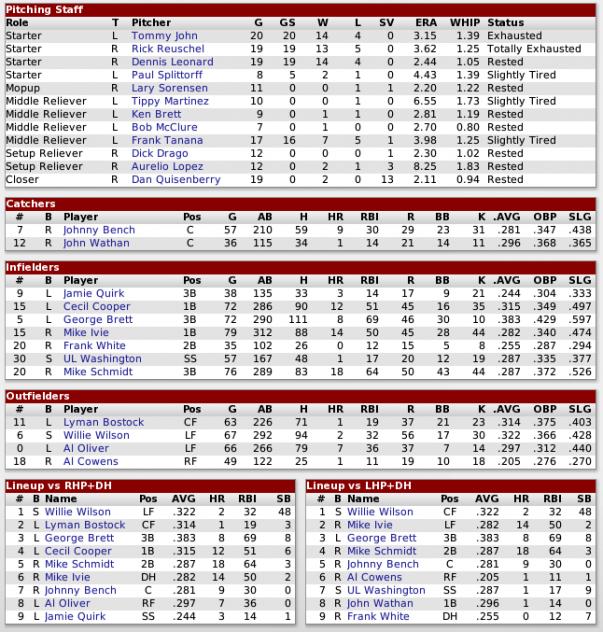 The Reds swept past the Pirates and the Royals defeated the Tigers in 4 games, however, it was game 1 that was a game for the ages. The Tigers scored first and the Royals managed to tie up the game in the 7th. It would continue 1-1 into the 15th when the Tigers posted 3 runs to take a commanding lead, it was then that the '79 Royals magic began. See below..... http://www.ootpdevelopments.com/boar...1&d=1355876345 |