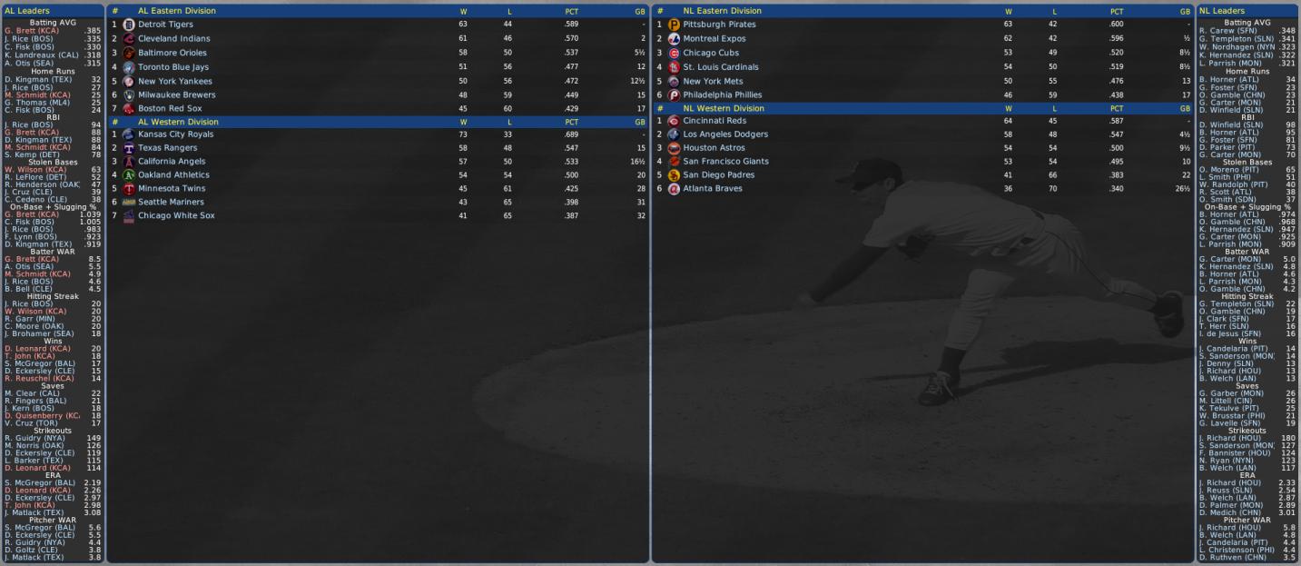I was curious how Mr. Bird turned out. I saw you weren't able to get rid of him before the '78 trading deadline. How did that wind up? Tough break against the Reds, but at least you finally made it back to the dance. Free agency...tough question. I remember you had a similar question two seasons ago when you asked if the league was getting too unbelievable. We're now entering Y12 of your game - I'm surprised the league is still as recognizable as it is. I'm thinking play conservative - not because I think there's anything inherently wrong with bulking up in this situation, or because it might be realistic for the RL '80 Royals, but because you just won 110 games. You can pretty much afford to sit on your laurels and let your war chest build - sooner or later you'll need to retool, and the more cash on hand, the quicker you can rebuild. |