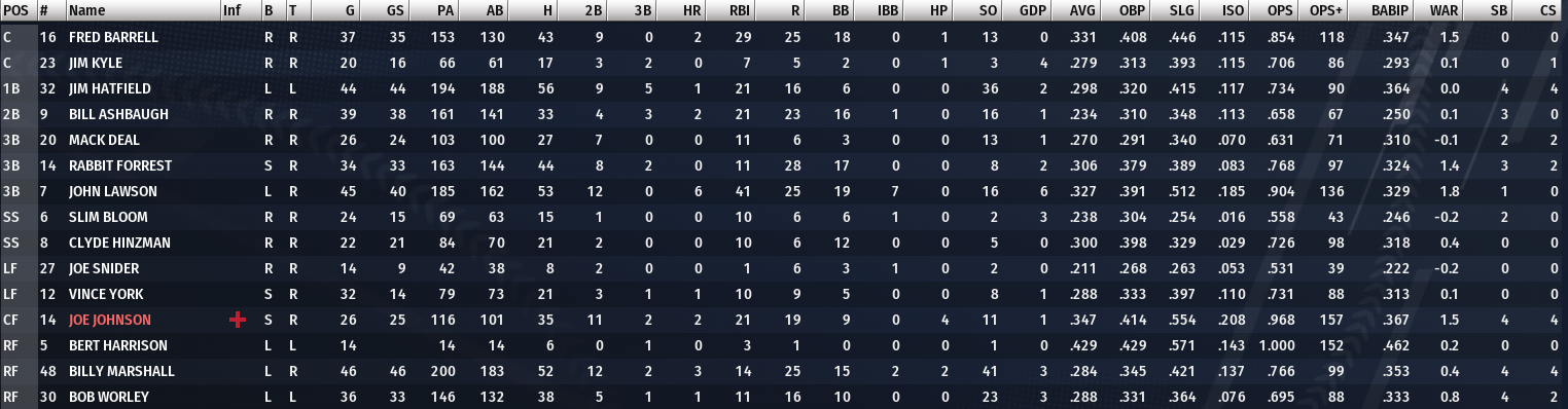 Seasonal Record: 62-65 (5th, 19 GB) Stars of the Week Lou Kelly : 20 AB, 9 H, 3 HR, 10 RBI, .450 AVG, 1.638 OPS Cy Bryant : 17 AB, 9 H, 0 HR, 2 RBI, .529 AVG, 1.176 OPS Joe Masters : 22 AB, 9 H, 0 HR, 4 RBI, .409 AVG, .871 OPS Weekly Schedule 8-27: Win at Saints (6-5): 13 innings 8-29: Loss at Cannons (9-10) 8-30: Loss at Cannons (3-6) 8-31: Winn at Cannons (6-1) 9-2: Win at Sailors (6-4) Summary We're a super boring and mediocre team who will probably play well enough to ruin our draft position and end up picking 8 through 10 instead of 5th. Things are much more exciting in Brooklyn as the red hot Kings (81-46) are riding an 8 game win streak and are somehow three games ahead of the struggling Foresters (78-49) who dropped five in a row including a three game sweep at the hands of the Kings. I don't know what's going on there, but I still think Cleveland will finish in first. Brooklyn has to deal with a ton of road games and they're better at home. After two games in Chicago, the Foresters have all but three of the rest of the season at home. They're also better at home, and I learned the hard way (and the easy way) how helpful finishing the season at home is. So we won just two games this week and I am shocked that they were both against the Cannons. At 43-85, they probably want to keep losing, although they have the #2 pick locked up as the Chiefs (56-72) and Wolves (54-75) probably can't catch them. The Fed gets the first pick this year, so Washington (43-83) is basically on the clock. Looking at the final month of the season, we'll play one more against the Sailors (67-62) before heading home for a double header with Cleveland (78-49). We get another off day before welcoming both New York (66-62) and Baltimore (43-85) for four. It'll be interesting to see how we end the year as we've been decent (30-27) in Chicago and the offense tends to really pickup. We finished August 13-14, so at least half of our months will be .500 or worse. We're 1-0 in September, so we already have a head start on a .500 month. May and June were both 16-13, but there aren't enough games this month to copy that. Lou Kelly keeps taking things personal, putting up another excellent week that should have earned him Player of the Week. He was 9-for-20 with 3 homers and 10 RBI's (plus 7 runs) in just five games. All the homers and 8 RBI's came in a 10-9 loss against Kelly's former employer, the Baltimore Cannons, but he did get three hits in the Montreal game and a hit in each other game. Nothing against Harry Barrell, but I don't see how 17-for-33 (5 RBI's, 11 runs) is better other then the fact he played more. Cy Bryant also had three great games, going 9-for-17 right after I started taking away more of his starts. He had three hits in all three games including a pair of doubles in our 6-5 win over the Saints to start the week. Tom Taylor, Doc Love, and Mike Taylor all added another homer. That's 27, 19, and 16 for our top three. Masters and Kelly are at 15 and 14, so perhaps we can get five guys to 20 before the season ends. It's probably pushing it, but if Kelly stays hot who knows what will happen. Most of our games are at home, and our stadium is easy for anyone to hit a homer in, so the deck is in our favor. Love did have another rough week, 5-for-25, so he's definitely psyched to return home. On the pitching side, half the rotation did excellent and the other side, well... Left a little to be desired. Starting with the bad, Ace McSherry made likely the worst and final start of his career. He went 6.2 innings with 13 hits, 6 runs, a walk, and a strikeout in a loss to the Cannons who are dead last in the CA in runs scored. In his three starts he allowed 12 runs, 23 hits, and 9 walks in 21.2 innings pitched. The other poor start was also against the Cannons, as Dave Rankin went just 6 with 9 hits, 8 runs (5 earned), 4 walks, and 4 strikeouts. Dick Lyons got the final start against the Cannons, going 7 and a third with 4 hits, a run, walk, and 2 strikeouts to pick up his 11th win on the year. Dick Leudtke made the two non-Cannon starts, but drew a pair of no decisions. The one against the Sailors was the better, 8 strong innings with 7 hits, 3 runs (2 earned), and 3 walks. He pitched nine of the 13 innings in the finale with the Saints, and despite his 15 hits allowed just 5 runs (4 earned) with 2 walks and strikeouts. He's back even with walks and strikeouts (70), but his August was excellent. He was 2-2 with a 2.93 ERA, 1.30 WHIP, 8 walks, and 11 strikeouts in 5 starts. He's shown improvement each month, dropping his ERA and WHIP in each month. With rosters expanding, I'm bringing up a few reinforcements. Milwaukee is playing meaningful games right now as they're in first, so I'm not going to completely deplete the team. Norm Stewart will come up to make some big league starts and I'm bringing up veterans Forrest Sylvester and Ed Calvert to give us a few pieces on the bench. Neither is too important to the team, and it allows me to bolster the bench a bit. From Mobile, Herb Lowman returns from his rehab assignment and Harry Simmons will also rejoin the big league club. Bill Ashbaugh will stay down in Lincoln a little longer as I want him to get more reps at third. With Ashbaugh, that will give us 29 of 35 roster spots taken up, but I'm not too sure if I'll fill up our roster. I want Art Black and Johnny Walker to continue making starts, so they'll probably finish the season in Milwaukee. Most of our other 40 man guys are older depth players and it's not worth bringing up Rich Langton, Ray Moore, or Leo Mitchell since they aren't Rule-5 eligible and I'd need to burn an option in the Spring as none of them would enter the starting lineup next year. In the AA rotation I have both Pete Carey and Bobby Love who are Rule-5 eligible, but I'd prefer them making starts in AA as opposed to sitting in our pen. If Stewart gets roughed up too much, I may bring one up to eat a start or two. Next week I may bring up AAA c