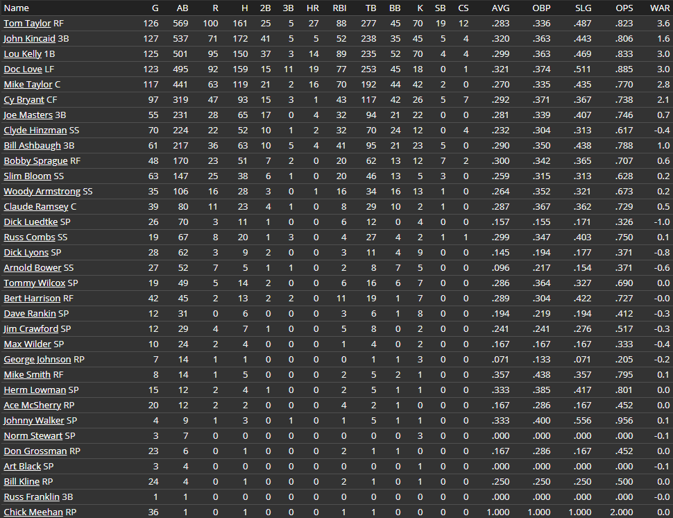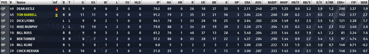 Seasonal Record: 54-56 (6th, 17.5 GB) Stars of the Week Doc Love : 22 AB, 10 H, 1 HR, 6 RBI, .455 AVG, 1.136 OPS Tom Taylor : 25 AB, 9 H, 2 HR, 6 RBI, .360 AVG, 1.069 OPS Joe Masters : 24 AB, 7 H, 0 HR, 0 RBI, .292 AVG, .787 OPS Weekly Schedule 8-6: Win at Foresters (5-4) 8-8: Win vs Sailors (1-6) 8-9: Loss vs Sailors (3-0) 8-10: Win vs Sailors (4-6) 8-11: Win vs Wolves (5-8) 8-12: Loss vs Wolves (8-3) Summary A 4-2 week? Those never happen anymore! We took another series against the Foresters (71-38) with a 5-4 win and then took two of three from the Sailors (56-53). We split the first two with the Wolves (46-63) and have a chance to win the series tomorrow. We then get two off days before heading to Brooklyn for four with the Kings (65-43). They're 5 and a half back of the Foresters, but we've actually played them well so far. I'm not sure we'll play them well this series, but depending on how the series go it could sink or propel Brooklyn. The bats weren't great this week, but add another big week from Doc Love. It bumped him up to third in the CA with a .340 batting average. He continues to rake, batting .455/.500/.636 with a homer and six driven in. He's up to 17 and 67 on the season. He ranks first on our team in average, second in homers, and third in RBI's. Tom Taylor upped his home run count to 24, two ahead of Max Morris for the CA lead. He was 9-for-25 with 2 homers, 6 RBI's, and a stolen base. He hasn't hit great this year, just .276/.328/.483 (101 OPS+), but with 24 homers, 14 steals, and 80 RBI's which would be a 34, 20, 112 pace. After being just slightly below average in his first 40 or so games in center field, he's back up to a +5 zone rating and 1.049 efficiency in 69 starts. His efficiency is best in the league and he sits juts 0.6 back in zone rating, but Frank Lightbody has almost double the innings. I did a little shortstop experiment as all mine suck, with Woody Armstrong and Clyde Hinzman getting two starts and Slim Bloom and Arnold Bower getting a start a piece. Armstrong took advantage, going 3-for-7 with a walk and RBI while Bloom was 1-for-4 with a triple. Hinzman and Bower combined to go 0-for-10, but I still plan on rotating all four. With just five games this week, Armstrong will get two starts and the rest just one. I've also experimented with John Kincaid at second, but it's gone terrible. He's got a -4.1 zone rating and .881 efficiency in 227.1 innings, pretty poor numbers so far. Before this season, Kincaid has almost exclusively played third, but I've been trying him out here with Masters now at third. Eventually the goal is for Masters to go to first, Kincaid back to third, and Kelly out to right, moving Tom Taylor back to center. With a little more time in the Spring Training out in center, I think Taylor can be an above average defender out there. On the mound, Dave Rankin had a really strong outing in a 6-1 win over the Sailors. He tossed a complete game with 10 hits, one run, 2 walks, and 4 strikeouts. This was much better then his last start, also against the Sailors, where he allowed 9 hits, 8 runs, and 3 walks with just 1 strikeout in 5.2 innings pitched. He hasn't been great in his eight starts with us, but he's 3-4 with a respectable 4.43 ERA (104 ERA+), 1.52 WHIP, 16 walks, and 26 strikeouts. Dick Leudtke continued his strong run, but he was tagged with a loss in the 3-0 shutout. He went all nine allowing 7 hits and 3 runs with 2 walks and 3 strikeouts in his third straight complete game with 3 or less runs allowed. He's combined for a 1.67 ERA, 0.89 WHIP, 6 walks, and 8 strikeouts. He's a strikeout away from evening back his walks and strikeouts and his ERA creeped down to 4.53 (101 ERA+). We don't need a fifth starter this week, so Art Black will head down to AAA. His three starts didn't go too well, going 1-1 with a 5.59 ERA (82 ERA+) and 2.17 WHIP. What was most concerning was the 15 walks compared to 6 strikeouts. He does walk a lot of hitters, 53 to 24 in AAA, but he also allowed the same amount of homers (2) in his 18 AAA starts. I'm bringing up 34-year-old journeyman Pete Walker who has been in the Cougars organization since 1925. From 1929-1934 he was in Milwaukee, and has totaled 528.1 innings pitch there. He has a 4.45 ERA (102 ERA+), 1.33 WHIP, 175 walks, and 448 strikeouts. This year has gone well for him, 7-4 with 9 saves, a 3.03 ERA (145 ERA+), 1.32 WHIP, 16 walks, and 23 strikeouts in 71.1 innings pitched. A former 7th Round Pick by Brooklyn way back in 1921, it took Walker 2,138.2 innings of high school, college, and minor league ball before finally making a big league roster. Minor League Report On the 6th in Mobile, right fielder Johnny Waters had a big 5-for-5 game in a 12-5 win over Knoxville. The 22-year-old switch hitter is having a strong year with the Commodores, slashing .333/.358/.464 (117 OPS+) with a homer and 75 RBI's. Despite being a 15th Round Pick in 1932, he's hit at each level on his way up and may end up getting a late season call up to Milwaukee. I wish he had a little more power, as it is really his only weakness at the plate, as Waters has an amazing hit tool and he almost never strikes out. He won't walk, just 16 in 380 trips to the plate, but he has just 8 strikeouts and only 22 all of last season. Of course, he does have a glaring flaw, his awful defense, but that's a worry for another day. Knoxville did have a little revenge, destroying us 22-0 the day after, and they now have a 7 game lead over us for first. Both Ed Grubb and Ed Willson knocked five hits of their own as both Bobby Love and Cy Plummer were absolutely destroyed. Plummer just got the call to AA and allowed 6 hits, 7 runs, and a walk with just one out recorded. Waters was also named Player of the Week, going 15-for-33 with nine knocked in. We had another big game down in La Cross, crushing the Marshalltown Kings 23-7. Switch hitting first basemen Cuno Myer was 5-for-7 with 2 doubles and 4 RBI's while catcher Harry Mead was a perfect 5