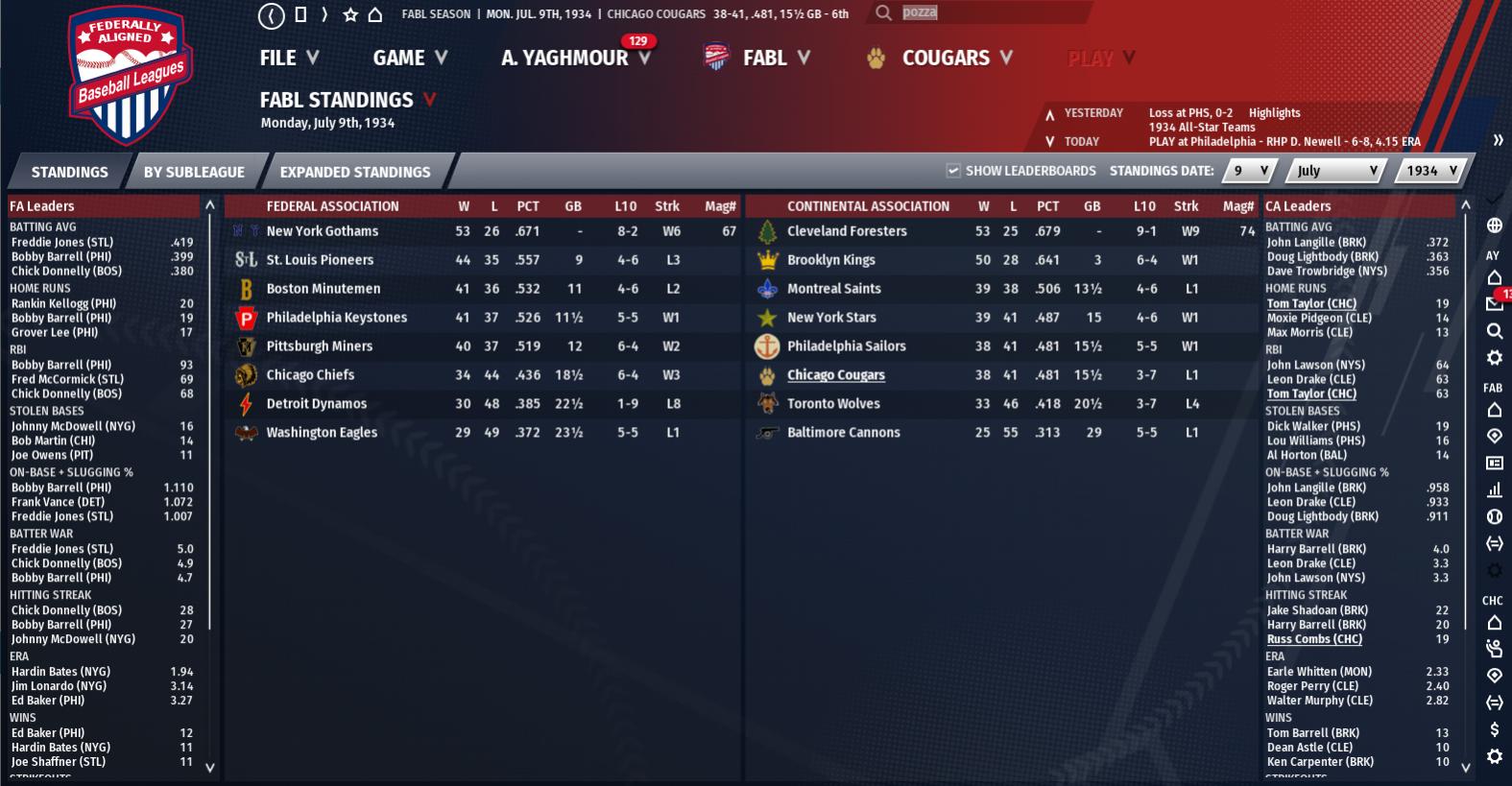 Seasonal Record: 43-48 (6th, 19 GB) Stars of the Week Doc Love : 29 AB, 15 H, 5 HR, 11 RBI, .517 AVG, 1.645 OPS Mike Taylor : 30 AB, 14 H, 2 HR, 9 RBI, .467 AVG, 1.233 OPS John Kincaid : 35 AB, 14 H, 1 HR, 2 RBI, .400 AVG, 1.004 OPS Weekly Schedule 7-16: Win vs Cannons (2-3) 7-17: Win vs Stars (6-14) 7-18: Loss vs Stars (5-4) 7-19: Win vs Stars (4-6) 7-20: Loss vs Stars (6-2) 7-21: Loss vs Saints (11-10) 7-21: Win vs Saints (2-4) 7-22: Loss vs Saints (16-11) Summary Not going to lie, I still have not recovered from the Tommy Wilcox injury, but I am going to do my absolute best not to mention it every sim. No promises, but I'll try to cover the better stuff. This was a mediocre week, 4-4, but when Norm Stewart and Herb Lowman have to make starts in a season that doesn't matter, 4-4 almost feels good. As crazy as it seems, we'd pick 6th in the draft if the season ended now. We conceivably could pick top five and after another injury (Bill Ashbaugh) chances are we are going to keep on losing more. The Wolves and Chiefs are tied for the fourth pick at 39-51 while Detroit (35-54), Washington (31-58), and Baltimore (29-63) are the top three. This was a weird week, but Doc Love took home Player of the Week. He crushed the ball like I thought he would at home, going 15-for-29 with 5 homers and 11 RBI's. He really heated up this month, batting .393/.452/.667 with 7 homers and 16 RBI's in 21 games. For the season he boosted his batting line to .332/.379/.529 (125 OPS+) with 14 homers and 50 RBI's. He's on pace for 24 homers and 85 RBI's in his first full season as a starter. He's not the best defensively, but he more then makes up for it at the plate. Love likely had the best offensive week of the entire year (303 OPS+), but both Mike Taylor and the now injured Bill Ashbaugh did excellent. Taylor was 14-for-30 with 2 homers and 9 RBI's while Ashbaugh was 5-for-11 (got hurt game four) with a homer and 3 RBI's. Taylor was named an All-Star, but he's hit just .280/.340/.453 (97 OPS+) on the season. He's hit 13 homers and drove in 51 RBI'S and he's on pace for his third straight 20+ home run season. Taylor still is one of the best catchers in the game, but he's having such a poor season in comparison. His career average is .312/.377/.487 (126 OPS+) and he consistently put up excellent seasons. In his six previous seasons, he had a 125 or higher OPS+ in all but his 1930 season. It's nice he's also starting to heat up, but I'd love it if he saves all the good weeks for next year. Ashbaugh will miss at least five weeks with a sprained knee, so he's almost guaranteed to have his worst season. He's hitting just .290/.350/.438 (96 OPS+) with 4 homers, 5 steals, and 41 RBI's in 243 trips to the plate. This is after three straight seasons with exactly a 124 OPS+ and 10+ homers and 75+ RBI's. Unfortunately for us, the 20+ homer and 100+ RBI Ashbaugh is a thing of the past and this is injury #10 for the 30-year-old. The former 4th Overall Pick will hit the DL which opens up more playing time for Woody Armstrong and Clyde Hinzman. A few other Cougar hitters had strong weeks, including Joe Masters who really struggled his first two weeks as a Cougar. He was 12-for-32 with 7 RBI's. He's done awful as a shortstop, but John Kincaid hit .400/.432/.571 with a steal, a double, triple, homer, and 2 RBI's. Like many other Cougars, 1934 has been a career worst, batting .336/.378/.453 (107 OPS+) with 3 homers, 3 steals, and 36 RBI's. Cy Bryant did well too, going 13-for-30 with a triple and 6 RBI's. On the pitching side, it was kind of a nightmare. Dick Lyons looked well in his two starts, 2-0 with a 3.68 ERA, 1.57 WHIP, 2 walks, and 3 strikeouts, but Norm Stewart and Herb Lowman were roughed up. Stewart made his first two big league starts of the season and they could not have gone much worse. He gave up 28 hits and allowed 12 runs in 13 innings with 5 walks and 4 strikeouts while we lost both of his starts. Lowman got a no decision, but allowed 7 (6 earned) with 12 hits, 2 walks, and 4 strikeouts in 6.1 innings. Even Dave Rankin struggled, allowing 12 hits and 4 runs in 7 innings with 2 walks and 6 strikeouts, but at least he picked up a win. Dick Leudtke split his starts, going 15.1 with 22 hits, 8 runs, 7 walks, and 7 strikeouts. We allowed 52 runs in the eight games so even though we scored almost seven a game, we still lost half of them. A healthy Wilcox would have got the two Stewart starts, so I'd have to imagine this would have been a 5-3 if not 6-2 week. The 5-4 loss to the Stars could have still been a loss with Wilcox, but I can't imagine Wilcox would've gave up 11 runs to the Saints. Of course, with Ashbaugh going to the DL, I get to call someone up from AAA. Art Black will make his major league debut, making him the 26th of our 30 top prospects from 1929 to appear in an FABL game. Black will move Lowman back to the pen, and will get a few starts to show me what he can do. Norm Stewart will get at least one more go around, but I've got a bunch of AAA arms that could replace him. I could bring back Johnny Walker, who tossed a 5-hit shutout in his return to AAA or perhaps one of the former Toronto starters Frank Howk or Bert Sweet. I could bring Gus Cain or Mickey Williams up, but Williams had only made a few AAA starts and Cain has been used mostly out of the pen. Even below AAA are a few big league options, including Gordie Thompson, Bobby Love, or Joe King who would all be set to debut. Former Forester Harvey Tully and former Cougar Tommy Russel make up the AA rotation with them and I even have former Gotham Phil Hicks down in A working on regaining his form from when he was taken 5th Overall in 1928. I have the rest of the season to look forward to 1934, as I have at least two open rotation spots with no Wilder and no Wilcox. Speaking of Wilder, he lasted just 7 starts in the FA before heading back to the CA. He was traded to the Kings who are looking to reach the Foresters who sit five games ahead of them. 