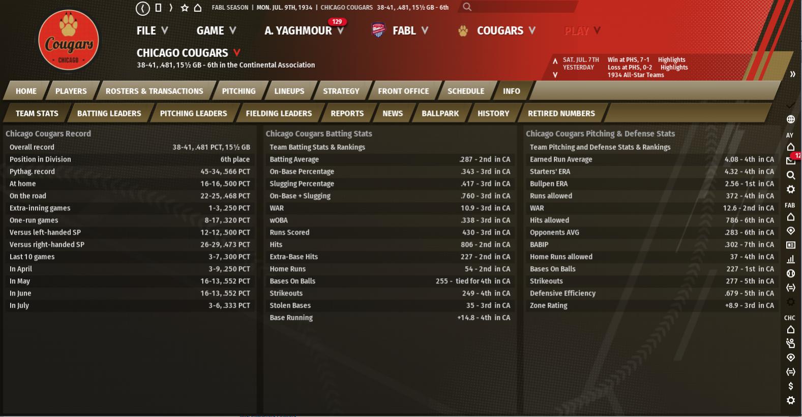 Seasonal Record: 35-36 (6th, 11.5 GB) Stars of the Week Tom Taylor : 23 AB, 8 H, 1 HR, 3 RBI, .348 AVG, .913 OPS Tommy Wilcox : 1 Win, 9.0 IP, 4 BB, 3 K, 0.00 ERA John Kincaid : 20 AB, 7 H, 1 HR, 1 RBI, .350 AVG, .909 OPS Weekly Schedule 6-25: Loss at Saints (3-8) 6-26: Win at Saints (5-4) 6-27: Loss at Saints (1-2) 6-28: Win at Saints (6-0) 6-30: Loss vs Sailors (3-4) 7-1: Loss vs Sailors (0-1) Masters and Rankin can't get back soon enough! The Saints series was solid, but we could not score against the Sailors and three of the four losses this week were just by one run. We're an impressive 8-15 in one run games which is more or less a recipe for disaster. In other weekly news, both Rankin Kellogg and Tom Taylor added another homer so they're both still tied at 18. Taylor has a five homer lead in the CA with Moxie Pidgeon in second at 13. Taylor was also named the CA Batter of the Month. He hit .314 with 8 homers, 24 RBI's, and 28 runs scored. He added 6 steals, 5 doubles, and 2 triples. He has a legit chance to hit 40 for the second time in his career and he's 9 homers away from 200. His 191 are 10th all time, but he has five active players ahead of him including his new teammate Joe Masters and Lou Kelly. He's also going to spend much more time in right which should give him a nice WAR boost. He actually did really well in center all things considered, with a 1.001 efficiency and -0.5 zone rating in just 349.1 innings. In his career, he just has 543 innings. With very little experience, he was basically average. Of course he's no Cy Bryant, who somehow has a +3.9 zone rating despite not having enough innings to qualify for efficiency. His 1.049 would be just below Pablo Reyes who gets the advantage of playing in Montreal. The entire stadium is very big, and his centerfield is a square not a "W" like ours (I feel like this is really hard to visualize) as the 319-392-402-411-397-358-334 dimensions sort of form a box out in center at the Parc Cartier. Don't get me wrong, Pablo Reyes is amazing. He's just not Cy. There wasn't much good this week, but the best decision I made was pitching Tommy Wilcox on short rest against the Saints before an off day. He was brilliant, tossing a 5-hit shutout with 4 walks and 3 strikeouts. As crazy as it seems, his 3.14 ERA this year has a better ERA+ (146) then his league leading 2.58 ERA (146 ERA+) last season. He's approaching .500 again and in his last five starts he has three complete game shutouts and a 1 earned run start. He's putting the team on his back right now and he's not giving up any hard contact and he hasn't allowed an extra base hit in either of his last two starts. Interesting enough, the best start of the week might have been courtesy of Johnny Walker. He lost on the 1st, but allowed 7 hits, a walk, and struck out 6 with just one unearned run. In three starts in the big leagues he's 1-2 with a 3.60 ERA (127 ERA+), 1.44 WHIP, 14 walks, and 11 strikeouts. I was afraid he wouldn't pitch this well, so I had Phil Hicks ready in case I needed another starter. Instead, he'll be waived back and may end up getting claimed. If Dick Leudtke can just stop sucking, our rotation should look really scary. Wilcox and Lyons atop with Rankin sliding back in. Our defense is better, but the double digit deficit looks scary. Unfortunately, we did not hit at all this week. Other then Taylor, the only one who sort of did anything was John Kincaid. He was 7-for-20 with a solo homer. Lou Kelly was just 2-for-23 and Mike Taylor 2-for-18. Yes, it's impossible to hit in Montreal, but by time we came to Chicago we should have been able to score at least one run off the 26-year-old waiver claim George Johnson. Now that Joe Masters joins the lineup, things are going to be a little bit different for the lineup. There will be a lot of rotation between my players, and this is going to be a position map. I'm not saying these guys will make starts at each position each week, but I do expect these guys to make starts at these positions a few times a month. Mike Taylor: C Lou Kelly: 1B/LF/RF Bill Ashbaugh: 2B/1B Joe Masters: 3B/1B John Kincaid: 3B/2B/SS Woody Armstrong: SS/2B Clyde Hinzman: 2B/SS Doc Love: LF/RF Cy Bryant: CF Tom Taylor: RF/CF Russ Franklin will head right back down to AAA as Masters and Rankin (added the g...) join the active roster. We have one more home game against the Sailors and then we'll head to Cleveland (45-25) for a tough three game series with the Foresters. The scheduling kills us, as we have to head home for a double header with the Wolves (31-40) before finishing the first half of the season in Philly for three more with the Sailors (35-36). We're almost at the All-Star Break and I don't expect us to have too many this year. I'm submitting my ballot, and I included Tommy Wilcox and Tom Taylor plus both Tom and Fred who we traded for Wilcox. Wilcox definitely deserves to be an All-Star and I couldn't not include the CA home run and RBI leader especially because he's a Cougar. The All-Star break should help us stay fresh and it could be exactly what we need to right the ship. A little minor league news as well. I just started giving Tom Spitzer more at bats and he returns the favor with a big 5-for-5 game in a 12-3 win. In 27 games this year, the 23-year-old Spitzer hit .390/.430/.540 (155 OPS+) with 20 RBI's in 100 at bats. The former 7th Rounder started out as a shortstop, but he's moved to third before starting to play some second base so I could keep his bat in the lineup. Freddie Bennett was named UMVA Player of the Month. The former 12th Rounder hit .309 with 5 homers and 24 runs driven in and scored in a strong month. He had a tough start to the season, but has brought his batting line up to .266/.326/.505 (99 OPS+) with 15 homers, 70 RBI's, and 9 steals. I never expected to see this much power for Bennett who is just one homer shy of his total in high school. He's looked strong defensively as well and has some experience at all four in