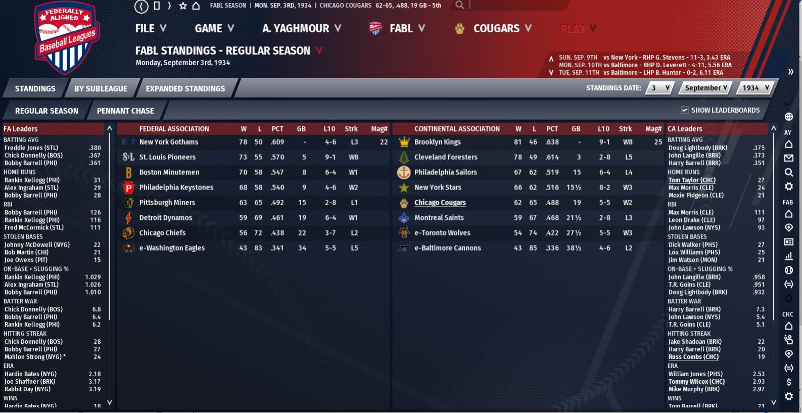 Seasonal Record: 59-63 (6th, 19 GB) Stars of the Week Lou Kelly : 26 AB, 10 H, 1 HR, 4 RBI, .385 AVG, 1.192 OPS Tom Taylor : 31 AB, 10 H, 1 HR, 3 RBI, .323 AVG, .855 OPS Mike Taylor : 18 AB, 6 H, 1 HR, 2 RBI, .333 AVG, 1.056 OPS Weekly Schedule 8-20: Win at Stars (8-4) 8-21: Loss at Stars (5-10) 8-22: Loss at Stars (6-7) 8-23: Loss at Stars (2-4) 8-24: Loss at Saints (4-5) 8-25: Win at Saints (5-2) 8-26: Win at Saints (5-2) Summary Another mediocre week during the mediocre season where we sandwiched a four game losing streak in the middle. Two more one run losses and no more one run wins, but a pair of 5-2 wins in the middle of the Montreal (58-61) series. We did get a win on my birthday to finish the week, but I almost rather lose so we pick higher. We've been stuck in the six spot most of the past couple months, but we just hang around winning and losing almost an equally amount of games. We're off after a final game with the Saints and then we head to Baltimore (41-82) for three with the Cannons before another off day. That off day is roster expansion, so expect some new Cougars to join the team. For sure Herb Lowman will come back from rehab next sim. Bill Ashbaugh is finally healthy, so he'll get at least the week in the minors. I think I'm going to give him some reps at third to see how he can handle it. The goal for next year is to have him and Russ Combs split reps at second so they can hopefully stay healthy the whole season. We don't need a fifth starter this week, but I think Ace McSherry earned a few more. He made two this week and won both. Against the Stars he went 6 with 5 hits, 4 runs, and a strikeout. He did walk seven, which is very concerning, but it's not like George Johnson is any better. His second start was much better, a complete game victory with 5 hits, 2 runs, a walk, and a strikeout. He hasn't made a big league start since the 13 he made in 1930, but the flamethrowing sidewinder has put together a rather solid season. He's 3-2 with 2 saves, a 2.72 ERA (168 ERA+), 1.15 WHIP, 19 walks, and 15 strikeouts in 43 innings. The 31-year-old still profiles as more of a pen arm, and if I bring up someone like Black, Stewart, or the now struggling Johnny Walker, McSherry will give up some starts to them. I'm thinking about running a more lax rotation in September to make sure Lyons, Leudtke, and Rankin all stay healthy. I'm already down one starter for 1934 plus the fact we don't really have a reliable fourth option. I'm likely going to search for a starter in the offseason, but I think our new contention goal is 1935. We have a few holes now and without our best player it is going to be hard to compete with Brooklyn and Cleveland next year. Speaking of struggling to compete, both Dick Lyons and Dick Leudtke had rough outings. Lyons also had a good one, a complete game win on the 26th with 7 hits and 2 runs, but the Stars destroyed him. He allowed 10 hits and 7 runs with a walk and strikeout in just 2.2 innings pitched. He did excellent the first four months of the season, but August has just sucked. He's 2-2, but with a 6.90 ERA, 1.70 WHIP, 3 walks, and 5 strikeouts in 30 innings. He's averaging just 6 innings a start and he just forgot how to strikeout hitters. For the season he's 10-8 with a 4.39 ERA (104 ERA+), 1.54 WHIP, 41 walks, and 58 strikeouts in 180.1 innings pitched. Leudtke didn't really do that bad, but he was so hot that it felt worse. He lost the 7-6 game, going 7 with 10 hits, 4 runs, a walk, and 3 strikeouts. Dave Rankin pitched fine in his start, 8 innings with 8 hits, 4 runs (2 earned), 3 walks, and 4 strikeouts. I did a little restructuring in the bullpen as well. Chick Meehan has really struggled, allowing 6 runs (4 earned), 5 hits, 3 walks, and 2 strikeouts in his last two appearances (2.2 innings). The generally automatic Meehan has allowed 17 earned runs in 23 innings since July 1st. 6 of his 13 walks have come in August and he's really inflated his season stats. His ERA is up to 4.80 (95 ERA+) and his WHIP up to 1.60. He's struck out 25 in 45 innings, which is still really good, but the pressure has gotten to him and I'm moving him down to middle relief for likely the rest of the season. The new stopper will be former Minor League Rule-5 pick Don Grossman. Way back when, I posted this: Starting with the minor league draft, I got SP Don Grossman and lost no one. Grossman is a 24-year-old who the Boston Minutemen took in the 4th Round of the 1924 draft. He's been in that organization ever since, and spent most of last year in AAA. He was 2-9 with a 4.33 ERA (95 ERA+), 1.52 WHIP, and 111 strikeouts. I took him because of his height, he stands 6'6'' and throws a devastating sinker that is almost impossible to hit. He gets a ton of downward movement to generate numerous double plays with his mid to low 90s sinker. His problem is that none of his other pitches are any good, so if he throws anything other then a sinker he gets hit hard. I plan to use him as a pen arm and he could develop into an excellent stopper.(1930 Offseason) After training Grossman as a reliever for a long time, I'm starting to reap the rewards. The 28-year-old ranks as the best relief pitcher in our organization and he's looked really good as a rookie. He's 2-1 with a 2.89 ERA (158 ERA+), 1.26 WHIP, 18 walks, and 13 strikeouts. I really thought he'd strike out more batters, but I expect him to pick up the numbers as he gets more comfortable in the big leagues. More likely then not, even if he gives up more runs then innings, he'll remain the stopper the rest of the season. Meehan is 37 and won't pitch forever, so either him or Bill Kline will likely start next season as the stopper. Kline, our former 2nd Rounder, has had another strong season. He's 4-2 with 3 saves, a 3.45 ERA (133 ERA+), 1.15 WHIP, 7 walks, and 16 strikeouts and he's done really well as a setup man. In parts of four seasons he's tossed 96.2 innings with a 2.70 ERA (168 ERA+), 1.24 WHIP, 24 walks, and 36 strikeout