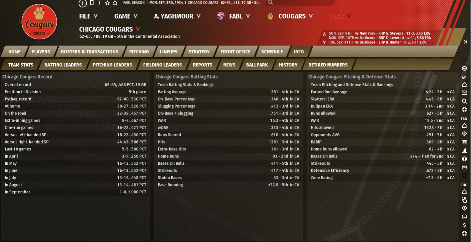 Seasonal Record: 56-59 (6th, 18 GB) Stars of the Week Tom Taylor : 22 AB, 8 H, 1 HR, 2 RBI, .364 AVG, 1.076 OPS John Kincaid : 23 AB, 8 H, 0 HR, 5 RBI, .348 AVG, .812 OPS Joe Masters : 20 AB, 6 H, 1 HR, 3 RBI, .300 AVG, .964 OPS Weekly Schedule 8-13: Win vs Wolves (4-5) 8-16: Loss at Kings (6-8) 8-17: Win at Kings (5-2) 8-18: Loss at Kings (3-5) 8-19: Loss at Kings (1-3) Summary We won the finale against the Wolves (48-66), but then dropped three of four to the Kings (69-44) who are now within four of the Foresters (74-41). We spend the rest of the month on the road, starting with the Stars (57-59) who we are sort of fighting for to earn the sixth pick of the draft. Next is Montreal (56-56) before an off day where we'll head to Baltimore to take on the Cannons (38-78). As usual, most of the team decided to play poorly, although Tom Taylor raked all week. He was 8-for-22 with a homer, steal, and 2 RBI's. He's up to 25 homers on the season, although Max Morris is now just a homer behind him. He didn't have much help this week, but at least Joe Masters continued to turn things in the right direction. He was 6-for-20 and added on another homer and 3 RBI's. He's hitting just .276/.333/.414 (86 OPS+) as a Cougar with 3 homers and 22 RBI's. Looking at the bad, Mike Taylor, Cy Bryant, and Lou Kelly combined to hit 7-for-59. I cannot understand how Taylor has struggled so much, batting .266/.323/.426 (86 OPS+) with 14 homers and 65 RBI's in 443 trips to the plate. It's been a really disappointing season for the 28-year-old. He's never struck out more then 30 times in a season and he's already up to 40. He usually averages 67 walks and 26 in a 162 game stretch, but he's only walked 35 times this year. I'm hoping this is just a one season thing, as Taylor is still ranked as the 4th best catcher in the league despite how awful the season has gone. Every other hitter on our team except Doc Love (who actually now ranks 1st in LF) has dropped 3 or more spots. Lou Kelly has also struggled immensely, and perhaps I should have expected it. His .288/.346/.429 (93 OPS+) batting line is easily the worst of his career and his 10 homers are likely going to end up less then his career low of 20 last season. At 32, he has 200 career homers and from 1928-1932 he hit 30 or more homers with 100 or more RBI's. I wish that Lou Kelly would surface next season, but he may have to fight for playing time next year. It was another strong start for Dick Leudtke, who got the only win against the Kings. Another complete game, this time with 12 hits, 2 runs, and 2 strikeouts. He's back above 1 K/BB and the soon to be 33-year-old seems to be way past his awful April and May. George Johnson had his first good start with us, going 8 with 8 hits, 3 runs, 3 walks, and 2 strikeouts in a loss to his former team. In his four starts with us, he's 1-3 with a 6.07 ERA (76 ERA+), 1.89 WHIP, 12 walks, and 9 strikeouts. Chances are he won't make the team next season, but at least until rosters expand he'll get a few more starts. Herb Lowman is going to be stretched out in AAA and Ace McSherry will get a start or two. Chances are Johnny Walker or Norm Stewart will eventually take a bulk of the back end starts in the final month of the season. Pete Walker did get to make his big league debut, allowing a hit and striking out one in a scoreless frame on the 16th against Brooklyn. After 1,802.2 minor league innings, he got to finally make a pitch in the big leagues. In sadder news, Tommy Wilcox ranks second in the league in ERA and third in all of baseball is 2.93 ERA in 153.2 innings pitched. If he had a third more of an inning, he would qualify once the season ends as we play 154 games during the season. With William Jones' 2.32 ERA, he likely wouldn't have repeated as ERA champion, but now I have to see him in the standings page for the rest of the season... And then when I got his scouting report "he'll be on the shortlist for top starters in baseball" I could almost feel a tear come out... Only 12 more months... Only 12 more months... Only... 12... more... months... We got to witness 36-year-old Ken Carpenter win his 200th FABL game. After spending his whole career with the Cannons before being traded this season, he won 188 games with them since 1921. A former 3rd Round Pick in 1917, he has a 3.93 EARA (107 ERA+), 1.39 WHIP, 972 walks, and 1,194 strikeouts in 3,373.1 career innings. Since coming over to the Kings, he's 12-3 with a 3.67 ERA (121 ERA+), 1.28 WHIP, 33 walks, and 61 strikeouts in 137.1 innings pitched. Minor League Report So some good and some bad when it comes to Karl Wallace. Starting with the bad, the 20-year-old has made 10 starts in San Jose and all ten of them have been, well, bad. He's 0-7 with a 7.41 ERA (66 ERA+), 1.92 WHIP, 19 walks, and 23 strikeouts. Yeah, not too exciting... So, what's the good? My scout has finally realized how great his potential is! Dubbed with "frontline starter potential" Wallace has always had excellent tools, the strong control and excellent mid 90s fastball, but now my scout finally sees it too! He probably is overmatched in San Jose, but with the Class C season almost over I'm hoping a redo next season will eventually see him put things back on track, but the talent is there. Wallace is up to 58th in the prospect lists and 2nd of all our pitchers (behind Cy Sullivan). The baby Cougars have a month left in their season so he has about five starts left, and I'm hoping there is more of the 6 inning, 7 hit, 2 run outings like his last one. It's one of only two of his starts with three or less runs and let's hope the rest follow. In completely good news, I recently promoted left fielder Larry Robison to Lincoln and he was named Heartland League Player of the Week. He was 16-for-32 with nine runs driven in. It was a rough start for him, but he's brought his batting line up to .282/.320/.366 (78 OPS+) with 3 triples and 18 RBI's. Amateur Report It's a little harder then before to find good amat
