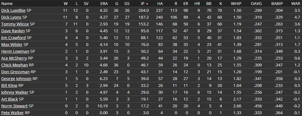 Seasonal Record: 38-41 (6th, 15.5 GB) Stars of the Week Doc Love : 36 AB, 12 H, 2 HR, 4 RBI, .333 AVG, .896 OPS Tom Taylor : 39 AB, 12 H, 1 HR, 4 RBI, .308 AVG, .761 OPS John Kincaid : 37 AB, 13 H, 0 HR, 3 RBI, .351 AVG, .730 OPS Weekly Schedule 7-2: Loss at Sailors (5-7) 7-3: Loss at Foresters (1-2) 7-4: Loss at Foresters (1-6) 7-5: Loss at Foresters (2-3) 7-6: Win vs Wolves (11-13) 7-6: Win vs Wolves (4-7) 7-7: Win at Sailors (7-1) 7-8: Loss at Sailors (0-2) Recap Umm, can it get any worse? At this point, not so sure. The All-Star break could not have come soon enough as getting swept by the Foresters and dropping five in a week is just another nail in the coffin. We ended up with just three All-Stars, the two I voted plus Mike Taylor. Tom is a fully time All-Star, but the former Kings Wilcox and Mike Taylor are two-time. Looking at our two new acquisitions, Joe Masters had a rough week, hitting just .229/.282/.286 (43 OPS+) with 6 RBI's. Rankin picked up two losses, but one wasn't too bad. He pitched the 8th, allowing 8 hits and 2 runs with a walk and strikeout in 8 innings. I think I might try out a four man rotation. Johnny Walker won't be needed this week, so he'll head down to AAA and Bill Ashbaugh can come back from the DL. If we have a lot of games, I still have pen guys I can slide in like Lowman or even one of McSherry or Grossman could make a start. We have a double header on the 21st, so we definitely have to use a spot starter then. And poor Tommy Wilcox... Seven day lineups kind of screwed him up because I had him starting the 3rd and then the 7th (short rest because of double header). He pitched valiantly in a 2-1 14 inning loss. He managed to throw almost 200 pitches in 13.1 innings. He allowed just 8 hits, 2 runs, and 3 walks with 4 strikeouts before a Moxie Pidgeon sac-fly ended the game. He then had to pitch on three days rest against the Wolves. He mustered up just 4 innings and 72 pitches before leaving in the win. Regardless, he only allowed 13 total hits, 3 runs, 3 walks, and 6 strikeouts in 17.1 innings in four days. I really hope they give him the All Star game off... But, since we are at the half way point, let's do a midseason review: Let's start with the offense. That's been what's good. We don't lead in any category, but we're back up to top 4 in all categories as our baserunning is up to 4th. We've scored 430 runs with 372 runs allowed, so based on the always taunting Pythagorean, we sit 38-41 when we should be 45-34... Not great, but not 300 games out of first place. Just eight and a half. Still tough, but not impossible. We've hit .287/.343/.417 as a team with 54 homers and 35 steals. On the pitching side, it's been much worse. The pen is strong and we don't walk anyone, but the exciting thing is how things are trending up. Our ERA both overall and for starters are back up to 4th (just like runs scored) and the defense is vastly improving. Our zone rating is back up to third and efficiency to 5th after spending most of the year in 8th. We do have a few really bad categories, with hits (6th), average (6th), BABIP (7th), and strikeouts (5th) all in the bottom half. So, has any individual been that good this year? Well... We've just been painstakingly average... Every hitter in our lineup has an OPS+ between 90 and 110. This accounts for Love, both Taylors, Kincaid, Kelly, Hinzman, Armstrong, Bryant, and Ashbaugh. What I think is crazy is that Kincaid, Mike Taylor, Kelly, and Ashbaugh are all simultaneously having their worst offensive seasons. And Tom Taylor basically is too. In order, their previous OPS+ lows are 110, 119, 106, 125. Tom Taylor's pervious low was 97, but that was his injury ridden 1930. The next low was 121. This year, they're at 104, 100, 91, 96, and 104 compared to their career averages of 118, 150, 126, 129, and 143. So basically my five best hitters all decided that this was the perfect season for them to all not show up... Granted, this is a little unfair to Tom Taylor. The other four are doing bad, but at least he's producing. He's hitting .276/.326/.500 with 19 homers, 11 steals, and 63 RBI's. That's a really strong statline for the Canadian Club who has a comfortable 5 homer lead in the CA with a one RBI deficit between him and John Lawson. Him and Doc Love have really been the lone bright spots, but even Love is hitting just .315/.356/.487 (109 OPS+) with 9 homers and 38 RBI's. I just need one guy (fingers crossed it's Masters or Kelly) to explode. I already mentioned Tommy Wilcox, the ultimate pitching God. Somehow, he's even better this year even though literally every player on the roster has done worse this season then last. The 6'4'' righty is still on track to lose 20 games, but his 7-10 record does not do his performance justice. He has a 2.95 ERA (155 ERA+), 1.19 WHIP, 34 walks, and 59 strikeouts in 149.1 innings pitched. He's started two more games then anyone else in the rotation and he's probably thrown 800 more pitches. But it does not matter. This kid just goes all out. Well, ever since 1932... I just love how (as expected) my "WHY DOES THIS GUY SUCK SO MUCH" has changed to "WHY IS THIS GUY SOOOOOOO AMAZING!" as it seems he just finds new ways to surprise me. Dick Lyons has done well too, 5-4 with a 4.08 ERA (112 ERA+), 1.53 WHIP, 31 walks, and 35 strikeouts in 114.2 innings pitched. His fellow Dick Leudtke has fully reverted to 1929 Gothams Leudtke who was dominated in relief. His record is almost identical to Wilcox at 7-9, but I'm sure you can tell that his 5.24 ERA (87 ERA+), 1.58 WHIP, 48 walks, and 43 strikeouts look much different. I haven't had to endure a season like this in awhile. Leudtke has never walked more hitters then he struck out. Even in 1929 in 8 starts in AAA he had equal, but not more. Even his standalone starts in 1924 and 1926 had more strikeouts then walks. He averages a full strikeout more per nine then walk. And now he's just walking everyone. So what's happened this year? Well, it's been a m
