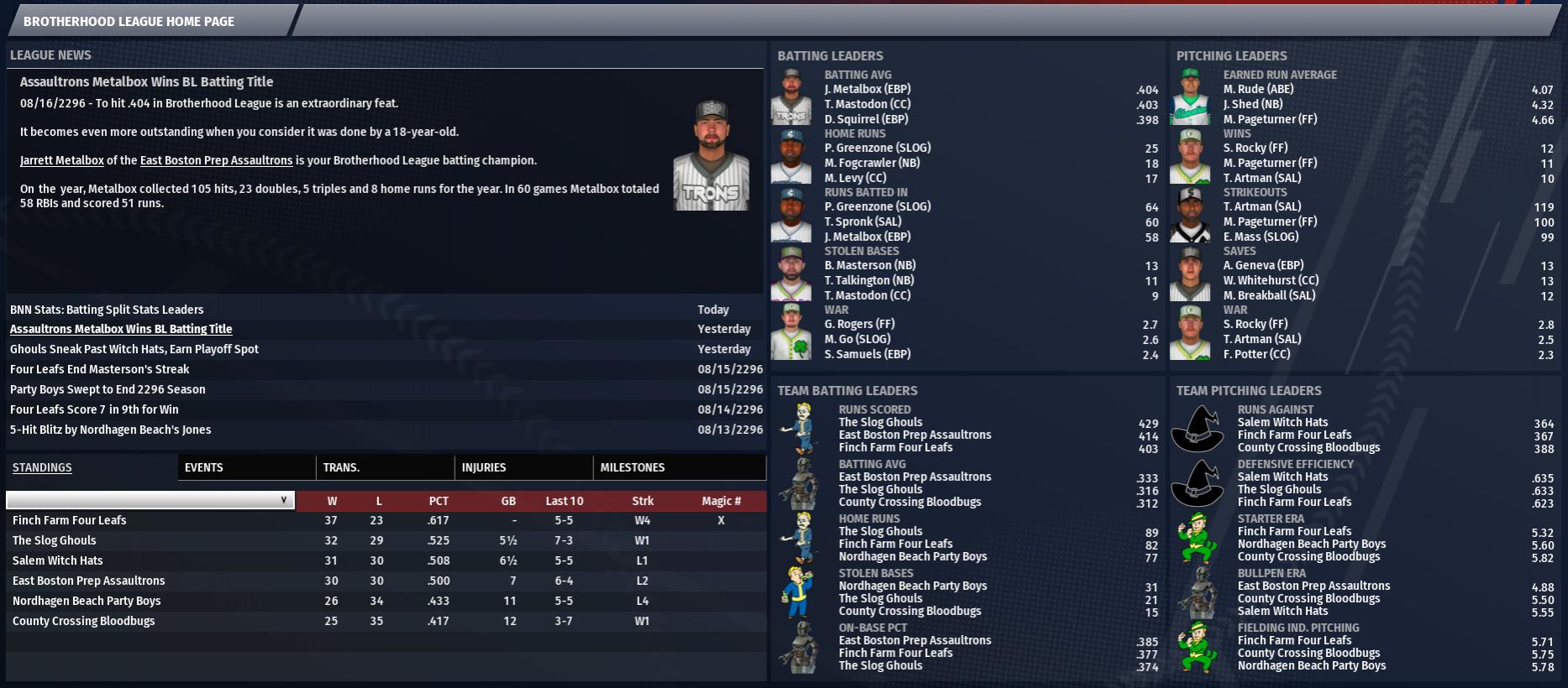 Today in the CBO News and Notes - Reports from around the Commonwealth by Nat Wright-Kowalski 12 August 2296 - Oberland Closer to Miss Weekend Oberland T-51s closer Aaron Still will be unavailable in the closing weekend. Still, who was jerking and twitching erratically during a team meeting, was suspected of being under the influence of Psycho. August Oberland announced after the meeting that Still was not playing in the final weekend, probably for chem suspension. Still was not seen after the team practice at Egret Tours Marina, but there was apparently a brahmin heading north towards Vault 81. Dr. Jacob Forsythe at Vault 81 treats chem addictions, in addition to medical problems. Still is 4-3 with 14 saves out of 18 attempts and a 3.68 ERA on the season. The 7th-round pick of the T-51s, he has allowed 12 earned runs on 30 hits with 14 walks and 44 strikeouts in 29.1 innings. Still is considered one of the better relief pitchers in all of the CBO, and he will be a valuable player for the playoffs. Oberland has already clinched the Railroad League at 40-17. They finish the season at the Egret Scrappers, who will represent the RL as the wildcard team. The Scrappers are 33-24 which would place them as the 6th seed in the eight-team tournament if the playoffs started today. Egret is looking to avoid having to play either Oberland or the Warwick Mirelurks in the first round. 13 August 2296 - Four Leafs Sneak Past Party Boys, 14-13 The Finch Farm Four Leafs defeated the Nordhagen Beach Party Boys, 14-13, at Finch Family Park. Finch Farm second baseman Alec Bullets had a superb performance. He went 3 for 5 with 3 doubles and a walk, while scoring 4 runs and driving in 5. Steve Warwar, now 1-0, was credited with the win. He allowed no runs on no hits, while striking out 1 and walking 0. The victory gives Finch Farm a record of 35-23. The game was decided with two outs in the bottom of the ninth. With Finch Farm trailing 13-12, Danny Honeycutt hit a curveball from Sia Abber to center for a 2-run single. Just like that, the Four Leafs had a walk-off win. "Say want you want about this team, they play nine innings hard," said Finch Farm manager Jake Finch. 13 August 2296 - 5-Hit Blitz by Nordhagen Beach's Jones A big day at bat for Tomas Jones of the Nordhagen Beach Party Boys still ended with a loss. The Nordhagen Beach center fielder did all he could do, going 5-for-5, but it was not enough to overcome the Finch Farm Four Leafs. They triumphed over Nordhagen Beach 14-13 at Finch Family Park. Tomas Jones hit an RBI double in the 1st, doubled in the 3rd, singled in the 5th, hit a two-run double in the 6th, walked in the 7th and singled in the 8th. This year Jones is batting .381 with 96 hits, 8 home runs, 43 RBIs, 18 walks, .422 OBP and has scored 46 runs. 13 August 2296 - Iddings Hot, Deathclaws Cold It wasn't easy but Bruce Iddings made it look that way. Iddings silenced the University Point Deathclaws, 17-0, in a Goodneighbor Hancocks triumph at Third Rail Stadium at S. Boston HS today. Despite the appearance of dominance, Iddings said later that he felt like he was struggling all game. He gave up no walks and 5 hits. "It didn't feel quite right today, but I made the decision to bear down and work through it," he said. "I made a few mistakes but it goes to show what you can do with grit and not much else." In 20 starts this year Iddings has posted 9 wins while suffering 8 losses. He has pitched 139.2 innings, allowed 172 hits, struck out 110 and has a 5.35 ERA. 13 August 2296 - Clutch Hitting Delivers Win for Gunners The home crowd had a good time watching the Atom Cats and Quincy Gunners get after it. Quincy shortstop Robbie Adams contributed to his team's 7-4 win over the Atom Cats. Adams, who is on pace for 41 RBI this season, went 2 for 4 with 2 runs scored to lead the offensive attack for the Gunners. Reliever Ryan Kazarian picked up the win. His record improves to 1-0. Matt "Ace in the Hole" Hope took the loss. Adams had a clutch at-bat in the bottom of the eighth for the Gunners. Coming up with the bases loaded and Quincy trailing 4-3, he hit a 2-run single. "Robbie is still learning," said Gunners manager Little Larry. "The sky's the limit for him." The win gives Quincy a season record of 29-29. With a sweep over the Cats, they have a chance of earning the wild card spot out of the Minutemen League. 14 August 2296 - Four Leafs Score 7 in 9th for Win Nordhagen Beach left fielder Michael Fogcrawler was sensational. He went 2 for 4 with 2 home runs and a walk, while adding 3 RBI and scoring twice, but it wasn't enough to rally his team to a win. Finch Farm beat the Party Boys, 13-12. Finch Farm is now riding a 3-game win streak. The game was decided with one out in the bottom of the ninth. With Finch Farm trailing 12-11, Ginger Rogers hit a curveball from Sia Abber to center for a 2-run single. Just like that, the Four Leafs had a walk-off win. Just like that, Abber blew his second straight save attempt. "We put it together today and came out with the win," Rogers said in postgame remarks. "That's the main thing." 14 August 2296 - Quincy Wins Again, Trails Wild Card Race by 1 Game Quincy left-hander Manny McDuff pitched his team to victory over the Atom Cats at The Stone House. The final score was 6-2. Quincy has now won 3 straight, while the Cats have lost 6 in a row. With the win, the Gunners are now just one game behind the Cats for the Minutemen League wild card spot. In the bottom of the first, Quincy catcher Stuart Costantino had a productive at-bat. With runners on 2nd and 3rd and one out, Costantino stroked a 2-run single to center. It made the score 3-0, Quincy. For the game, he was 2 for 4 with 2 singles. He drove in 2 runs. "It's nice to come out on top today," said McDuff. Goodneighbor lost earlier today, eliminating the Hancocks from the race. Now, tomorrow's Game Three will determine if the Cats are in or if they have to play Quincy one more game for the wild card spot. 14 Aug