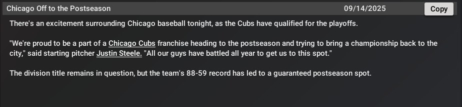 At 88-59, the Cubs lead the St. Louis Cardinals by 10.5 games in the National League Central Division with 15 games remaining in the regular season. In the race for the top seed in the NL playoffs, the Cubs trail the NL East-leading Atlanta Braves by 6.5 games. The playoff berth is the first for the Cubs since 2020. Chicago last made the World Series in 2016 when it defeated the Cleveland Indians in seven games. |