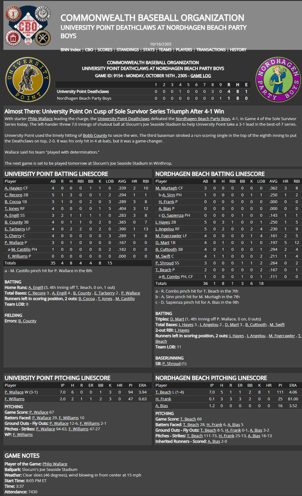 BNN Weekly Report This Week in the CBO, BMU, and GBRL by Nat Wright-Kawolski 12 October 2305 CBO Sole Survivor Series Preview NCA #2 Nordhagen Beach Party Boys (78-42) vs SCA #2 University Point Deathclaws (84-36) Season Series University Point 1, Nordhagen Beach 0 April 6 @UP: UP 6-1 In their sole game this season in just the third game of the season, the Deathclaws easily handled the Party Boys. Behind an impressive start by Wilson Beachball, University Point beat Nordhagen Beach, 6-1. Chase Southie earned save number 1 this season. The loss drops the Party Boys to 1-2. In the top of the eighth, Nordhagen Beach were in rally mode. The score was 4-1, University Point, with one out and runners on 1st and 2nd. But on a 1-1 pitch, Mike Swift flew out. Game 1 Lineups Nordhagen Beach Party Boys University Point Deathclaws Analysis This series marks a rematch of the 2302 season when the 4th-seeded Deathclaws from the South Charles Association upset the 1st-seeded and defending champions Party Boys, 4 games to 3. In that Sole Survivor Series, the Boys took a 2-0 lead at home and also won Game 4 at University Point to take a 3-1 series lead. However, the Claws won their final game at home and then Games 6 and 7 at Nordhagen Beach to clinch the series. This season, University Point is the favored team, having a six-game advantage over the Party Boys, including a victory in their sole matchup. In a stats versus stats comparison, the Claws have all the advantages, while the Boys get the overall pitching nod. On offense, the Deathclaws finished 1st in the SCA in runs scored (696), Average (.295), OBP (.374), OPS (.854), WAR (31.5), wOBA (.367), and Home Runs (186). For Nordhagen Beach, they were lower in every category but home runs. They finished 4th in the NCA in runs scored (600), 4th in Average (.267), 5th in OBP (.345), 4th in OPS (.802), 4th in WAR (22.2), 4th in wOBA (.346), and 2nd in Home Runs (195). For pitching, University Point was not as successful. They finished 4th in the SCA in runs allowed (507), 4th in Starters ERA (3.71), 5th in Bullpen ERA (4.40), 5th in FIP (4.22), 6th in WAR (17.1), and 5th in Strikeouts (728). The Party Boys were much better in every category, though they were not the best pitching staff in their association. They finished second in the NCA in runs allowed (446), Starters ERA (3.54), Bullpen ERA (3.42), FIP (3.99), WAR (20.6), and Strikeouts (817). Position vs Position - OSA Talent Ratings C - Swift vs Cherry - Adv: UP 1B - Mart vs Cocoa - Adv: UP 2B - Hayes vs Recore - Adv: NB 3B - Cuttooth vs Country - Adv: UP SS - Shroud vs Engill - Adv: UP LF - Fogcrawler vs Tarberry - Adv: NB CF - Murtagh vs Hayjen - Adv: UP RF - Angelou vs Jones - Adv: UP SP 1 - Nut vs Wallace - Adv: NB SP 2 - Church vs Bertha - Adv: UP SP 3 - Beach vs Beachball - Adv: NB CL - Kidd vs Williams - Adv: UP RP 1 - Whipple (SP) vs Walden - Adv: UP RP 2 - Frank vs Southie - Adv: UP Prediction Because the Party Boys' Association Championship series went longer than University Point's series, their pitching staff is not as rested, meaning that Nordhagen Beach is pitching their 3rd starter versus the Claws' ace. That tips the balance overall in University Point's favor. Our game-by-game prediction thus goes this way: Game 1 - UP Game 2 - NB Game 3 - UP Game 4 - UP Game 5 - NB Game 6 - UP We are predicting the Deathclaws to repeat their success against Nordhagen Beach in the Sole Survivor Series and win it all in six games.