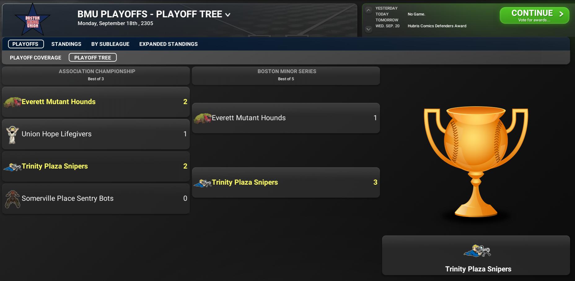 BNN Weekly Report This Week in the CBO, BMU, GBRL, and Youth Leagues by Nat Wright-Kawolski 18 October 2305 2305 Sole Survivor Series University Point Runs Away with 2305 Title The University Point Deathclaws are the 2305 champions, winning their second Sole Survivor Series, both over Nordhagen Beach, in five games. The Deathclaws had an answer for everything that the Party Boys threw at them and had their pitching step up in the SSS, holding the Party Boys to three total runs in three games at Nordhagen Beach. The Claws' first championship was in 2302 when they came into the playoffs as the fourth seed but was able to defeat the defending champion Boys in seven games. While Roxbury seemed to be the team to beat in the CBO, University Point sported the second-best regular season and lost only two games of 11 in the playoffs on their way to the championship. The Deathclaws swept Jamaica Plain in three games in the SCA Semifinals, beat the Egret Ninjas in five games in the SCA Association Championship, and then beat the Boys in five games in the Sole Survivor Series, sporting an 11-2 postseason record. Game 3: University Point 5 at Nordhagen Beach 2 Road Win Lifts University Point to 2-1 Lead in SSS Starter Wilson Beachball was sensational for the University Point Deathclaws in his team's 5-2 triumph over the Nordhagen Beach Party Boys in Game 3 of the Sole Survivor Series today. Beachball pitched well, but University Point picked up the win to take a 2-1 lead in the series. It could have been a different outcome for University Point, had it not been for Austin Engill, the 27-year old shortstop . Engill contributed a 2-run single in the top of the first inning to put University Point up, 2-0. Engill called the win the result of "everyone being in sync." The next game is set to be played tomorrow at Slocum's Joe Seaside Stadium in Winthrop. Game 4: University Point 4 at Nordhagen Beach 1 Almost There: University Point On Cusp of Sole Survivor Series Triumph After 4-1 Win With starter Phlip Wallace leading the charge, the University Point Deathclaws defeated the Nordhagen Beach Party Boys, 4-1, in Game 4 of the Sole Survivor Series today. The left-hander threw 7.0 innings of shutout ball at Slocum's Joe Seaside Stadium to help University Point take a 3-1 lead in the best-of-7 series. University Point used the timely hitting of Bobb County to seize the win. The third baseman stroked a run-scoring single in the top of the eighth inning to put the Deathclaws on top, 2-0. It was his only hit in 4 at-bats, but it was a game-changer. Wallace said his team "played with determination." The next game is set to be played tomorrow at Slocum's Joe Seaside Stadium in Winthrop. Game 5: University Point 6 at Nordhagen Beach 0 University Point Wins Sole Survivor Series! Sometimes the winner is the one who got the lucky bounces and the lucky calls, and sometimes the winner is just the one who played better. It was the latter case in 2305, as the University Point Deathclaws topped the Nordhagen Beach Party Boys 6-0 tonight at Slocum's Joe Seaside Stadium to win the Sole Survivor Series. It was the 2nd title in franchise history. Starter Tony Bertha and RP John Walden combined for the shutout. Bertha allowed six hits, walked three, and struck out three in 7.0 innings. Walden did not allow a hit and struck out four in the final two innings, earning the save since he entered the game with the Claws up 3-0. CF Aesed Hayjen had the best game offensively, going 3 for 4 with a walk, two runs scored, and a run batted in. Probable Nuka Hitter Award winner Barker Cocoa was just 1 for 5, but he hit a two-run double in the 5th inning and added an extra RBI for three in the game. "When you play for championships, you have to play better than the team in the other dugout. We did that in this series, and all year. Now we're the best team in baseball," said University Point second baseman Chris Recore, who was named series MVP. The Deathclaws took the series 4-1. The new titleholders completed the regular season with a first-place finish in the South Charles Association Minutemen League and an 84-36 record. University Point manager Woody Lumpkin grinned and nodded when asked to comment on Recore's words. "Chris said it best -- we played better than the other team," the skipper said. Hometown officials announced they were already planning a "grand celebration" for the winners in the days to come. Final Playoff Tree