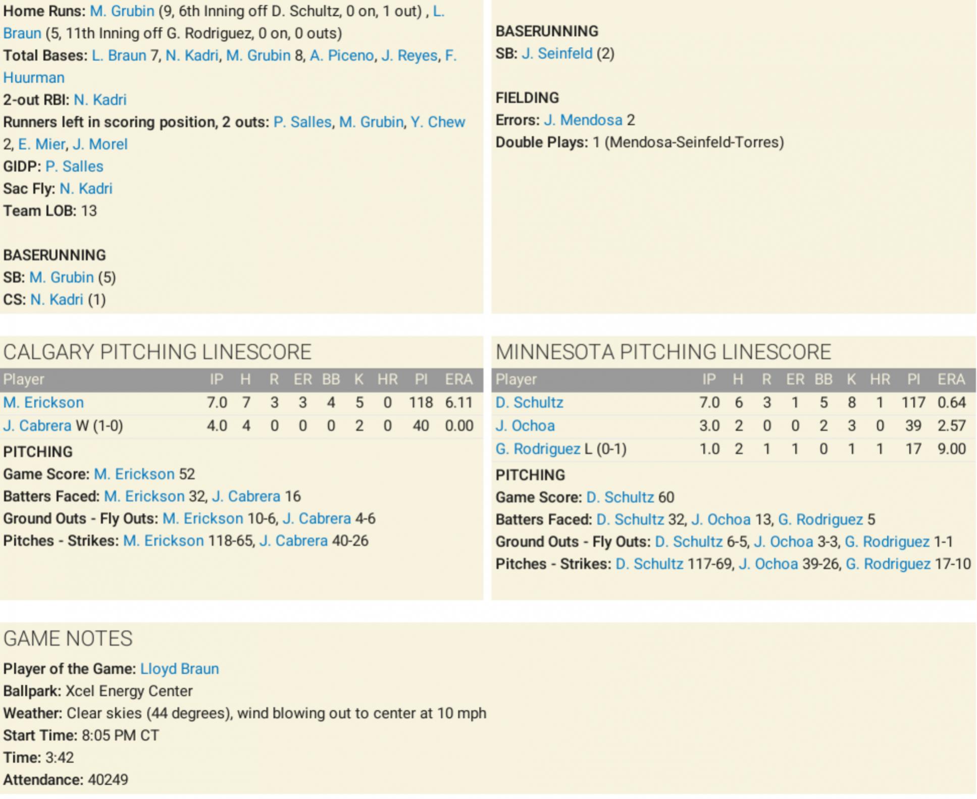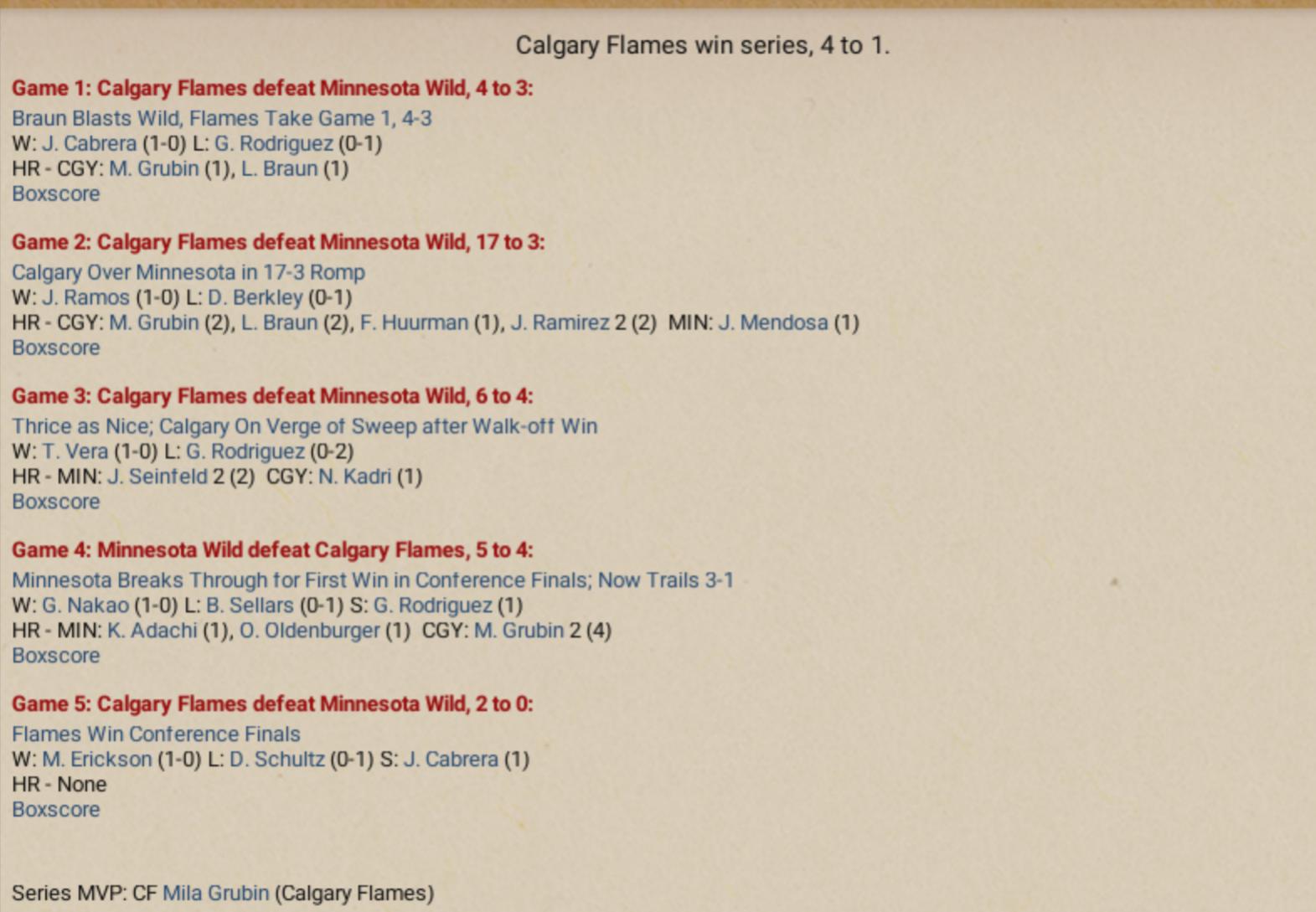 Bill: Dis week… de Minnesota Wilds… playin’ de Calgary Flames in de Western Conference Finals. Game One… went to… da Flames. Pat: Da Flames! Carl: Yeah, 4–3, in eleven innings. I tell ya, dat Lloyd Braun, dis guy’s 38 years old, built like a Polish sausage, and he still cranks one out in da 11th like it’s nuttin’. Bill: [nodding] He goes three for four, homer, double, two walks. He’s got more bases tonight than I got bratwursts sittin’ in front of me. Pat: [leans in] Dat’s a lotta bases. Carl: But hey, don’t forget M. Grubin — dis guy hits a homer in de sixth, two doubles late, and he’s stealin’ bases like Ditka stealin’ hearts. Pat: [dreamily] Ditka… Bill: [serious] If Ditka was in dis game, he woulda ended it in de third inning. Flames win 99–0. Carl: [correcting] No, no, no. Ditka against da Wild by himself? Ditka 12, Wild 3. Pat: Gentlemen… imagine dis… Ditka pitching to Ditka. Bill & Carl: [pause, then reverently] Ditka wins. Bill: Anyway, back to da game — Minnesota actually looked pretty good, eh? Mendosa had three hits, Kim had three hits, Oldenburger had a double, they just couldn’t push one more across. Carl: Yeah, and dat bullpen… Gabriel Rodriguez, poor guy gives up dat dinger to Braun. One pitch, boom, game over. Pat: So it’s Flames up 1–0 in de series. But let’s be honest… if da Wilds don’t figure out how to pitch to Braun and Grubin… dis thing’s over in four. Bill: Flames in four! Pat: Flames in four! Carl: Flames in four! Unless… unless… Ditka laces up skates, puts on da Wild sweater, den I say Wild in three. Bill & Pat: [together, crossing themselves] Amen. |