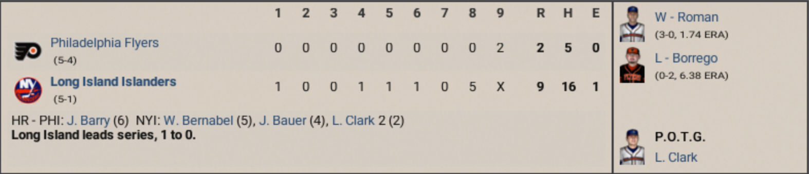 Gio: Yeah Booms, and it started out fine, right? Flyers put up four in the second inning, you’re thinking, “Hey, maybe they got somethin’ goin’.” Barry hits a homer, Gutierrez — the catcher, not the pitcher — hits a three-run bomb. They’re up 4–2. And then, ahhh… it all falls apart. Boomer: Completely fell apart. Vinny Hixson, three-run shot in the fourth, Adrie Sijtsma — and I love this kid, by the way, I love the way he plays — goes deep later, drives in three, scores three. He’s just everywhere. Gio: Yeah, and Pastor, the Islanders starter, he wasn’t even that sharp. Gives up four runs in the second inning. But the Phillies — excuse me, Flyers — couldn’t touch him after that. He ends up going seven-plus innings, keeps his team in it, and then the Islanders offense just explodes. Boomer: Explodes. Bossy with four hits, Bauer drives in two, Valenzuela has three hits, Bernabel steals a couple bases… they’re running wild. Sixteen runs on sixteen hits. It was a laugher by the fifth inning. Gio: And meanwhile, the Phillies — the Flyers, whatever — five hits total. That’s it. Nothing after the second inning. Completely dead. You can’t win playoff games like that. Boomer: And you know what this sets up now, Gio? Islanders in complete control. They go to Philly up 2–0, Wells Fargo Center’s gonna be loud, sure, but the Flyers better figure it out or this thing’s gonna be over quick. Gio: Yeah, and I just don’t see how they stop this lineup. I mean, Sijtsma, Bauer, Bossy, Valenzuela — it’s relentless. You can pitch around one guy, but the next guy’s gonna burn you. Boomer: Islanders win 16–4, total domination. Player of the game: Adrie Sijtsma. Flyers on the ropes. Gio: Flat out ugly. |