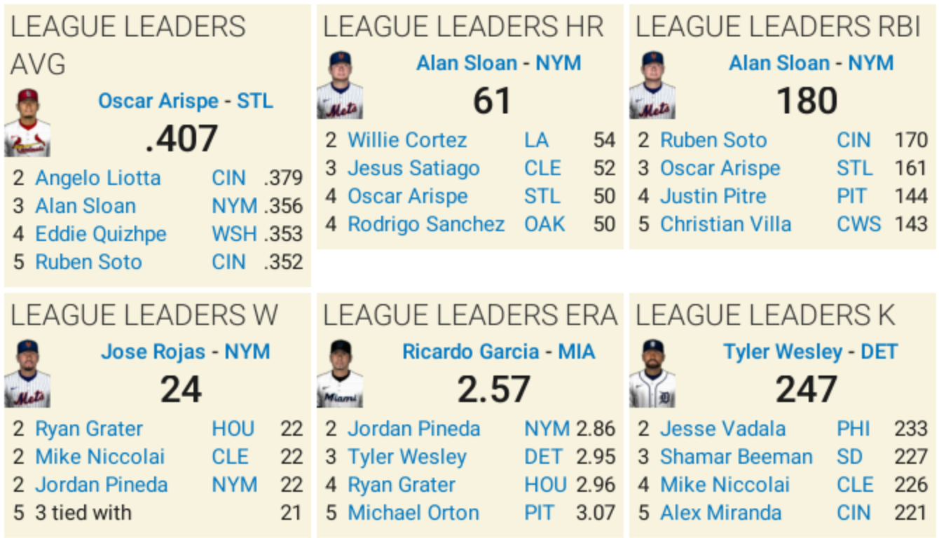 “Alright, let’s get to it here. Couple of things jump out at you right away. In the American League, the Indians — Cleveland — absolutely ran away with it. 113 wins, best record in baseball in the AL. That’s dominance, folks. The Yankees were terrific too, 101 wins, they cruise in the East, never challenged. And then in the West, Seattle edges out Texas by two games, Houston grabs a wild card spot at 87 wins. So your AL wild card: Houston vs. Texas, White Sox vs. Seattle. Lotta intrigue there. Now, over to the National League. And here’s the big story: the Mets. An historic season. 122 wins, .753 winning percentage — folks, that’s one of the greatest regular seasons you’ll ever see. They lapped the field, won the East by 44 games. In the Central, Milwaukee takes it by a game over Pittsburgh, with Cincinnati right there too. Out West, the Dodgers, steady as always, 97 wins, best in that division. So the wild card matchups line up: Cincinnati vs. Pittsburgh, Milwaukee vs. St. Louis. So, quick snapshot: Cleveland, Yankees, Seattle, Dodgers, Mets — your big dogs. The Mets the team to beat, Cleveland not far behind. Wild cards loaded with rivalry games: Texas and Houston, Cincy and Pittsburgh, Milwaukee and St. Louis. Classic baseball matchups. That’s your October, folks. Lotta juice here. Mets, Indians on a collision course, but ya gotta play the games.” |