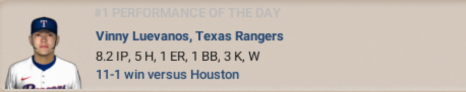 “On a crisp October afternoon in Arlington, the postseason began in earnest. And for the Texas Rangers, it could not have started more emphatically. In front of over 48,000 at Globe Life Field, the Rangers rode the right arm of Vinny Luevanos, who delivered not just a performance, but a statement. Eight and two-thirds innings, five hits, one lone run. His workmanlike 101-pitch effort was the anchor of the day. He wasn’t overpowering, but he was relentless. He made his pitches when he had to — and in October, that’s what matters. Meanwhile, the Texas bats provided all the margin anyone could have asked for. A seven-run first inning buried Houston almost before they had taken off their jackets in the dugout. Catcher Mike Walden was the star of the afternoon — four runs batted in, including a booming home run in the sixth that turned the game from comfortable to commanding. Add in a triple from Michael Petesch and a timely double by Tony Guerrero, and the Rangers’ lineup played like a team intent on staying awhile in October. For Houston, the story was grim. Starter Ryan Grater faced ten batters, retired just one, and left with seven runs already in. His ERA for the day — an astronomical 189.00 — tells the tale. The Astros, to their credit, steadied things afterward, but the damage was long since done. In the end, it was Texas 11, Houston 1. A rout, yes — but also a reminder of what playoff baseball so often provides: the chance for a previously unsung figure, like Vinny Luevanos, to seize the spotlight and etch his name, if only for a night, into the larger story of the game. The Rangers now stand one win away from advancing, and for the Astros, tomorrow brings not just another game, but the urgency of survival.” |