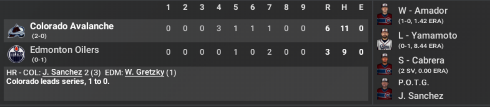 “GREAT SCOTT!! Ladies and gentlemen of the National Hockey League—wait a minute, this isn’t hockey—this is baseball in a hockey arena!! I’ve just witnessed a game of such titanic proportions, it could alter the very fabric of postseason reality as we know it!! Here at Rogers Place, on the historic date of September 23rd, 2006, the Colorado Avalanche have blasted the Edmonton Oilers right out of their own timeline with a 6 to 3 victory in Game 1 of the Conference Semifinals!!” 📈 SCORING SEQUENCE — LIKE CLOCKWORK, MARTY! “Nothing, NOTHING through the first three innings. It was as if time itself was frozen in the first act of the space-time continuum… but in the fourth inning—BAM! Sal Calixtro hits a double that sends the Avalanche into the future with a 1-0 lead! Then… oh, the fifth, sixth, and seventh innings became a temporal cascade—a chain reaction of runs! Colorado tallies SIX in total, like the DeLorean hitting 88 miles per hour!” 💥 JORGE SANCHEZ — PLAYER OF THE GAME “Now listen closely, Marty! Sanchez didn’t just play… HE DISRUPTED THE SPACE-TIME CONTINUUM of the Oilers’ pitching staff! Three hits, two home runs, one double, and ten total bases—TEN!! That kind of offensive output could power the flux capacitor for MONTHS!” ⚾ COLORADO ATTACK — 11 HITS, 6 RUNS, ZERO ERRORS MacKinnon getting on base like a well-oiled temporal conduit… Calixtro striking at the right moment… Okuhara sacrificing like a man who knows he’s altering history! Meanwhile, Sanchez—oh, Sanchez—launches missiles off Yamamoto and Kim that would leave temporal scorch marks in the right-field bleachers. 🧊 OILERS RESIST, BUT THE TIMELINE BUCKLES “W. Gretzky tries to restore order to the timeline with a towering home run in the seventh inning—Marty, I swear, it was like seeing the clock tower struck by lightning! But it’s too little, too late. The Avalanche’s pitching combination of Amador, Arevalo, and Cabrera clamps down like a chronal stabilizer.” 🧪 PITCHING NUMBERS—PRECISION ENGINEERING! “Amador—six and a third solid innings—117 pitches of pure chronal control—just one earned run. Cabrera seals the deal with two innings of shutout ball. Meanwhile, Yamamoto’s outing—oh dear—eight point four four ERA! That’ll send any pitching career spiraling into the temporal abyss!” ⏰ GAME LOG Start Time: 5:05 PM Mountain Time Duration: 3 hours, 27 minutes of space-time fireworks Attendance: 38,759 bewildered fans wondering what sport they’re even watching. Wind: Out to right field at 10 mph… almost like nature itself was helping Sanchez hit those bombs! 🔥 FINAL RESULT Colorado Avalanche 6 — Edmonton Oilers 3 Colorado leads the series 1-0. “Great Scott, Marty… if the Oilers don’t adjust their trajectory in Game 2, the Avalanche are going to rewrite this entire postseason. And trust me… YOU DON’T MESS WITH THE SPACE-TIME CONTINUUM!!” Cue dramatic lightning strike over the clock tower. ⚡️⏳ |