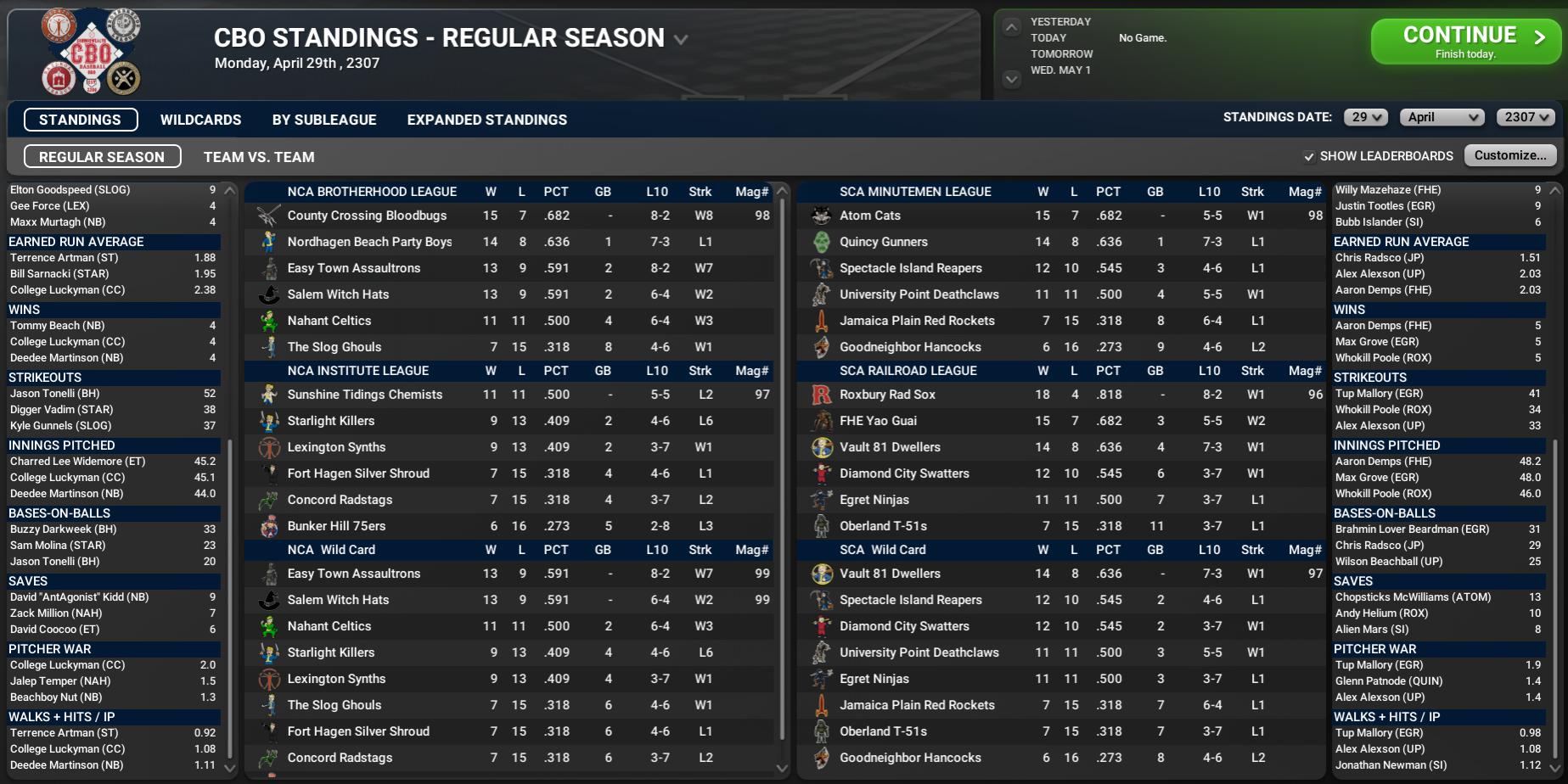 BNN Weekly Report This Week in the CBO, BMU, GBRL, and Youth Leagues by Nat Wright-Kawolski 13 May 2307 CBO Analysis We have seen this story before. Just a quarter of the season is through, and the Roxbury Rad Sox are dominating the league. At nine games up in their league and seven games up on the CBO, we are calling this one. No team can beat them regularly. Without a doubt, the Sox are #1. After going 9-1 in the past two weeks and currently on a six-game streak, Roxbury has been too hot to handle. The Rad Sox swept Goodneighbor (#21), won two of three over Vault 81 (#9), swept Atom (#3), and then swept Oberland (#23). Tied for the best record in the NCA and a 7-3 stretch in the last 10, the Easy Town Assaultrons are #2. The Assaultrons got swept at Bunker Hill (#16), swept Nahant (#19), swept Fort Hagen (#24), and then won two of three at County Crossing (#8). Still atop the Minutemen League despite a 5-5 mark in their last 10, the Atom Cats are #3. The Cats swept the Dwellers, won two at the Hancocks, got swept by the Sox, and then lost two of three versus Spectacle Island (#11). Nordhagen Beach is tied with the Assaultrons for the Brotherhood League lead and come in at #4 after going 6-4 the past two weeks. The Party Boys split with Lexington (#18), won two over the Bloodbugs, swept Concord (#20), and then won one at the Celtics. Salem is the third BL team in the Top 5 after going 6-4 in their last 10 and just one game back of the Trons and Boys. The Witch Hats split with the Silver Shroud, won two of three in a low-scoring series with The Slog (#22), split with Starlight (#12), and then won two of three at the Ghouls. Brotherhood League This one is fun! The four top teams are two games apart in their pursuit of the 2307 BL crown. Even though the Bloodbugs fell from first to fourth this cycle with a 3-7 stretch, all signs point to them being the favorites still. The strange thing for County Crossing is that their starting pitching unit is suddenly struggling, falling to 7th in the NCA in ERA (4.62). Bendy Barman (2-4, 7.61) has been the greatest perpetrator, but Gavin Eviritts (3-2, 4.44) and Whip Lashley (4-0, 4.42) have also been giving up lots of runs. The offense is still churning, including having four players--Babs Rooth (.314/14/28), Zeldolph Violet (.264/12/30), Cy Thompson (.323/11/27), and Any Why (.331/10/21)--already with double-digit home runs and all on pace to hit 40+. Institute League No team has been able to distinguish itself, but Sunshine Tidings took two of three over Starlight to tie for the league lead. Bunker Hill went 8-2 to trail only Roxbury in the last two weeks. That puts the 75ers only four games back, and there could be chances for them to make a move to the top. If the pitching could improve for the 75ers, they could be true competitors. Currently 11th in runs allowed (181), every starter outside Jason Tonelli (3-2, 3.33) has an ERA above 5.00. CL Danny Rocketman (7 SV, 6.14) has also struggled. Minutemen League This league is almost as much fun as the BL. With four teams all within three games of each other, the league race could be a tight one. While University Point is the most talented team, they are not the healthiest, which allows all of Atom, Quincy, and Spectacle Island to stay above them. One team we have not talked about is the Gunners. While not great in any unit, they are 1st in OBP (.376), which has helped them to rank 4th in runs scored (177). Just a couple of other team statistics stand out, including being 13-4 at home and 14-6 in games with a RHP starting. Outside of Ben Pettinato (.328/6/26), the Gunners have quite a few left-handed batters, which has helped them in an RHP-heavy league. Railroad League If we ignore Roxbury for a minute, the race for 2nd place is just as exciting as the other leagues. Vault 81 is in 2nd, but 5th-place Diamond City only trails by two games. However, the Dwellers also got bad news with star Harry Byrd breaking his leg, which will keep him out until around July 1. Diamond City and FHE both had strong starts but have begun to fade, including the Yao Guai going 2-8 in their last 10. While the offense has produced, the pitching has struggled throughout, currently 11th in runs allowed (172). SP Aaron Demps (5-1, 2.67) has been the one jewel in the rotation. CBO Standings CBO Power Rankings CBO Players of the Week May 6 - Donny Kowalski of Bunker Hill was a smashing success this week, winning the Player of the Week Award in the North Charles Association. He hit everything the pitchers threw at him, hammering them for a .588 batting average, going 10 for 17 with 4 home runs, 10 RBIs and scoring 9 times. In his stats this season, Kowalski has posted a batting average of .318 with 28 hits in 88 at-bats, 8 home runs and 20 RBIs. He has also scored 15 runs, walked 10 times and compiled a .394 OBP. There's no arguing that 35-year-old Bill Chaney has paid his dues and this this week he collected. The University Point Deathclaws right fielder had one of the best weeks of his career and captured the South Charles Association Player of the Week trophy. He hit .571 while collecting 8 hits in 14 at-bats, 3 home runs, 6 RBIs and 4 runs scored. Thus far this season Chaney is hitting .288 with 7 home runs, 20 RBIs and 13 runs scored. He has 19 hits in 66 at-bats and has played in 23 games. May 13 - His hard work and hustle paid off this week. The hard-working and hard-playing Lannie Tykeson was rewarded with the North Charles Association Player of the Week honors. The scrappy Easy Town Assaultrons first baseman hit .450 while collecting 9 hits in 20 at-bats, 5 home runs and 13 RBIs. Tykeson is hitting .336 for the season with 14 home runs, 34 RBIs and 27 runs scored. He has 41 hits in 122 at-bats and played in 32 games. Ben Pawlak is respected by most Roxbury Rad Sox fans for his no-frills style of play. The 30-year-old center fielder went about his business with vigor last week to grab the South Charles Association Player o