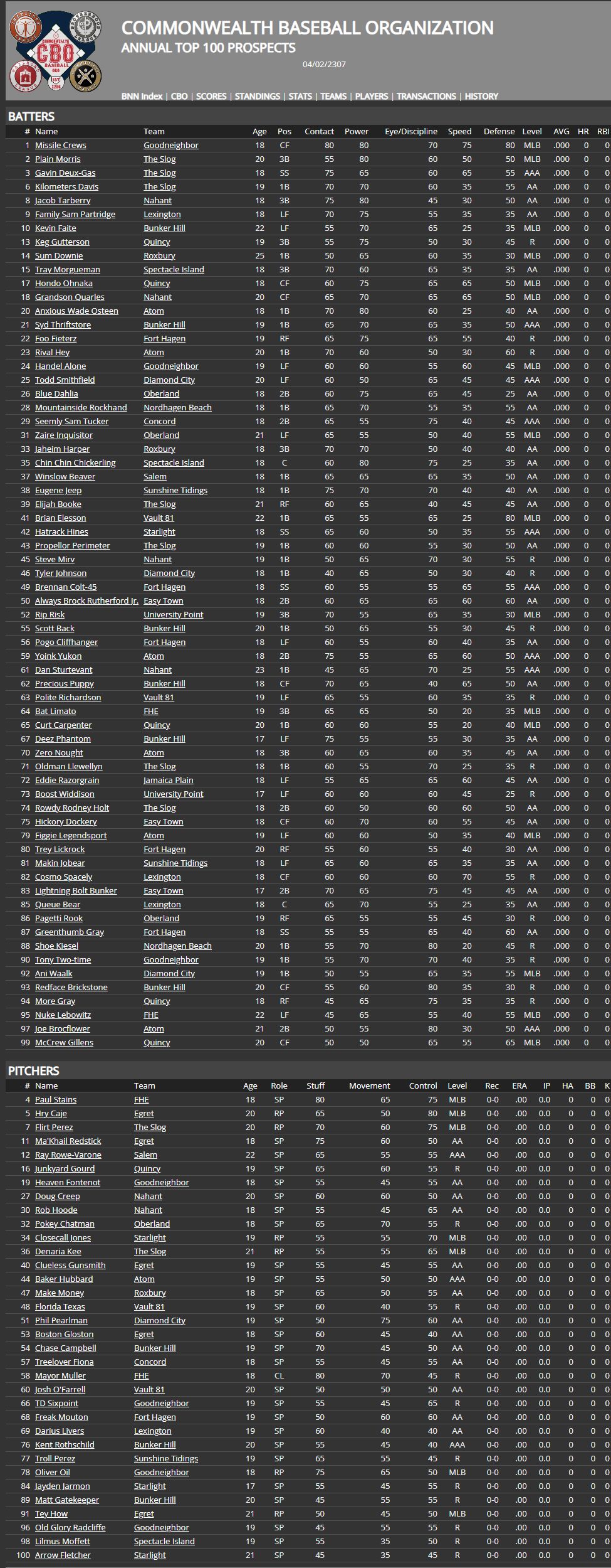 BNN Report News from the CBO, MML, BMU, GBRL, and Youth Leagues by Nat Wright-Kawolski 2 April 2307 The April Super Post CBO Predictions PAM has spoken and the 2307 season looks to have slight changes in the playoff teams, and a lot more competitive league overall. In the end, PAM predicts a repeat of the Sole Survivor Series of County Crossing and Roxbury. Based on overall power, it appears that PAM believes the Rad Sox to be the CBO's top team. In the NCA, PAM has a tight race between the top two teams in the Brotherhood League, the Bloodbugs and Nordhagen Beach. Easy Town is still at a playoff level but expected to finish 10 games back of County Crossing. PAM again expects Sunshine Tidings to run away with the Institute League, finishing eight games ahead of second-place Bunker Hill. The playoff seedings are expected to be: 1. County Crossing 2. Sunshine Tidings 3. Nordhagen Beach 4. Bunker Hill 5. Easy Town RF Babs Rooth and SP Beachboy Nut are again expected to take the top hitter and pitcher awards. Other competitors as top hitter include 1B Zeldolph Violet (CC), RF Jonathan Angelou (NB), and SS Cy Thompson (CC). Other competitors for top pitcher include SP College Luckyman (CC), SP Gavin Eviritts (CC), and SP Tommy Beach (NB). In the SCA, both University Point and the Sox are expected to win their leagues with the same record, though the power potential favors Roxbury. In the Minutemen League, Jamaica Plain is the only team expected to compete with the Deathclaws, though PAM expects them to finish six games back. In the Railroad League, the Rad Sox are expected to with the league by seven games over Oberland, which is picked to make it to the playoffs in 2307 after an eight-year absence. The playoff seedings are expected to be: 1. Roxbury 2. University Point 3. Jamaica Plain 4. Oberland 5. Vault 81 Without surprise, 1B Barker Cocoa of University Point and SP Nuke Laloosh of Roxbury are the picks to win the top awards. Other competitors for the hitting award are 2B Diamond Ball (SI), CF Aesed Hayjen (UP), and CF Stu Gains (V81). Other competitors for the pitching award are SP Mesquite Williams (Obe), SP Derek Green (JP), and SP Dobbie Radoncis (SI). CBO Top Systems and Prospects The Slog looks to be a future juggernaut with four of its top prospects in the Top 10 featured below. Other top systems include Nahant, Goodneighbor, Egret, Bunker Hill, and Quincy. The bottom three systems are County Crossing (zero Top 100 prospects), Jamaica Plain (one Top 100 prospect), and University Point (two Top 100 prospects). The CBO had one of its strongest classes ever in the 2306 Rookie Draft, and those players are reflected in the top prospects list. Let's take a look at the Top 10 players going into 2307 and where they are starting the season. 1. CF Missile Crews, Goodneighbor - The #1 overall pick out of West Quincy of the BYDL, Crews is expected to start the season with the CBO club since the Hancocks have such a talent deficiency. Whether or not that is good for Crews' development, we do not know, but we do know he is a high talent. Based on OSA predictions, he has the capability of being the top rookie with a .300/.373/.602 prediction line in his first season. If he starts out slowly, the Hancocks could send him down to break his slump. 2. 3B Plain Morris, The Slog - Morris was a case where he missed the application deadline for the 2302 Rookie Draft since he was in a military educational program that finished in February. After he was completed, he was able to sign as an undrafted free agent, in which The Slog secured his services. In four professional seasons, Morris has six GBRL career records, including being the top home run leader (129), 42 better than the second-best mark. Morris is expected to debut with the Ghouls in 2307 and is scheduled to start at 3B and hit cleanup. 3. SS Gavin Deux-Gas, The Slog - The second-overall pick in the 2306 Rookie Draft, Deux-Gas is expected to start with the MML's Burlington Ferals as the starting SS and bat second in the order. Should he thrive, he could later join Morris on the CBO squad. 4. SP Paul Stains, FHE - The 4th-overall pick in the 2306 Rookie Draft, Stains may be an elite pitcher. He is already CBO-ready, though he would be better placed in the bullpen to start. Granted a fifth year of BYDL eligibility after suffering an injury, Stains recorded BYDL career bests in wins (48), complete games (21), shutouts (6), innings pitched (579.0), strikeouts (786), and WAR (23.25). OSA scouts predict that he can elicit a 3.49 ERA with 255 Ks in 232.0 IP. FHE would take that his rookie season. 5. SP Hry Caje, Egret - The 2nd-overall pick in the 2303 Rookie Draft, Caje has been developing slowly. Now 20, the Ninjas are ready for him to start with the CBO club, though he is expected to be relegated to the bullpen this season, which could be a make-or-break time. In two seasons in the GBRL, he posted just a 12-10 record with a 4.74 ERA. OSA scouts have him with a 5.55 expected ERA with Egret this season. 6. 1B Kilometers Davis, The Slog - The Slog's 4th-overall pick in the 2304 Rookie Draft, Davis was traded to Vault 81 and later back to the Ghouls. He is expected to start the 2307 season with the BMU's Mass Pike Radroaches. Last season with Vault 81's Covenant Refractors, he batted .228 in 46 starts (48 total games played) with 11 home runs and 30 RBI. Another player in the Top 10 with a slow development, Davis may one day be one of the CBO's premier power hitters. 7. SP Flirt Perez, The Slog - The fourth Ghoul in the Top 7, Perez came to The Slog in the same trade that sent Davis back to the squad for outstanding CF Stu Gains. Perez was the Dwellers' 20th-overall pick in the 2304 Rooke Draft. Like Caje, Perez is expected to be on the CBO roster but will not be a starter to start is CBO career. Last season with two BMU teams, Perez was 8-6 with a 4.12 ERA in 22 total starts. He could be sent back to the MML if he struggles out of the bullpen. OSA scouts