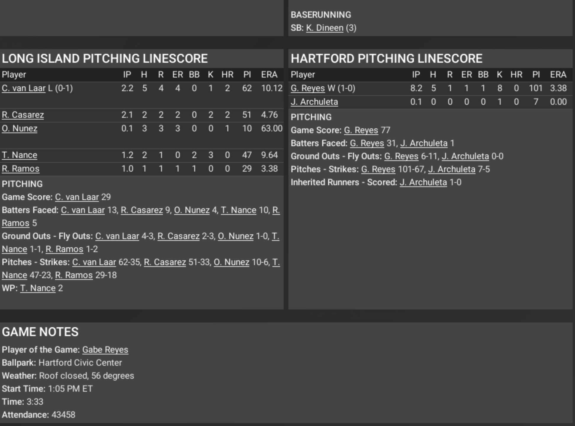 2006 “Good evening, everybody. What a night it was in Hartford, Connecticut… history has been made at the Civic Center.” On a crisp October night, the Hartford Whalers delivered a performance for the ages — and they did it against the defending Stanley Cup champions. Final score: Hartford 11, Long Island Islanders 1. In Game 7 of the Conference Semifinals, the Whalers didn’t just win — they dominated. From the opening frame, Hartford took command. A first-inning burst, highlighted by Mike Zuke’s booming double, set the tone. And from there, it was relentless. Three more in the third. Two in the fifth. Three in the sixth. They piled on, inning after inning, never looking back. And what a night for Zuke. Four hits, including a home run and two doubles, driving in two and scoring twice. It capped off a postseason series where he batted a staggering .656 with 16 RBIs. That’s MVP-caliber, and tonight, he was officially named the series Most Valuable Player. Gabe Reyes, meanwhile, was lights out on the mound. 8 and 2/3 innings, just one run allowed, eight strikeouts, and he had that look of complete control. No moment too big. No stage too bright. His Game 7 performance was everything a club could hope for from its ace. Long Island, to their credit, came in battle-tested, but they never found their footing tonight. Their lone run came in the fourth inning. Beyond that, they were overwhelmed by Hartford’s pitching and outslugged by Hartford’s lineup. This was not the same Islanders team that hoisted the Cup a year ago — and Hartford made sure of it. For the first time in franchise history, the Whalers advance to the Conference Finals. The fans here in Hartford — over 43,000 of them — stayed on their feet to the very last out, savoring every pitch, every swing. And their reward? A matchup with the New York Rangers, who swept the Montreal Canadiens. A new chapter begins… and if tonight was any indication, Hartford will not be intimidated. “This is why you play the game. Moments like this. For the Whalers, a night to remember.” Final: Whalers 11, Islanders 1. Hartford takes the series, four games to three, and moves on to the Conference Finals. |
