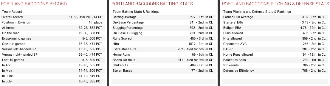 The parade of crummy opposition continued, with no sign of the Raccoons stopping their own crumminess either. Charlotte was eighth in runs scored and ninth in runs allowed. Like the Raccoons, they basically had no bullpen to lean on. Maybe they were not quite as surprised by that fact than the Raccoons… They had a 2-1 lead in the season series. Projected matchups: Drew Johnson (5-4, 3.82 ERA) vs. Keith Black (4-7, 3.14 ERA) Bryce Sparkes (4-7, 3.31 ERA) vs. Jose de Lucio (5-2, 3.96 ERA) Ryan Bedrosian (7-2, 3.82 ERA) vs. Rafael Pedraza (7-6, 3.87 ERA) All right-handers here, as we’d dance around lefty sod Jose Lerma (1-9, 4.00 ERA). Game 1 CHA: 2B O. Aguirre – CF Aarhus – SS Aparicio – C M. Cook – 3B Farfan – LF Esperanza – RF Salto – 1B Blades – P Black POR: 3B Ramos – 2B Trevino – CF Hooge – RF Greenway – 1B Anderson – C Kilmer – LF Ledford – SS Williams – P Johnson Johnson walked the first two batters, with Oscar Aguirre and Greg Aarhus both coming around to score thanks to singles hit by Mitch Cook and Jose Farfan. The Raccoons would have Berto on base to start the bottom 1st, with Cosmo forcing him out, but stealing second base. Ed Hooge dropped a single, and Greenway dropped the inning by hitting into a 4-6-3. Next the Raccoons dropped Elijah Williams, tweaking an oblique on a defensive play. Jon Caskey took over for him, and Dr. Padilla sent word that the DL beckoned for Williams. Oliver Anderson reached on a leadoff walk in the bottom 2nd, then was doubled up by Kilmer, and things were just that – bleak. The Falcons tacked on a run in the fourth on a Brett Blades homer, then got a free runner in Oscar Aguirre in the fifth when Hooge dropped his fly in shallow center. Johnson walked Tony Aparicio, Mitch Cook slapped an RBI single up the middle, and things were just that – spiralling out of control. And bleak. Ruben Esperanza’s 2-out, 3-run homer to right was a no-doubter both in being outta here by itself, and for ending the game as a contest, ramping the Falcons’ lead to 7-0. The entire 4-spot in the fifth was unearned, but deserved it sure was. Francisco Pena was pummeled for two more runs in the sixth, surrendering sharp hits to Black for a single and Aguirre and Aparicio for extra bases each time. The following inning Pena walked a pair before giving up 2-out RBI singles to both Black (…) and Aguirre. There was a run off David Fernandez in the ninth, like anyone cared anymore. 12-1 Falcons. Caskey 2-3; Maldonado (PH) 1-1, 2B; Trevino stole two bags and doubled in a run that was entirely for the *** in the eighth. Everybody else was pretty much dead from the waist up. Somehow, Jose Farfan (.305, 6 HR, 41 RBI) did not get a hit in the riot that was Monday’s 11-run blowout. His hitting streak ended with an 0-for-5 at 21 games. Roster moves: Elijah Williams went on the DL with an oblique strain, but might only need two weeks, maybe. Or it might be terminal. I’m taking no assurances anymore. He exchanged places with Joel Hernandez, who came off the DL for Tuesday. Also, Pena (7.71 ERA) was banished back to AAA. The Raccoons took the next muppet in line, which happened to be Jared Ottinger and his 5.30 ERA in St. Pete. Game 2 CHA: 2B O. Aguirre – CF Aarhus – SS Aparicio – C M. Cook – 3B Farfan – LF Salto – RF C. Robinson – 1B Blades – P de Lucio POR: 3B Ramos – SS Caskey – 2B Trevino – RF Greenway – 1B Anderson – CF M. Fernandez – LF Ledford – C Morales – P Sparkes Chris Robinson’s ball off the wall for a 2-out double gave the Falcons a 1-0 lead in the second, plating Mitch Cook from third base. The Raccoons tied the game back up in their half of the frame, with Brad Ledford zipping a 2-out double and coming around on a Tony Morales bloop near the leftfield line, but far enough away from Graciano Salto. It was a COONS LEAD in the bottom 3rd with Berto on, stealing second, and coming around on Caskey’s single. Cosmo also singled, but Greenway’s fly to center was caught by Aarhus near the warning track. Oliver Anderson hit an RBI single instead. Up 3-1, Manny Fernandez had runners on the corners while being quagmire in a 2-for-23 streak, and of course found his way into a 1-6-3 double play, ending the frame. The following inning the Raccoons were on the corners again with Ledford and Berto, when the latter took off for second and was thrown out with Caskey at the plate, ending this chance for good, and the fifth saw the Falcons tie the game with an Aguirre leadoff walk, an Aarhus single, and thanks to an errant Greenway throw, two groundouts were enough to tie the game after that… Greenway grounded out on a 3-0 pitch in the bottom 5th to make the entire experience even more wholesome. Sparkes held the fort for seven innings, whiffing eight, then was hit for with Ed Hooge to lead off the bottom 7th. Hoogey grounded out before de Lucio walked Berto and allowed a single to Caskey. Cosmo came through with a gap double in right-center, but Aarhus cut the ball off ahead of the warning track, stopping Caskey at third base, but Berto scored for a 4-3 lead. The Falcons were still scared of Troy Greenway for some reason and walked him onto the open base, bringing up Anderson with three on and one down. He popped out foul in a full count, and Fernandez flew out to center, stranding three. Top 8th, Prieto retired three in a row for something new, and Campbell struck out three in the ninth, even though Paul Vespucci singled with two outs. 4-3 Coons. Ramos 2-3, 2 BB; Caskey 2-5, RBI; Trevino 3-4, 2 2B, RBI; Ledford 2-4, 2 2B; Morales 2-4, RBI; Sparkes 7.0 IP, 6 H, 3 R, 3 ER, 1 BB, 8 K, W (5-7); Game 3 CHA: 2B O. Aguirre – RF J. Aguilar – SS Aparicio – C M. Cook – 3B Farfan – LF Salto – CF Aarhus – 1B Blades – P Pedraza POR: 3B Ramos – SS Caskey – 2B Trevino – RF Greenway – LF Ledford – CF M. Fernandez – 1B Monge – C Morales – P Bedrosian Manny Fernandez drove in the rubber game