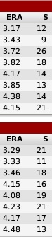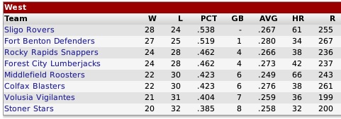 Monday, June 1, 2037 TIGHT RACE IN RU WEST, SLIGO SLIGHT LEAD The Ruthlandian West Division is one of the weaker divisions in the IPA, but it is always pretty competitive within... this year only the top two clubs have winning records... the Sligo Rovers have a one-game edge over preseason pick Fort Benton... in third place trailing by 4 games are Rocky Rapids and Forest City... last year's winner Colfax is tied with Middlefield for fifth and is 6 games out of first... even seventh place Volusia and last place Stoner are within striking distance and are only 8 games off the pace. A two-team race was forecast and that's pretty much what's happening... only Sligo (28-24) and Fort Benton look like they will have winning seasons... Sligo had a solid May with a 16-12 mark to move up to first place ahead of Fort Benton, who slumped to 13-15... the Rovers are just an average team in the Ruthlandian Union, but they can score fairly well (11th) and have a little firepower with 61 HRs (6th)... Randall Steele (6-5/3.69) and Tom Pierson (4-3/3.95) are pretty good starters... newcomer Jeff Cooper (3-5/5.25) has been a disappointment... he has to have a good second half for the Rovers to win... Sligo has no big-time bats... the best ones are Denny Simmons (.304), Neil Mitchell (.302), Peder Svensson (.287) and Vasco Aguilar (.301). The Fort Benton Defenders (27-25) have good stats, but they don't convert into a good record... they are batting a strong .280 (2nd) with 267 runs (6th), but have no power with only 34 HRs (31st)... the pitching is quite respectable with a 3.42 ERA (6th)... the Defenders have three quality starters in Tommy Baylor (8-3/2.59), Augie Marquis (6-3/2.75) and Jordy Raeburn (5-7/3.18)... the top run producers are D. D. Badeaux (.344), Mitch Hamilton (.349) and Hunter Glenholmes (.333)... Fort Benton gets the nod in the pennant hunt because of its good starters... the RU West winner will not get very far in the postseason. The Rocky Rapids Snappers (24-28) are tied for third with Forest City... the Snappers played poorly in the first month of the season, but did fairly well with a 15-13 May... they are not really a very good team... mediocrity abounds... Randy McKenzie (5-5/3.47) and Randy Peters (3-3/2.96) are the most reliable starters... Joe Hughes is the best hitter with a .336 BA and 6 HRs... Crusher Derringer tops the club in RBIs with 33 and 6 HRs, while hitting .261. The Forest City Lumberjacks (24-28) hit for average with a .273 BA (9th), but are just run-of-the-mill otherwise... Ted Dancer (4-1/3.33) leads the pitchers... in the batter's box the top bats are Bob Brisdon (.333), Ronnie Pollet (.324), Pistol Pete Picard (.310) and Hal Burton (.289). Defending division champ Colfax (22-30) and Middlefield are deadlocked in fourth place, six games behind... the Blasters got a bad 8-16 start in April, but they perked up a bit with a 14-14 mark in May... they have a decent offense with a .276 BA (5th) and 261 runs (8th), but possess poor pitching with a 4.28 ERA (25th)... offensive leaders are Chet Penn, who is third in the IPA with a .399 BA... Penn was named the RU Player of the Month for hitting .516 with 5 HRs and 31 RBIs for May... other impressive bats are Gerry Sives (.356) and Kristian McEly (.316)... Randell Perkins leads the staff with an 8-5 record and has posted a 3.86 ERA. The Middlefield Roosters (22-30) haven't fared well in the early going... after a poor April, the Roosters were only 12-16 in May... the offense is lackluster and the pitching is lousy... Brad Alexander (.295) leads the club with 14 HRs and 48 RBIs, while Tony Parsons is tops with a .320 BA and 44 runs... the best pitcher is Larry Wheelhouse (5-8/3.81)... all the other starters are over the 5.00 ERA mark. The Volusia Vigilantes (21-31) are in seventh place, seven games back of first place Sligo... not a lot of talent on the V's... the best of the lot is pitcher Hector Vargas (6-3/1.81), along with LF Felipe Henriques (.305) and 1B Glenn Childress (.295). In last place are the Stoner Stars (20-32)... they are 8 games back... the Stars suffer on the mound and are even worse at the plate... they have compiled a 4.03 ERA and are near the bottom in scoring (30th)... Larry Urban (4-3/3.31) and Mel Glosterman (3-3/3.00) are the only productive pitchers... and CF Don Cain (.327) and C Barry Swindell (.339) are the best batters. Last edited by Eugene Church; 06-04-2013 at 09:23 PM. |